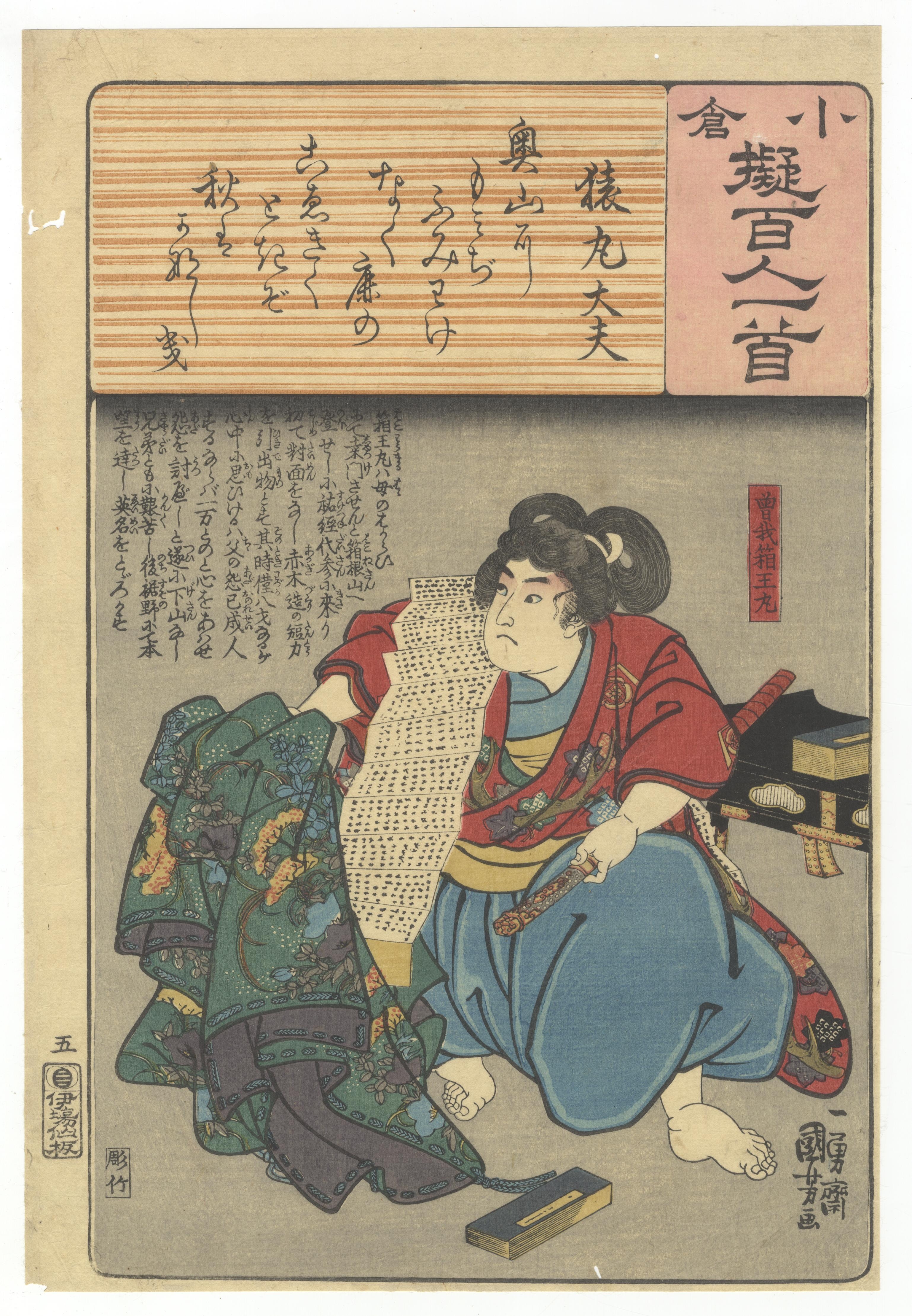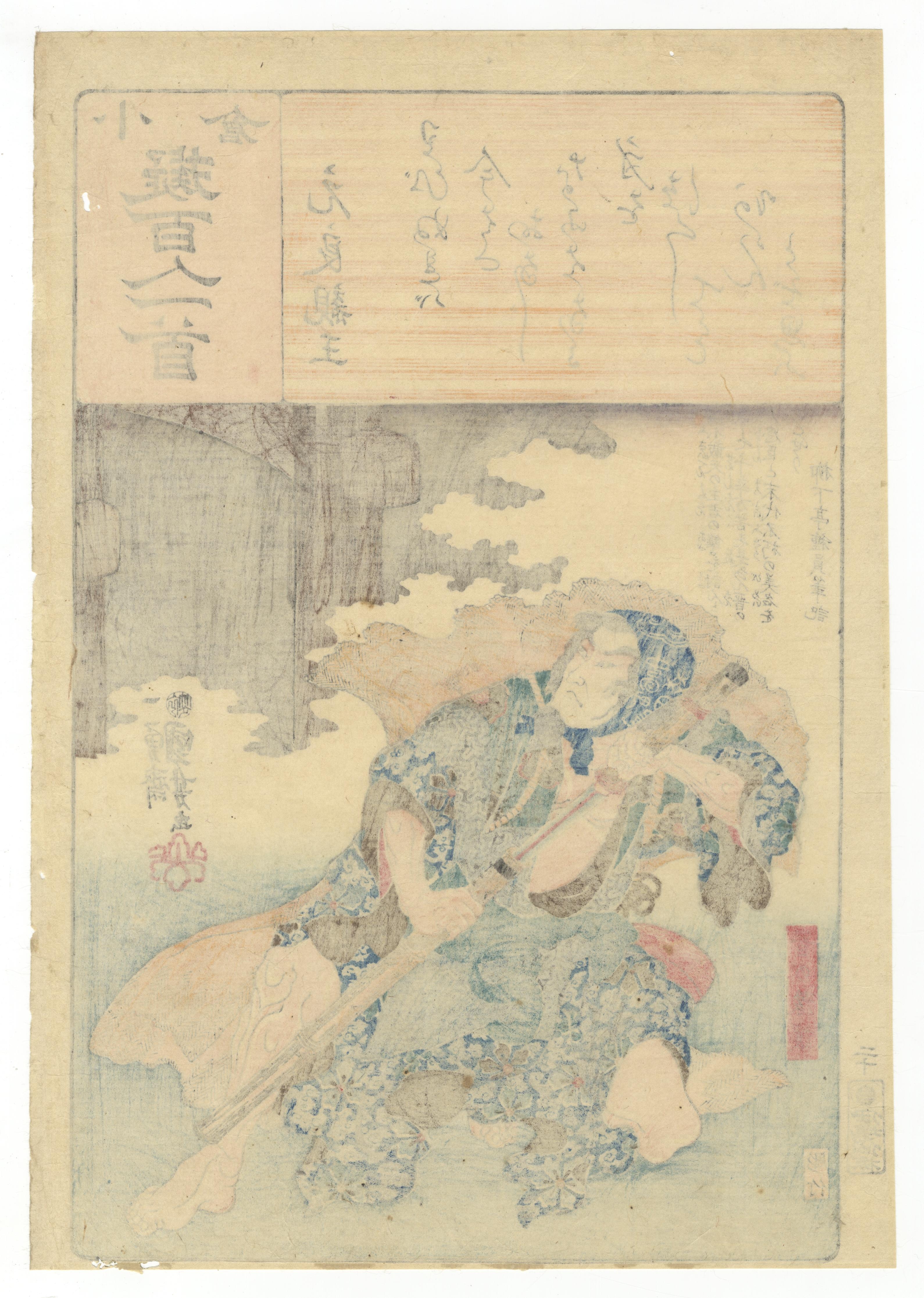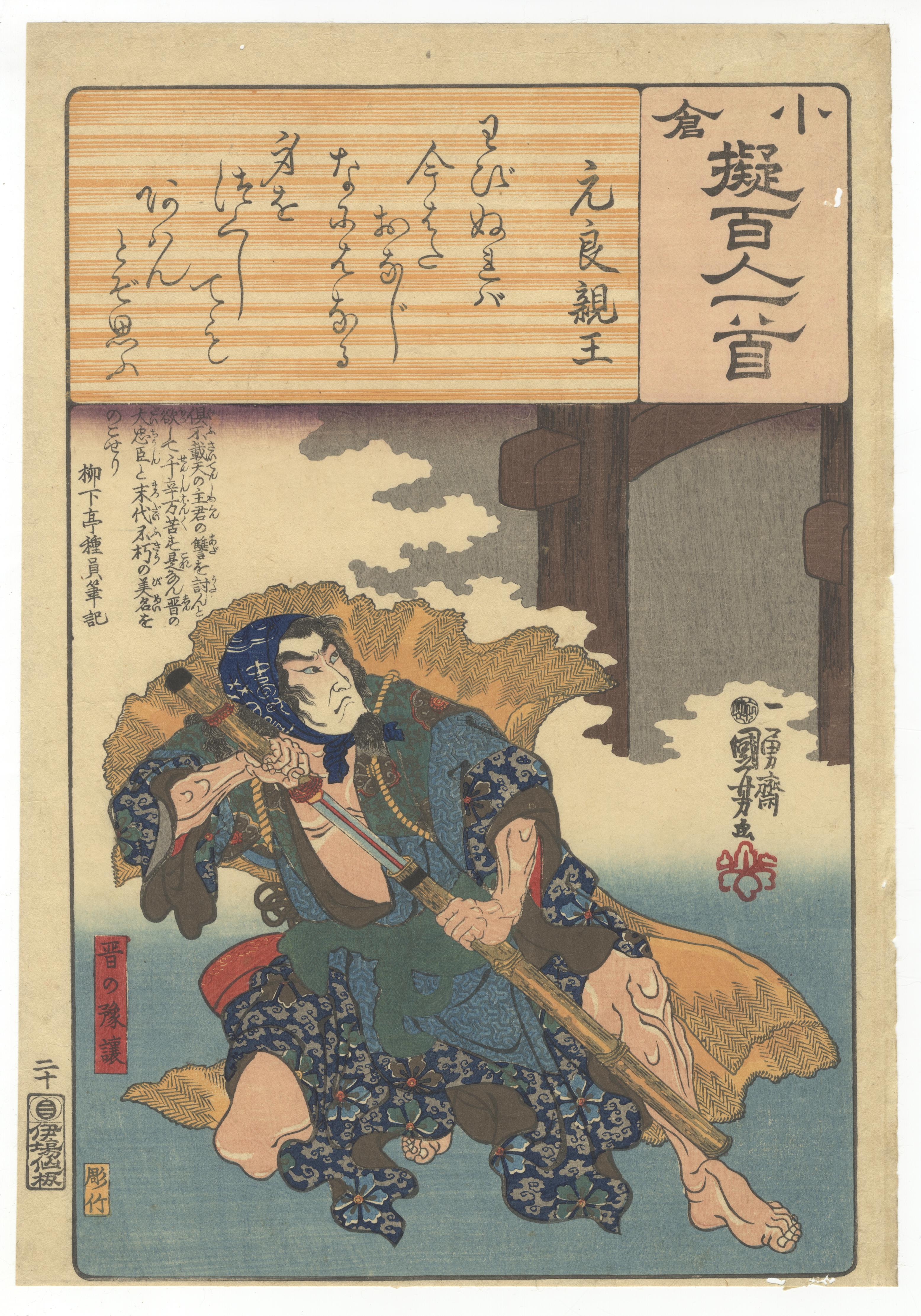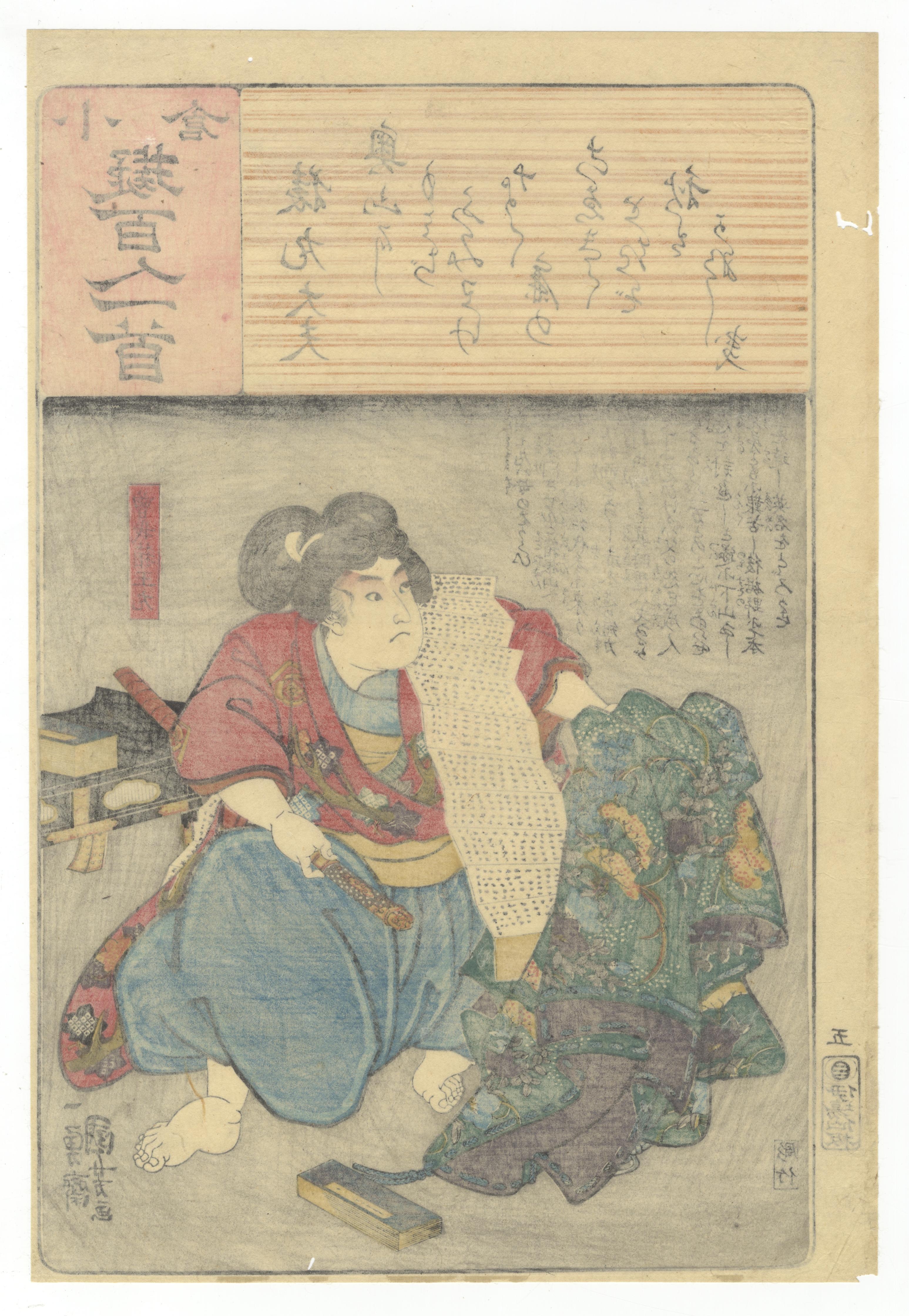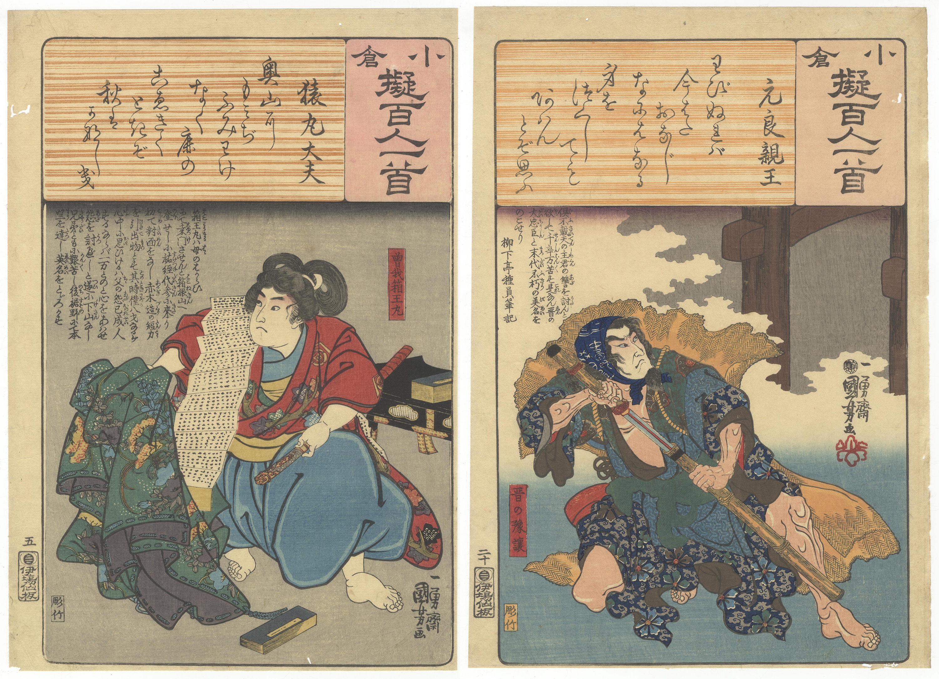 A pair of Japanese polychrome ukiyo-e woodblock prints on paper, attributed to Yoshitake and Toyokuni, from the ‘小倉百人一首’ (Ogura Hyakunin Isshu) series, consistent with late Edo or early Meiji period production. The left print depicts a seated female figure identified as ‘奥山大夫’ (Okuyama Tayū) holding a scroll. The right print illustrates a dynamic male figure, ‘元良親王’ (Motoyoshi Shinno), grasping a staff. Both prints share a common design element at the top, a horizontal woodgrain-effect cartouche bearing the series title ‘小倉百人一首’ (Ogura Hyakunin Isshu) and calligraphic Japanese text. Further visible text includes artist signatures ‘豊國畫’ (Toyokuni ga) and ‘芳竹’ (Yoshitake), along with various publisher, censor, and date seals, such as ‘喜升亭’ and ‘柳亭種彦記’.