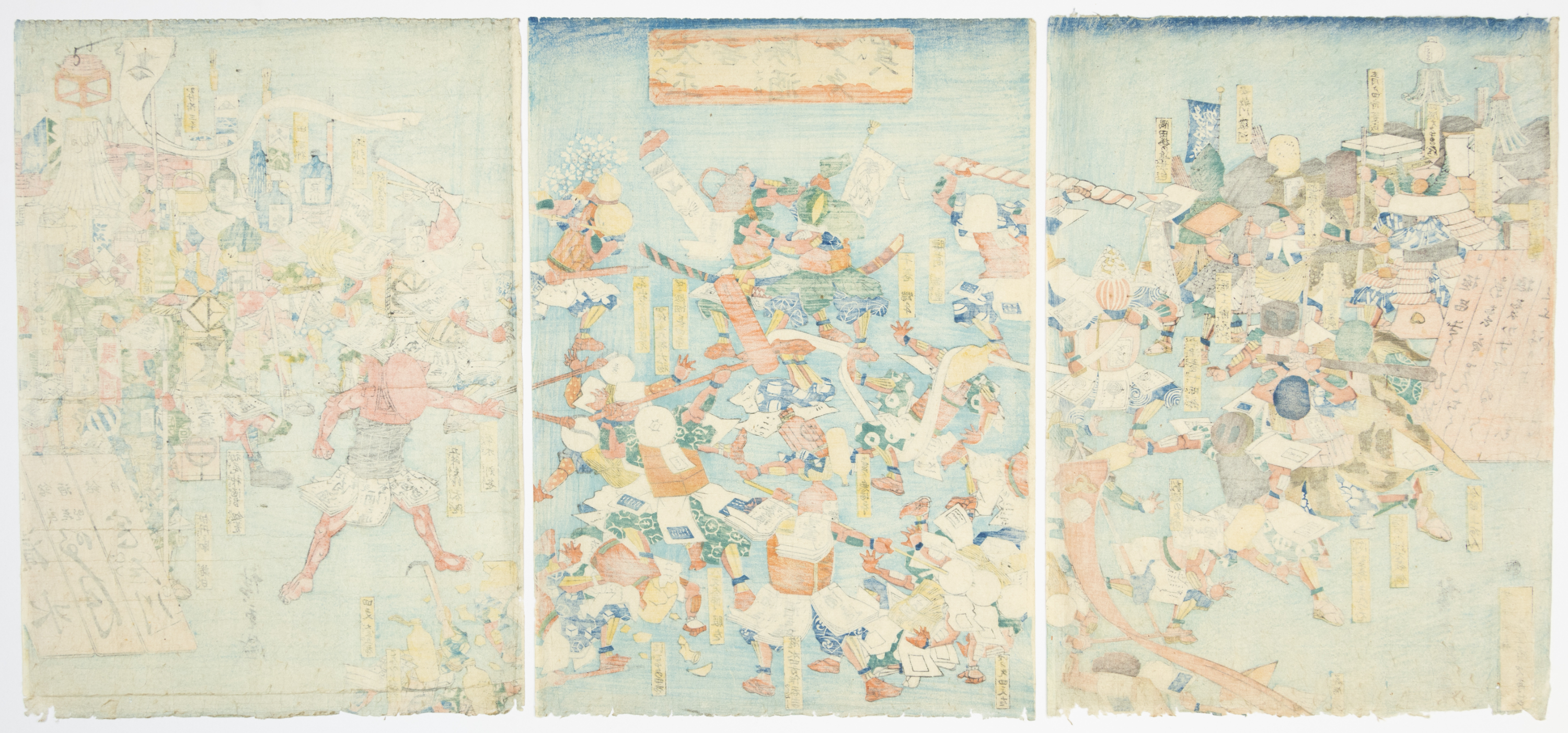 A Japanese woodblock print triptych, executed in the Ukiyo-e style, composed of three separate panels. The artwork depicts a dense and dynamic scene populated by numerous stylized figures. It is printed on paper and features extensive Japanese script, including large characters within a rectangular cartouche at the top of the central panel, and various smaller inscriptions or seals distributed across all three panels.