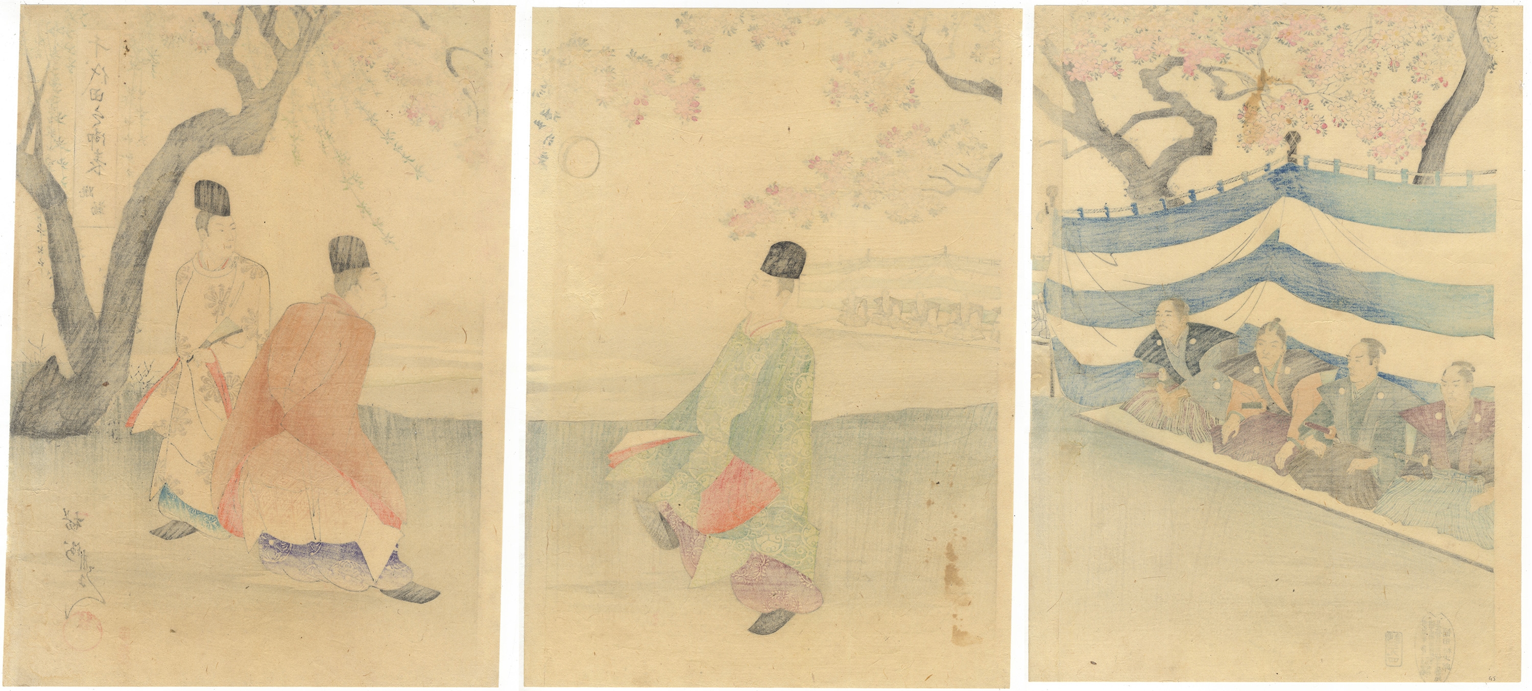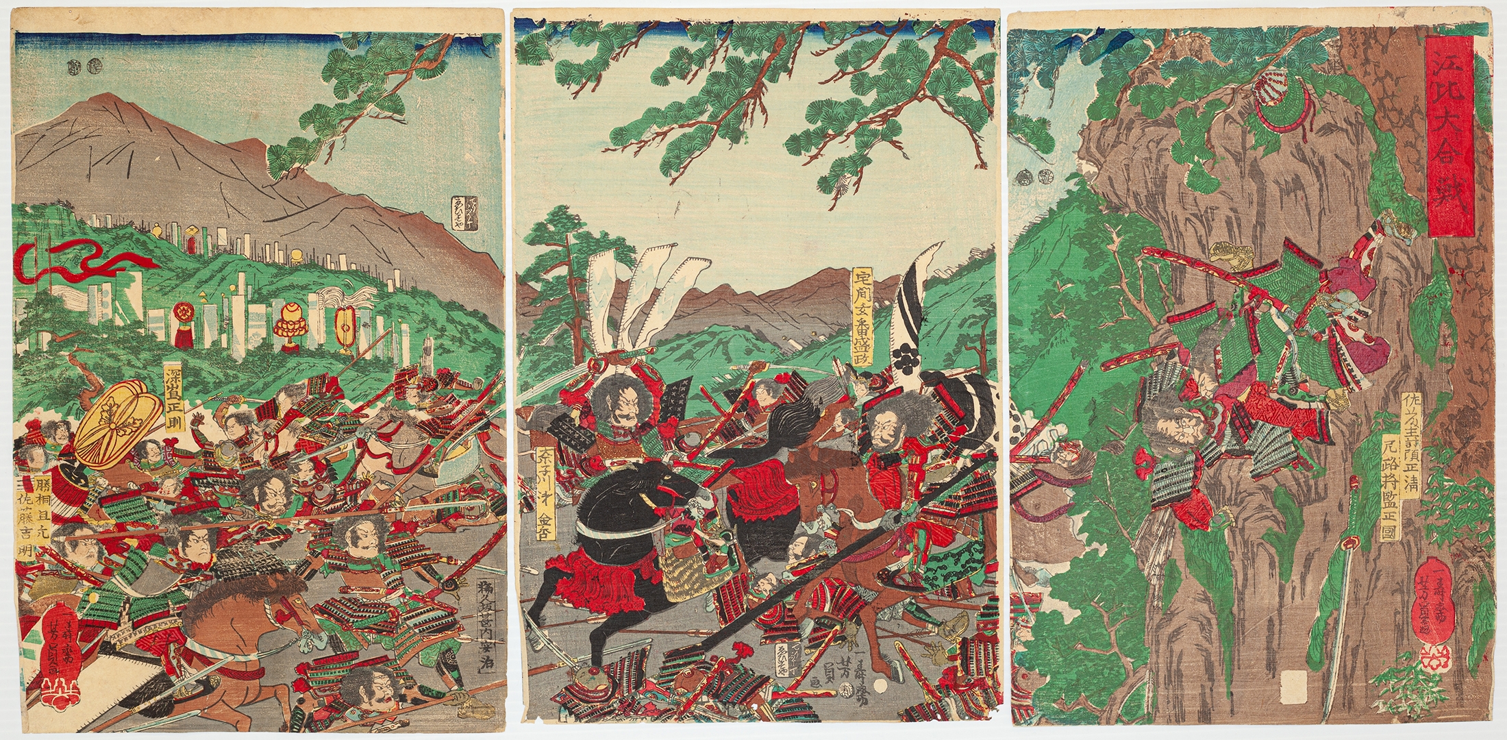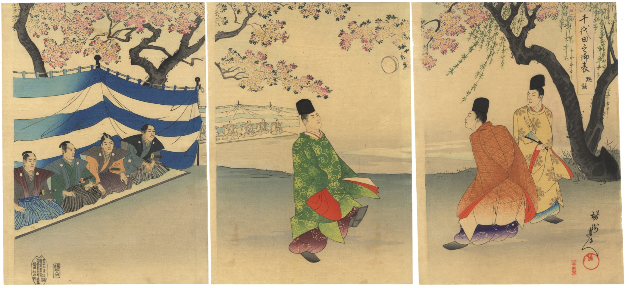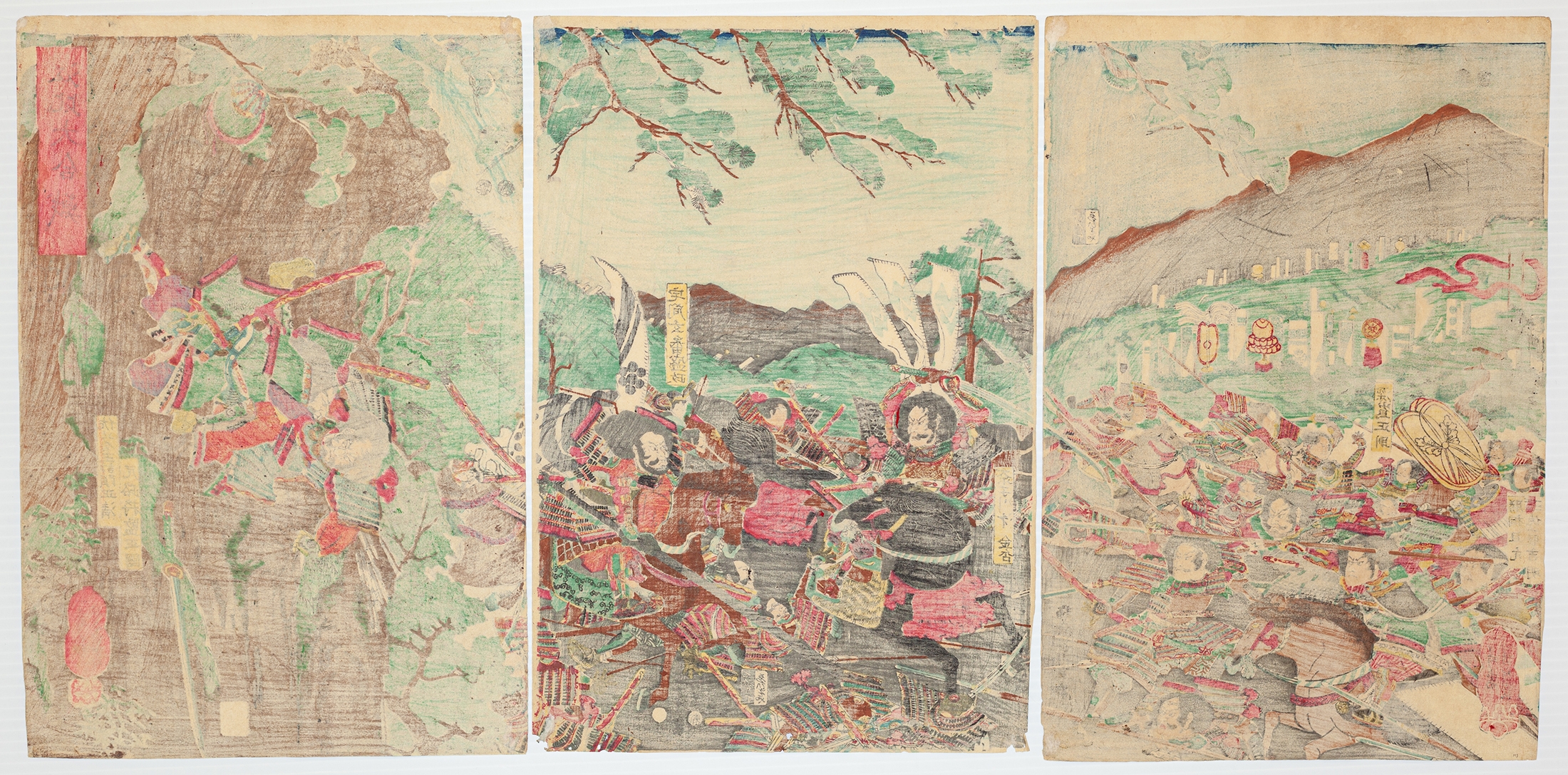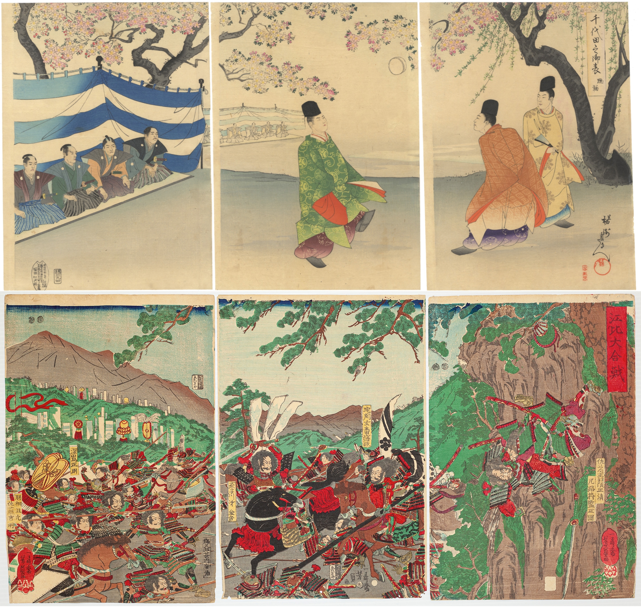 This lot presents six Japanese woodblock prints on paper, arranged as two horizontal triptychs. The upper triptych depicts a leisure or courtly scene under blossoming trees, featuring a group of men seated under a striped tent, a single figure walking, and two figures conversing. The lower triptych illustrates a dynamic battle scene with numerous warriors, some on horseback, engaged in conflict against a mountainous and forested backdrop. All prints display Japanese text, including what appear to be signatures and seals. The overall style and subject matter are consistent with the Ukiyo-e tradition, likely dating to the 19th century.