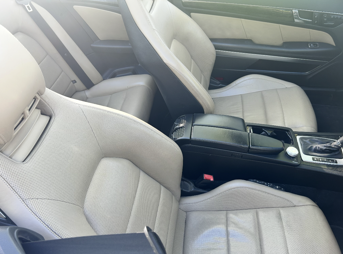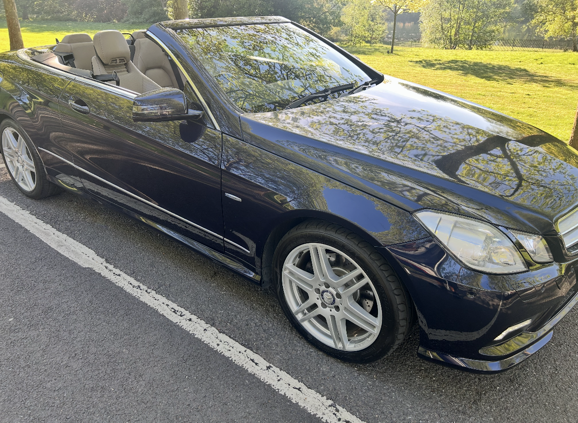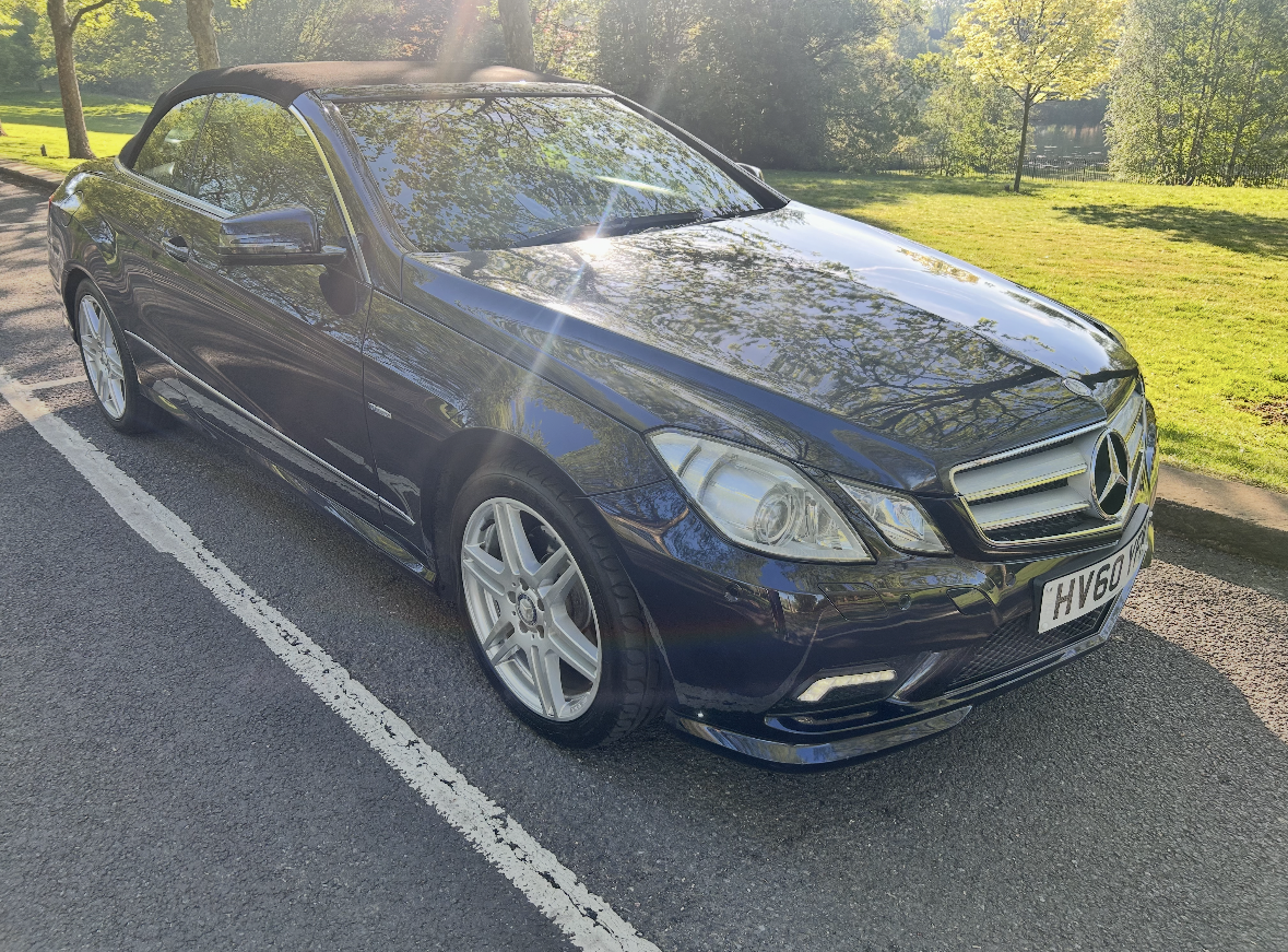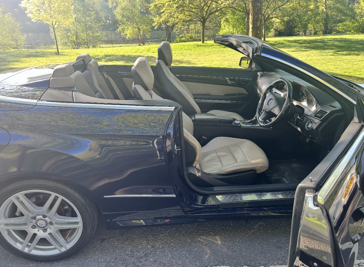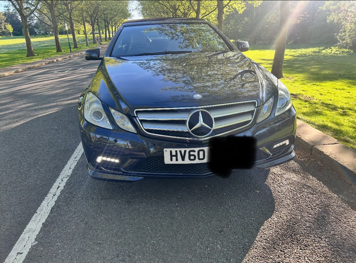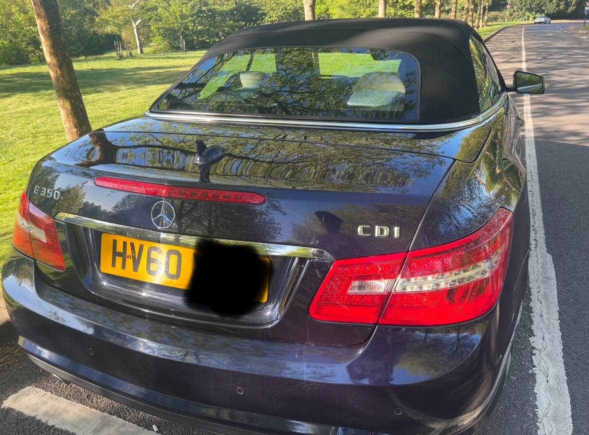 A modern Mercedes-Benz E-Class E 350 CDI four-seater convertible. The vehicle features a dark metallic blue exterior finish with a black fabric soft-top roof. It is fitted with multi-spoke silver alloy wheels, each bearing the Mercedes-Benz three-pointed star logo, which is also prominent on the front grille and rear tailgate. The interior is upholstered in a two-tone perforated leather, predominantly light beige/tan with black accents. Visible markings include the Mercedes-Benz emblems and a UK registration plate beginning “HV60”.