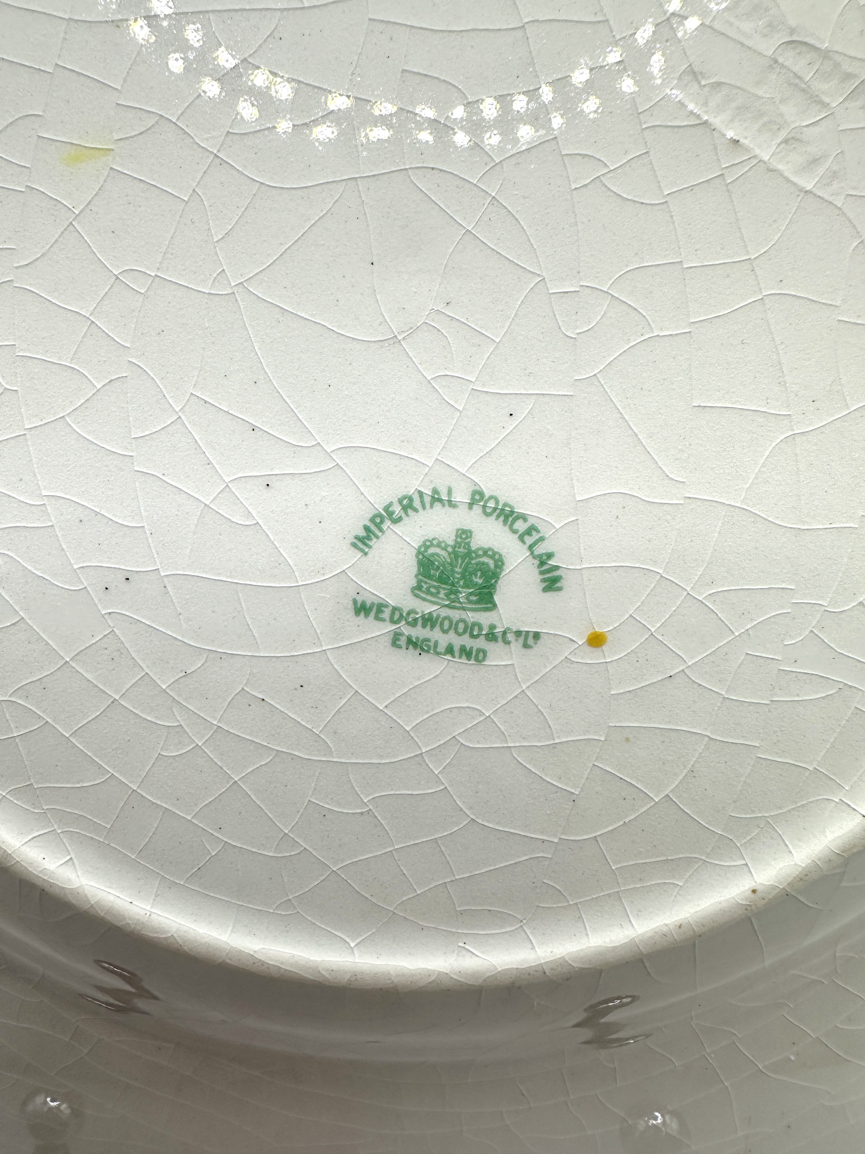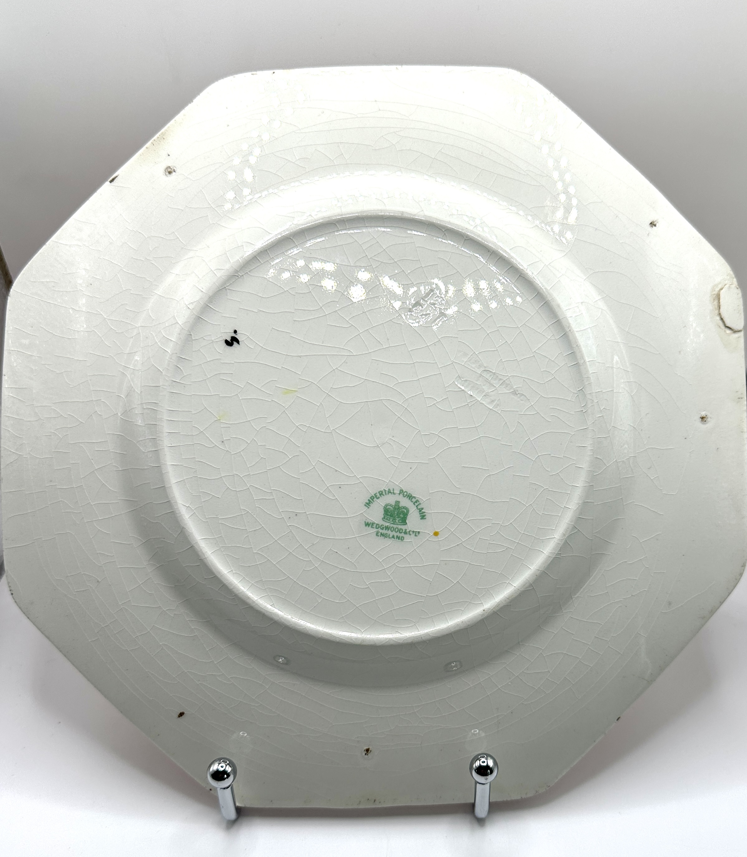 A Wedgwood & Co. Imperial Porcelain octagonal plate, featuring a bold red border with black edging surrounding a central circular well. The well is decorated with a polychrome landscape depicting trees and two birds, one pheasant-like on the ground and another in flight, against a white background. The reverse bears a green printed mark reading “IMPERIAL PORCELAIN” arched above a crown symbol, with “WEDGWOOD & Co” below the crown and “ENGLAND” at the bottom, identifying it as a product of Wedgwood & Co., likely dating to the late 19th or early 20th century, consistent with a circa 1906 production.