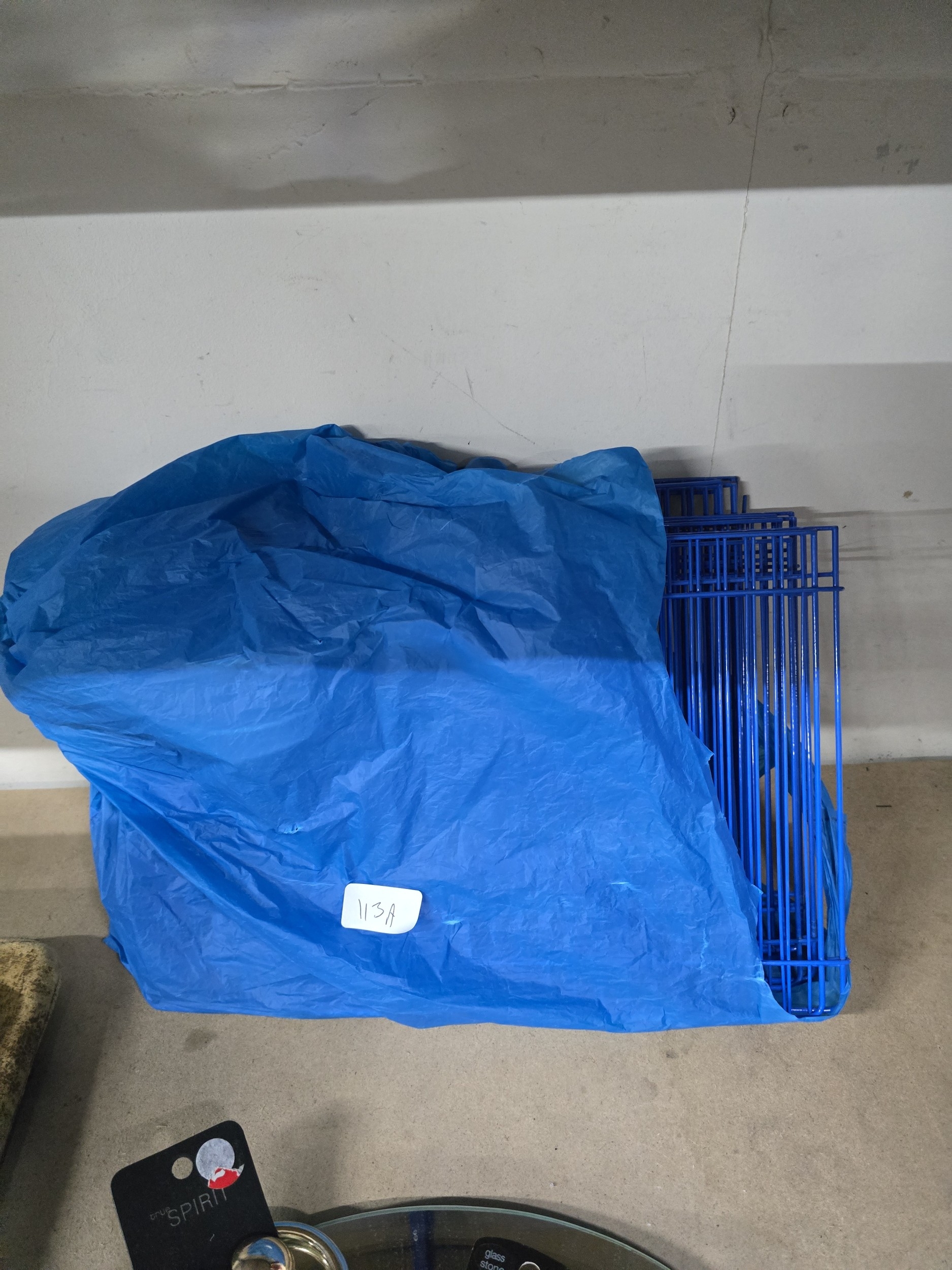 A Group of Blue Coated Metal Wire Panels with a Blue Medium Duty Poly Tarp