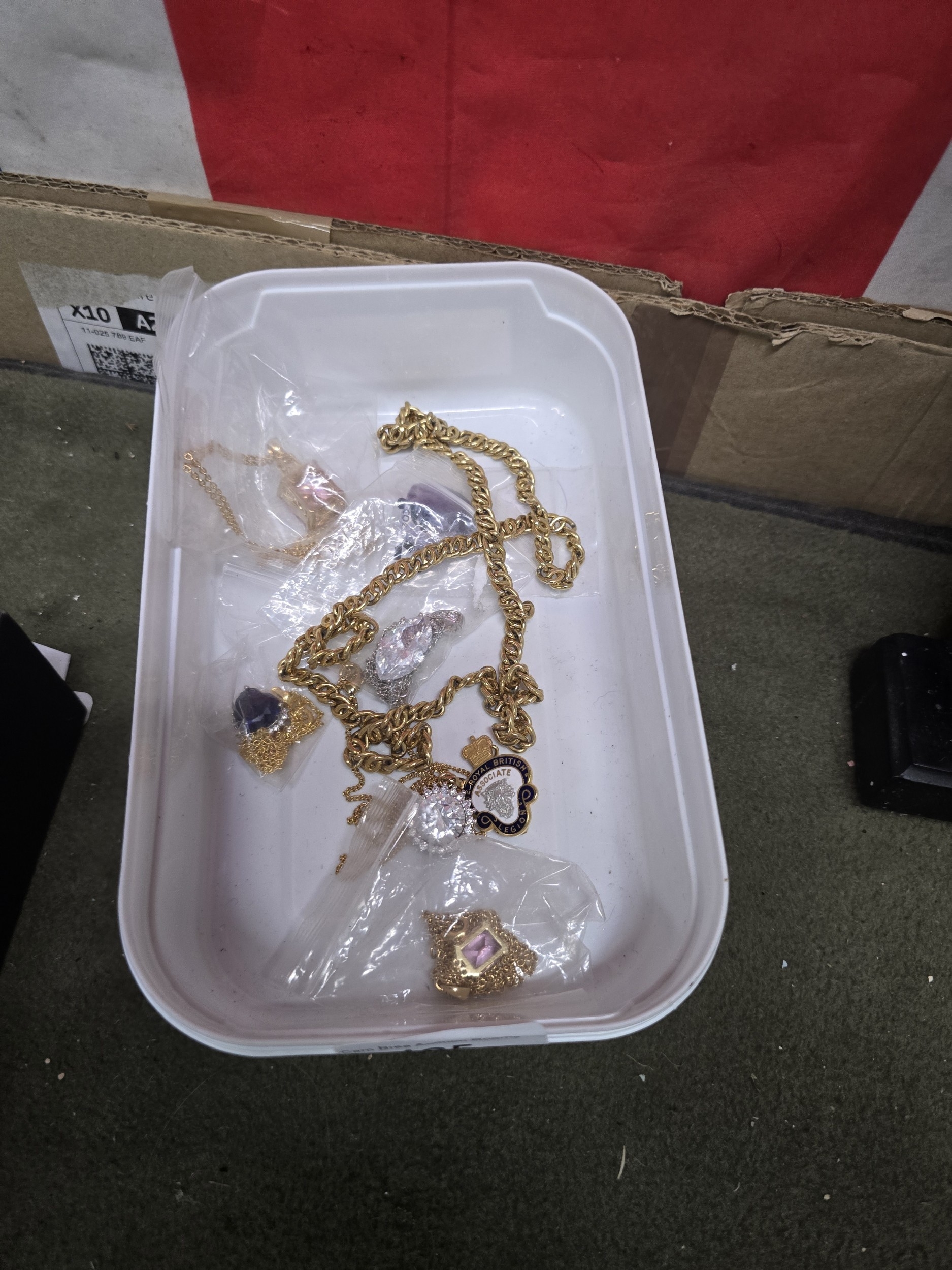 A Collection of Assorted Gold-Tone Costume Jewelry, including Necklaces, Pendants, and a Royal British Associate Legion Badge