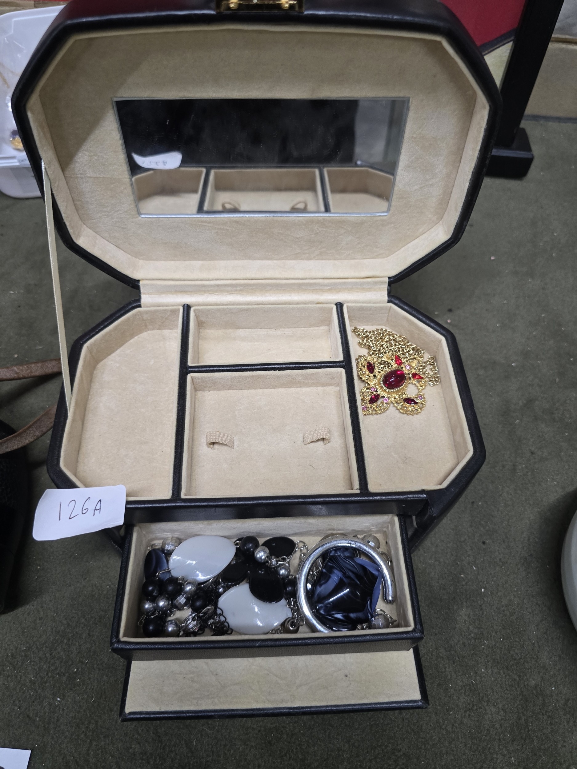 A Black Faux Leather Octagonal Jewelry Box and a Collection of Costume Jewelry