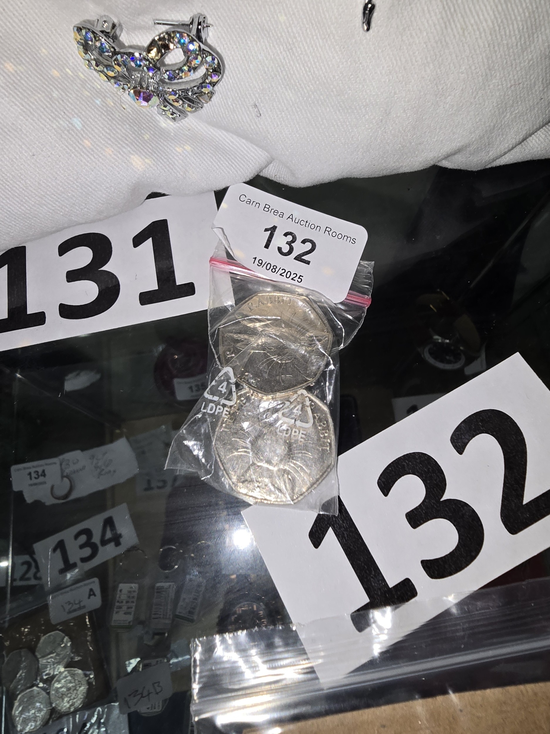 A Group of British 50p Peter Rabbit Commemorative Coins and a Decorative Rhinestone Brooch