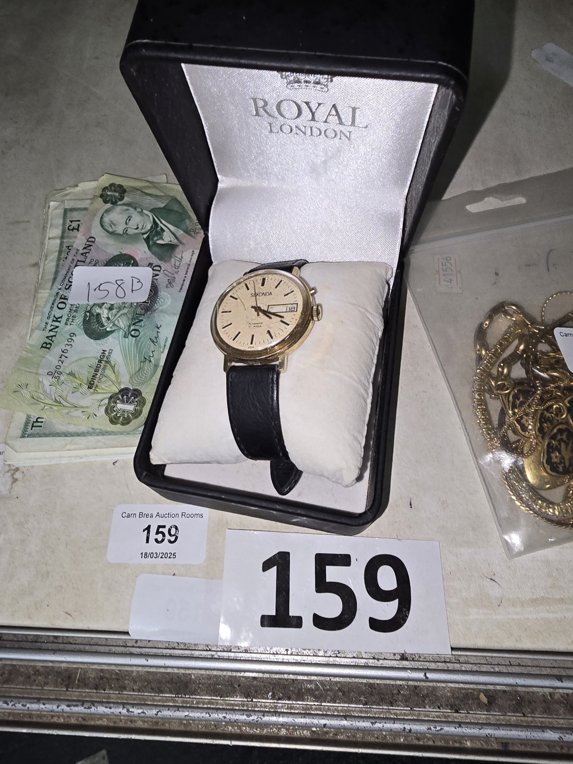 A Vintage USSR Sekonda 21 Jewels Automatic Day-Date Wristwatch, with a group of Bank of Scotland banknotes and a collection of costume jewelry