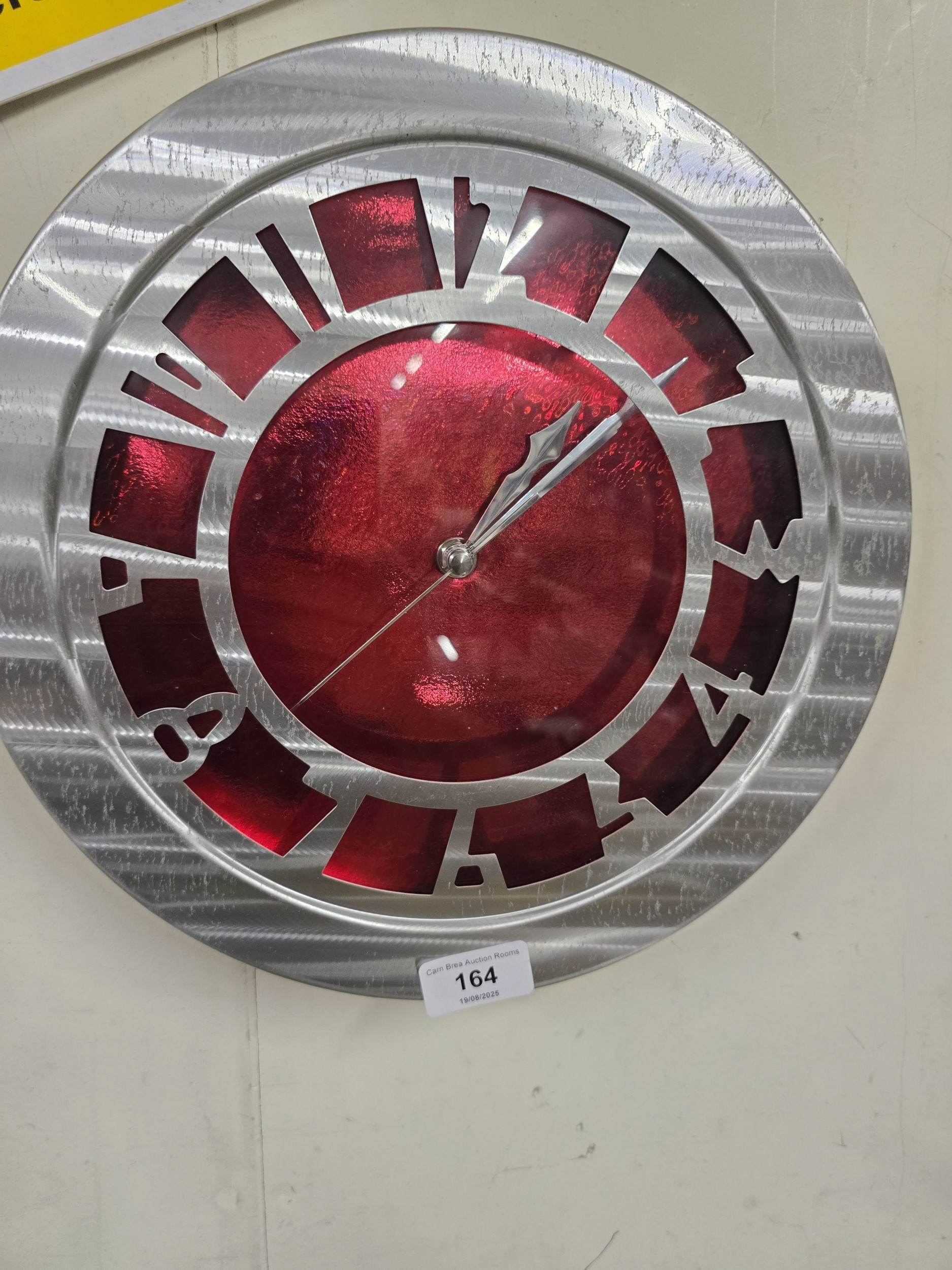 A Contemporary Brushed Metal and Red Geometric Wall Clock