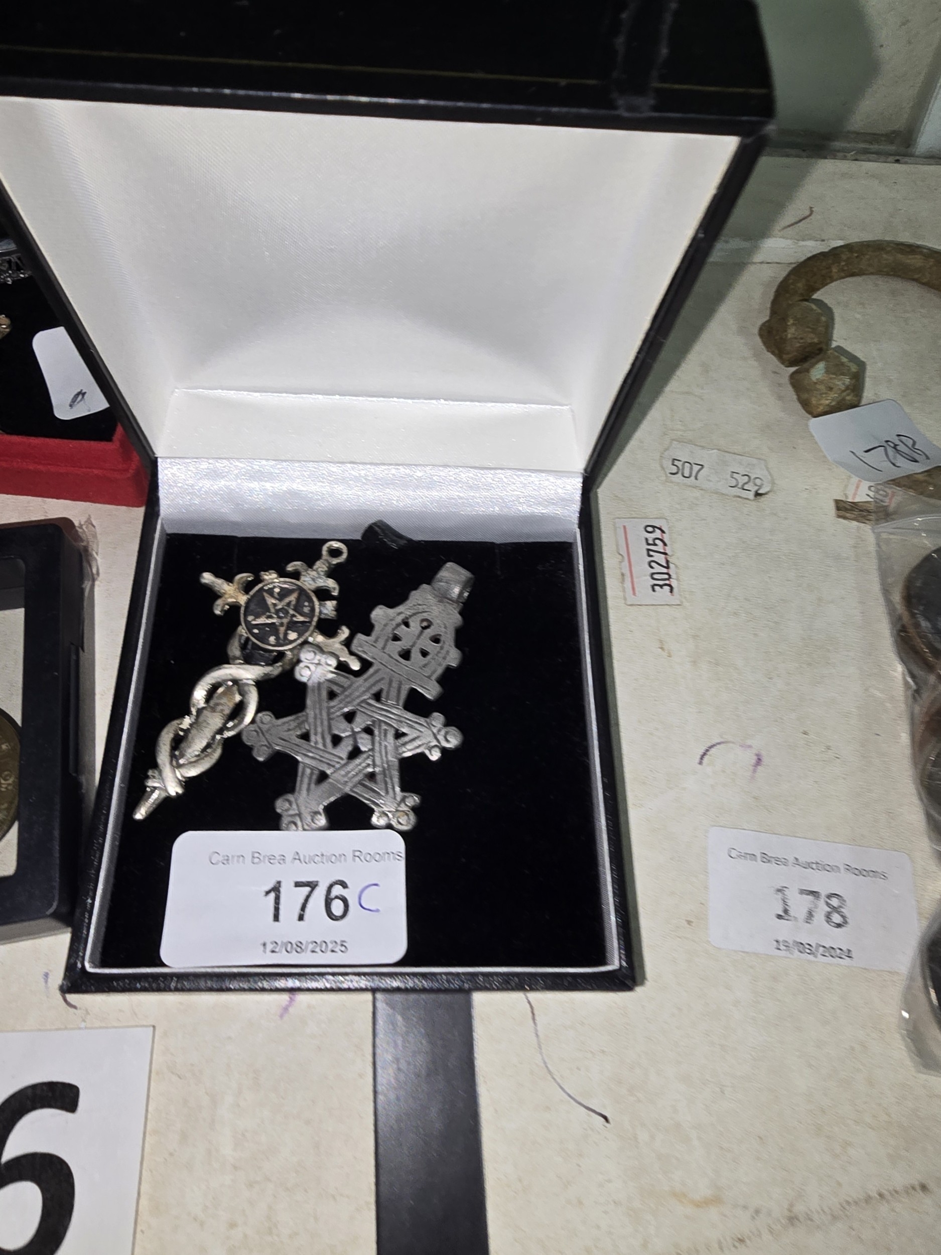 A Group of Vintage or Antique Silver-Toned Pendants, including an Ethiopian/Coptic Style Cross and an Esoteric Pentagram Charm with Hebrew Script