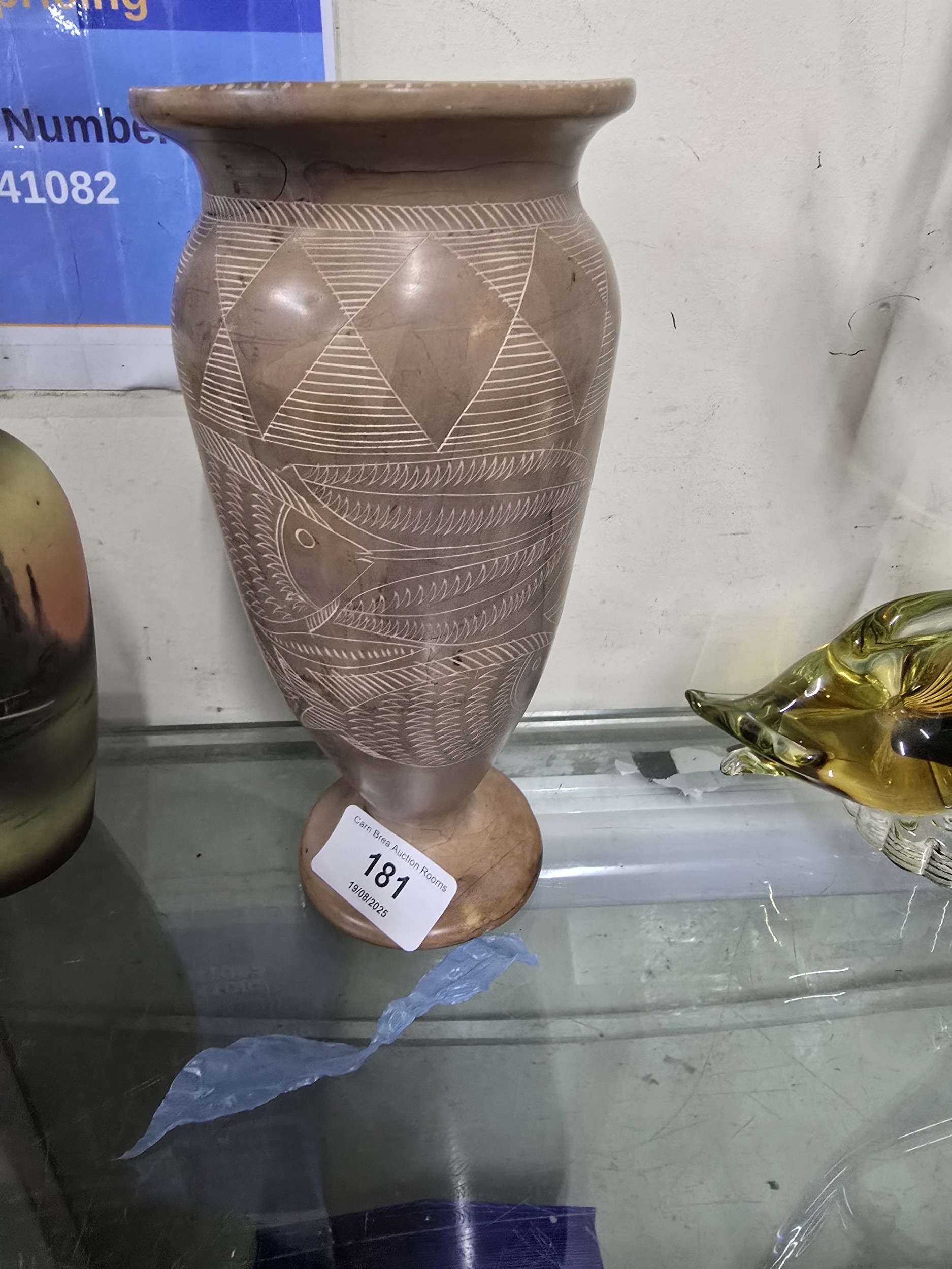Hand Carved Kenyan Soapstone Vase with Fish and Geometric Motifs
