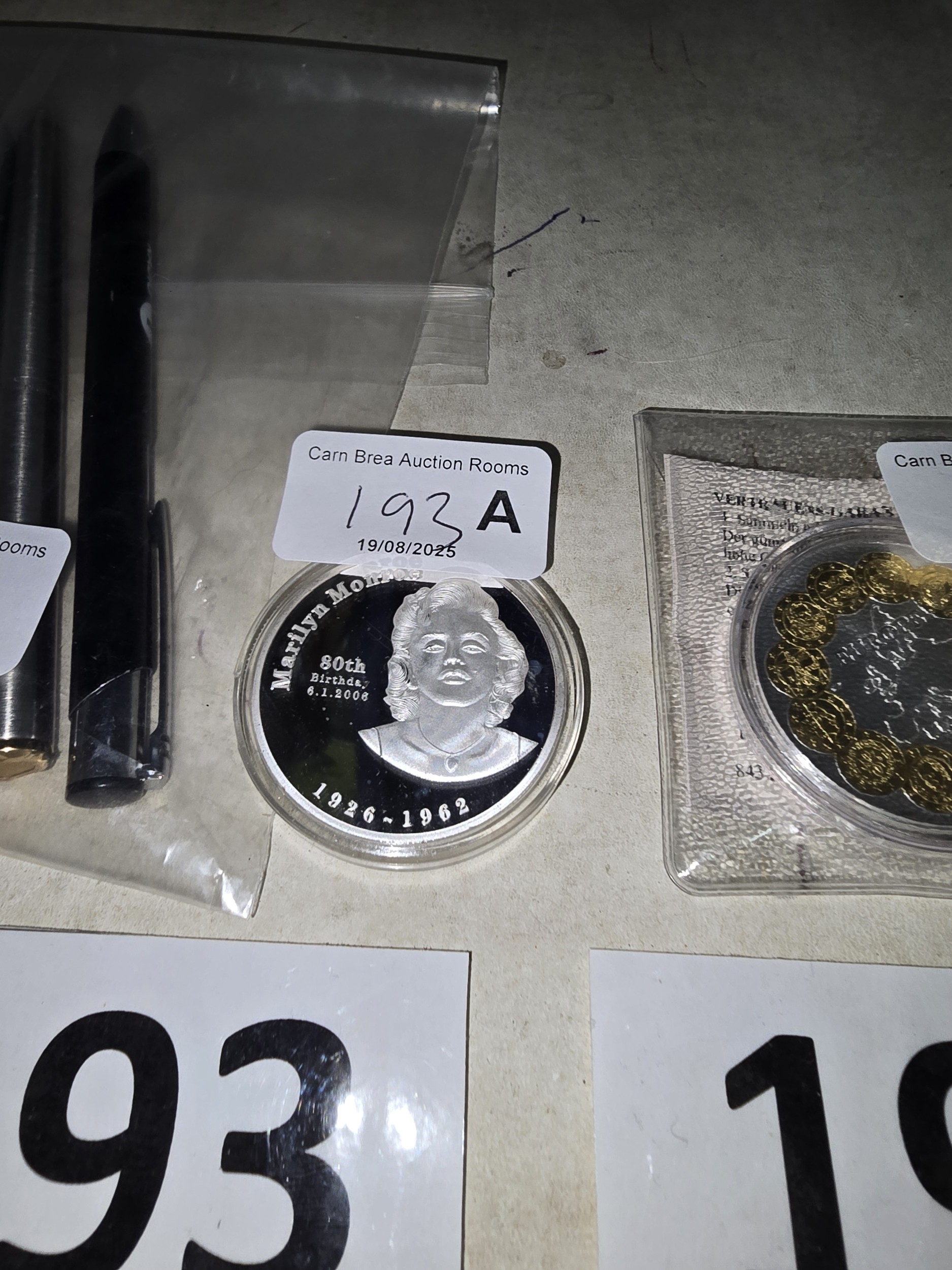 A Group of Commemorative Medallions and Writing Pens, including a Marilyn Monroe 80th Birthday Silver Round