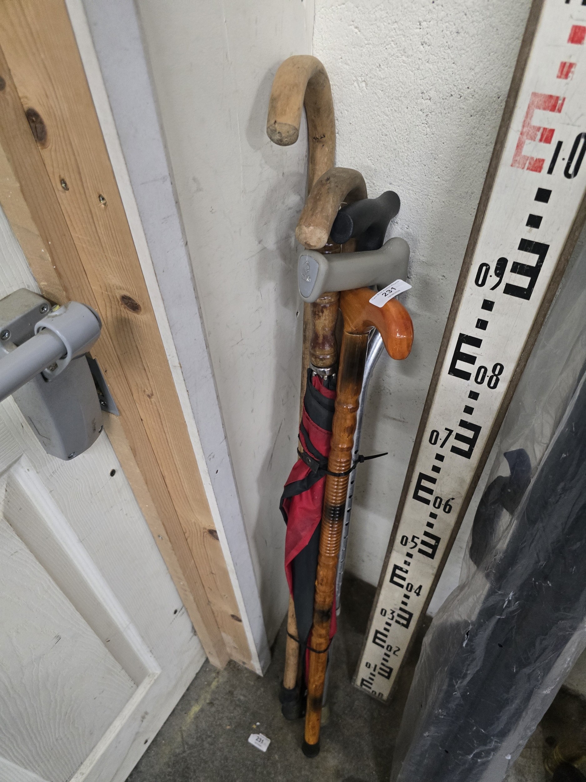 A Collection of Walking Canes and Sticks, an Umbrella, and a Surveying Rod