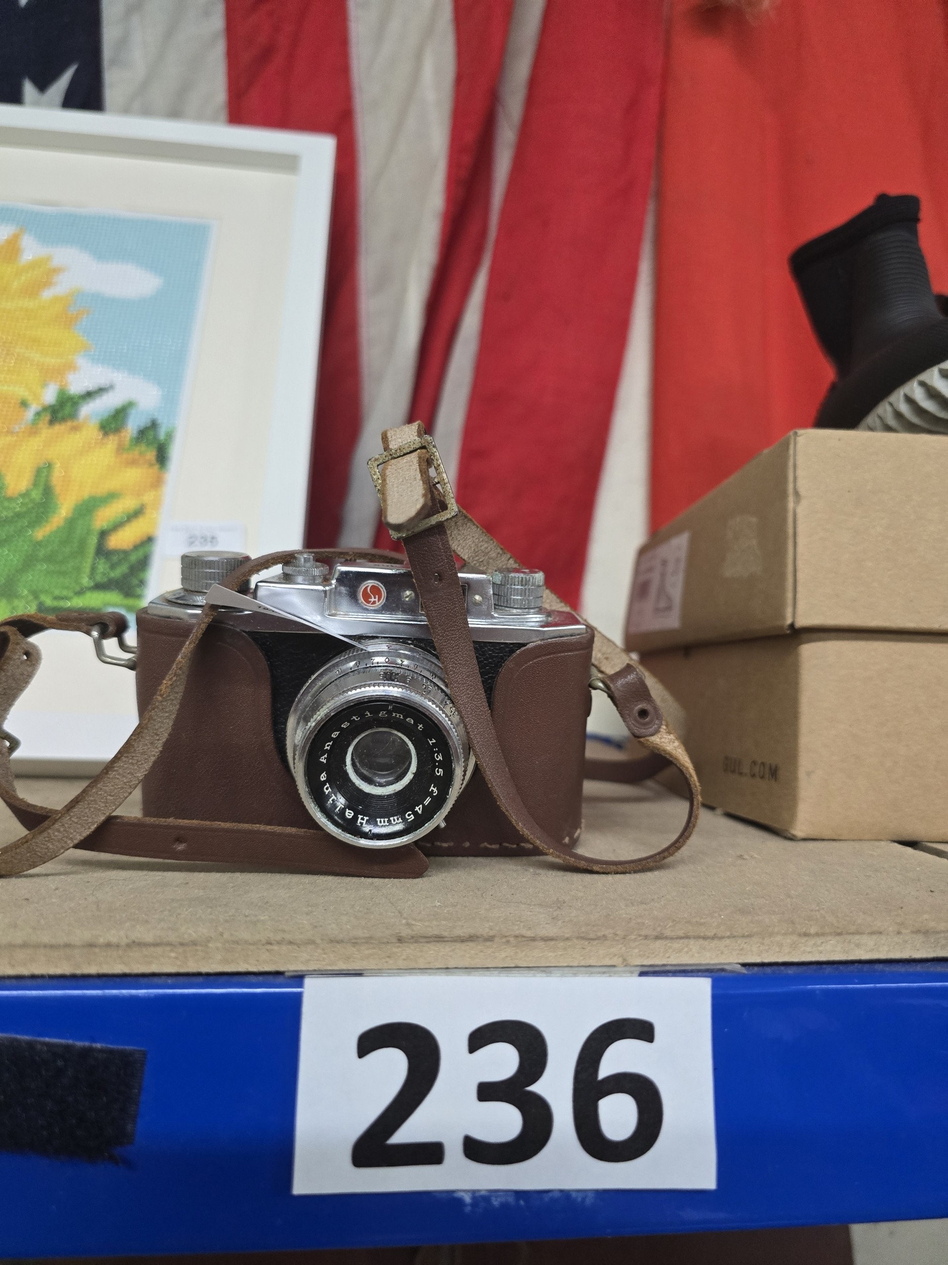Mid-20th Century Compact Film Camera with Anaestigmat Helinar F=45mm 1:3.5 Lens and Leather Case