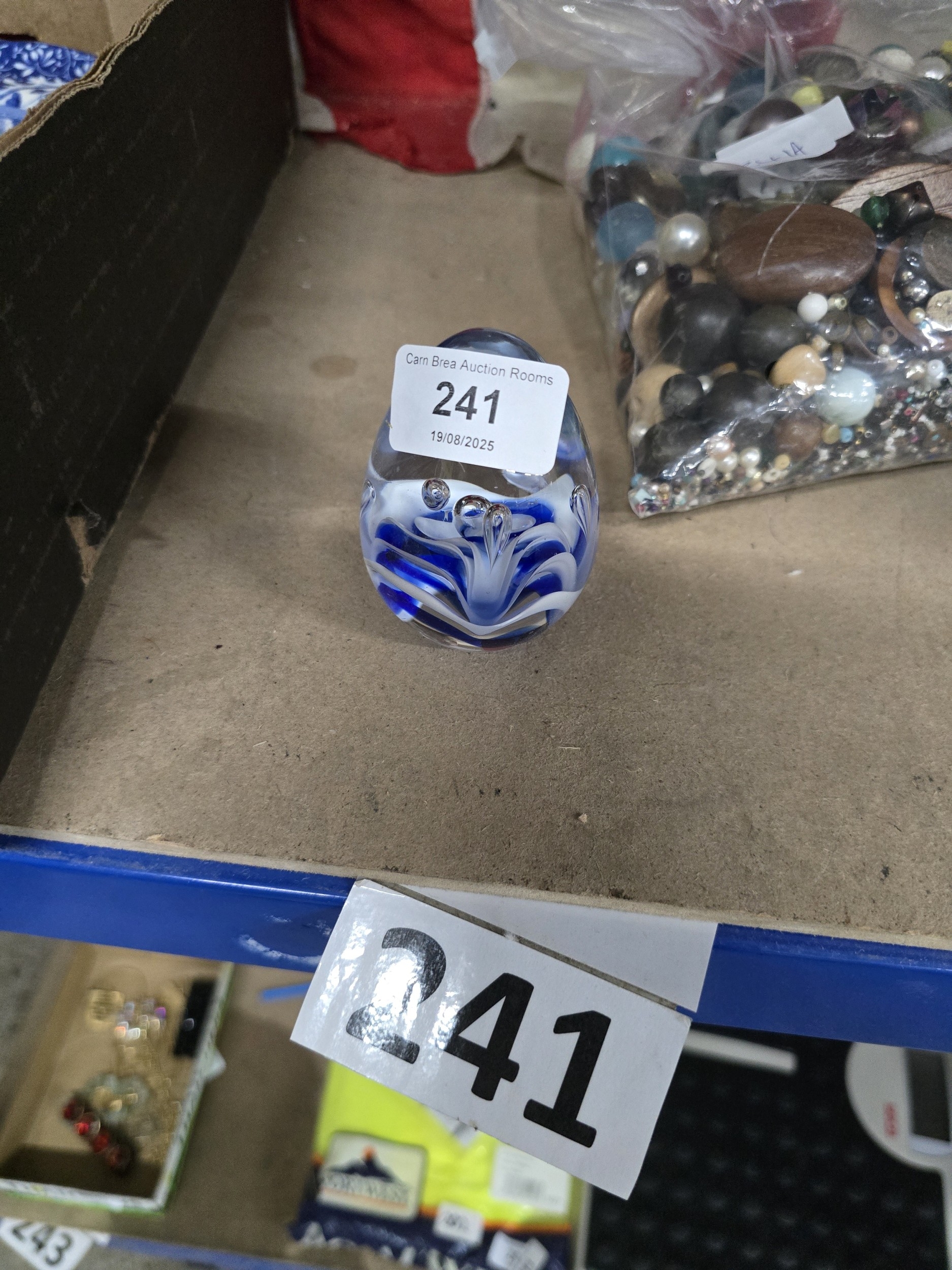 A Contemporary Art Glass Ovoid Paperweight with Blue and White Swirl