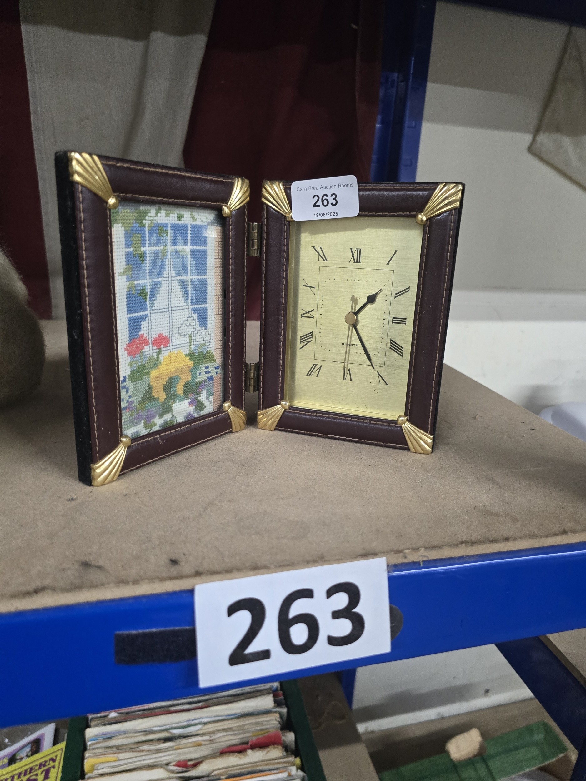 A Faux Leather Bi-Fold Desk Clock and Cross-Stitch Panel