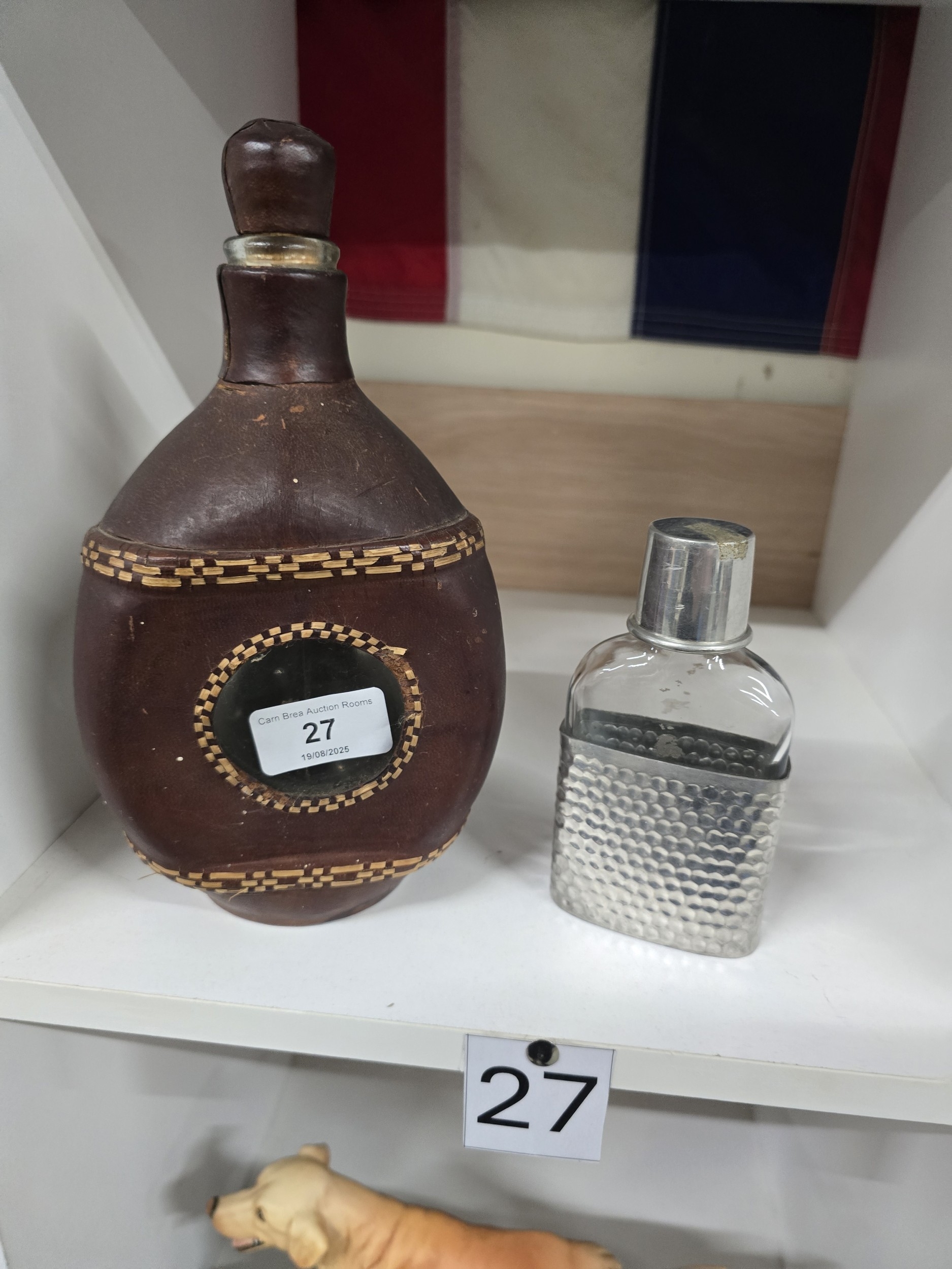 A Group of Vintage Leather-Bound Haig’s Tri-Window Decanter and a Hammered Metal Flask