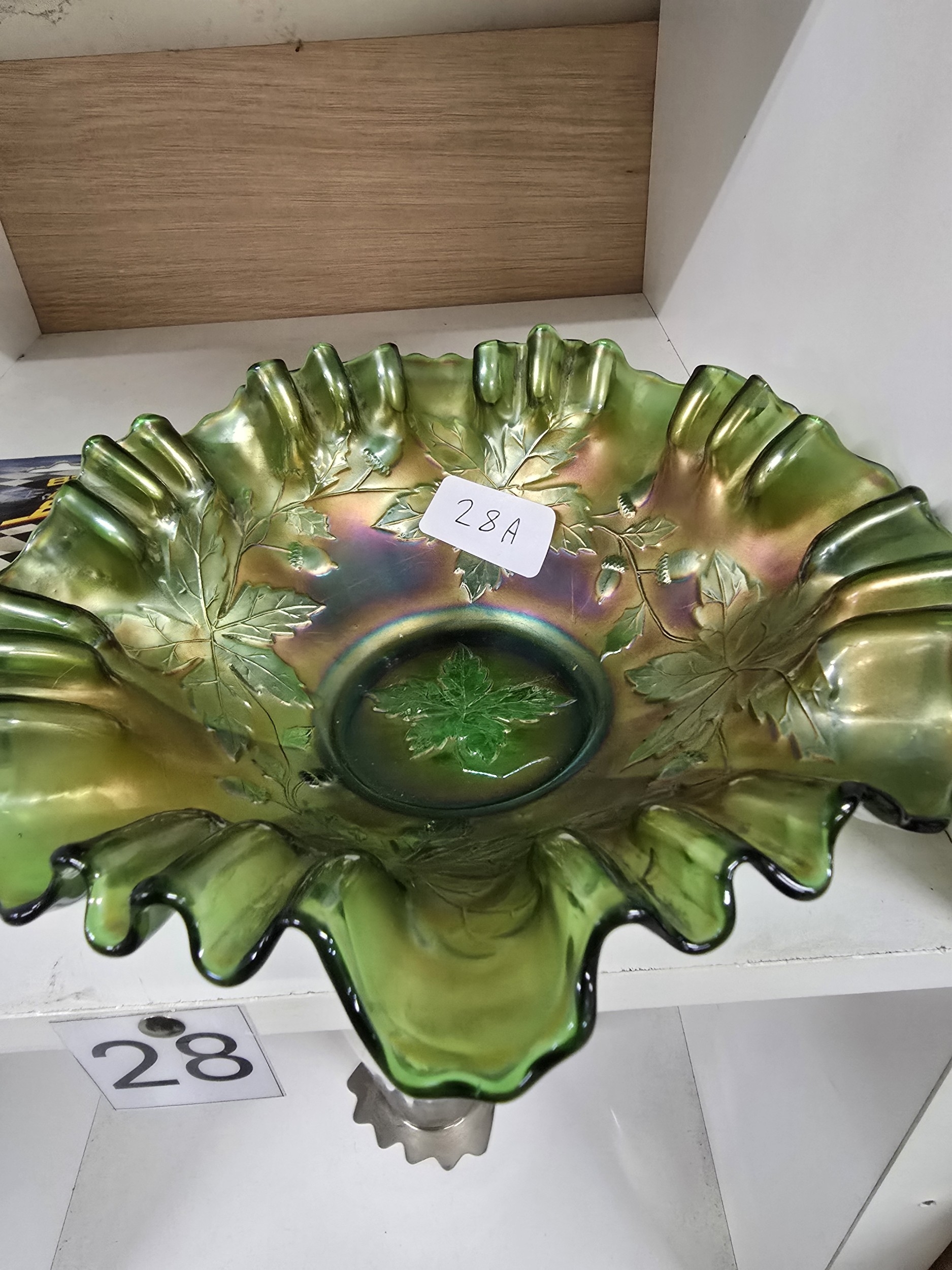 Fenton Green Carnival Glass ‘Grape Leaf’ Ruffled Bowl