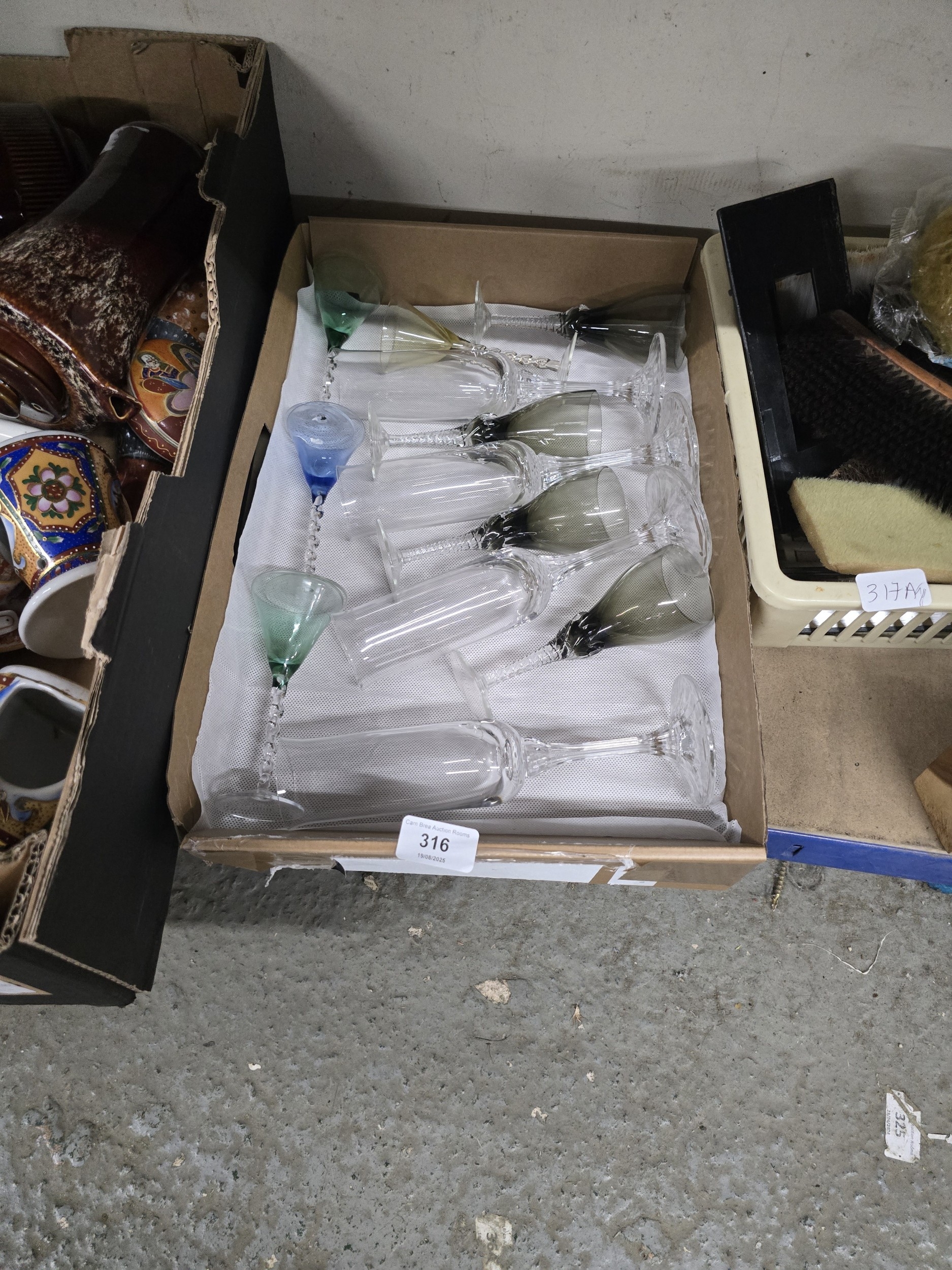 A Collection of Contemporary Glass Champagne Flutes with Varied Stems and Tinted Bowls