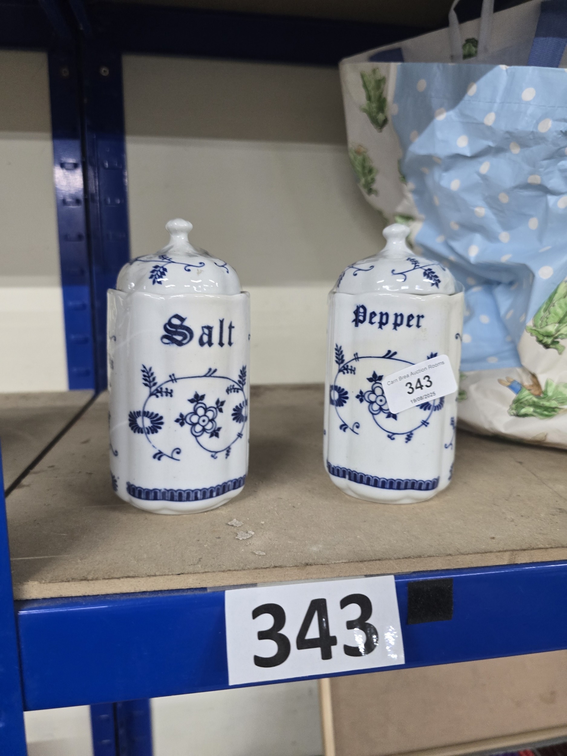 A Group of Portelanul Alba Iulia Blue Onion Pattern Ceramic Salt and Pepper Jars