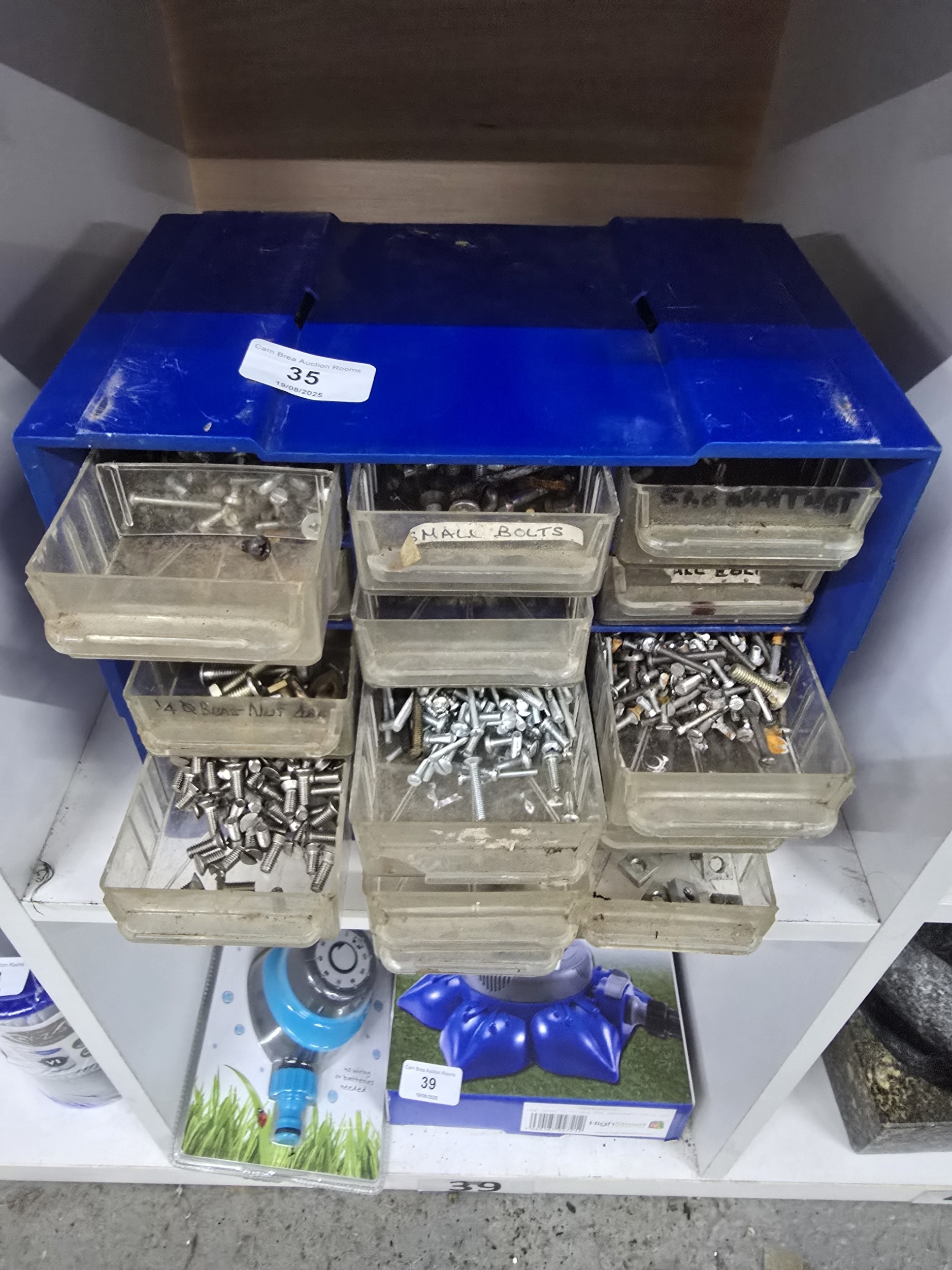 A Blue Plastic Multi-Drawer Hardware Organizer with Assorted Fasteners