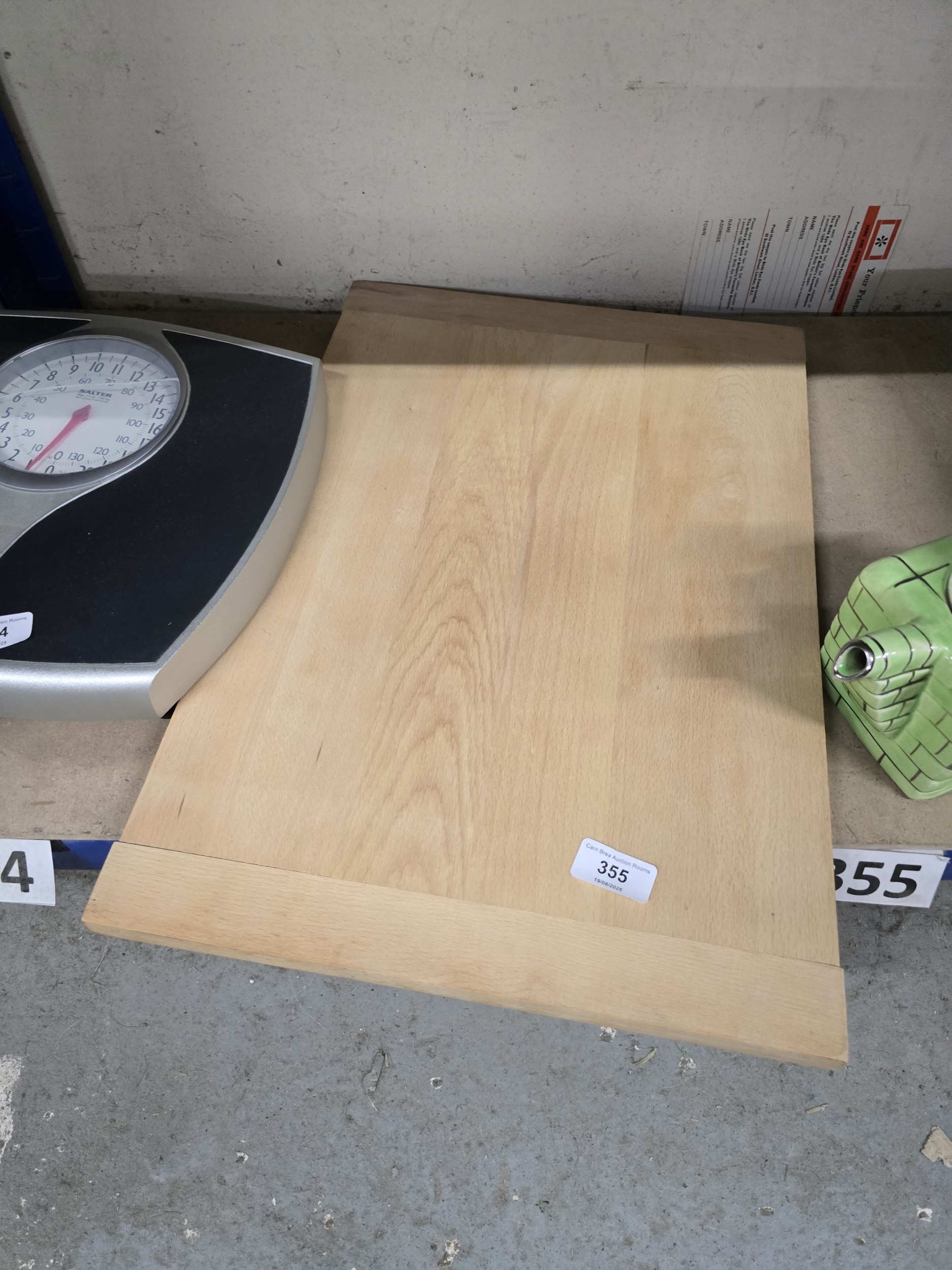 A Group of Household Items, including an IKEA Style Wooden Board, a Salter Weighing Scale, and a Green Ceramic Item