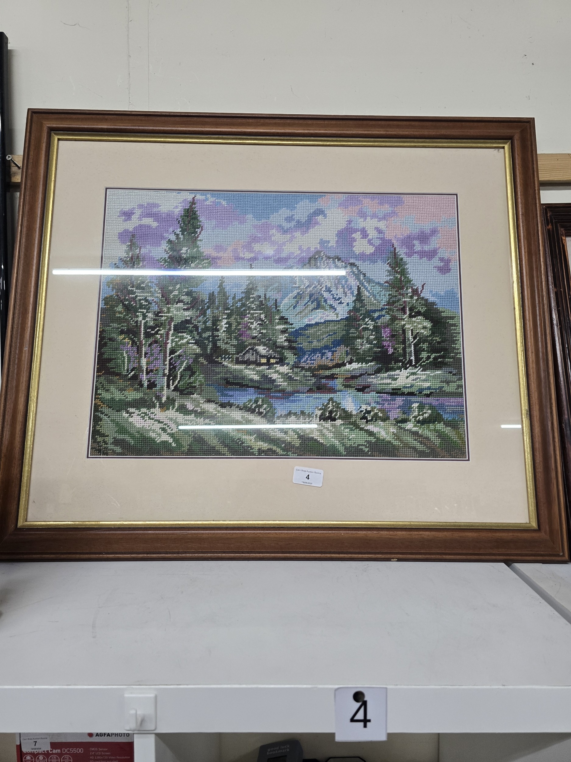 A Framed Cross-Stitch Landscape Depicting Mountains and a Lake