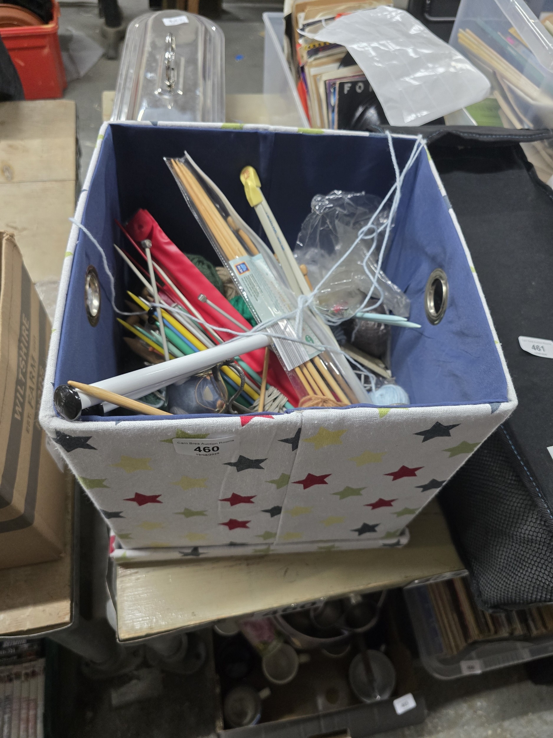 Collapsible Fabric Storage Box with Colorful Stars, Containing a Collection of Crafting Supplies