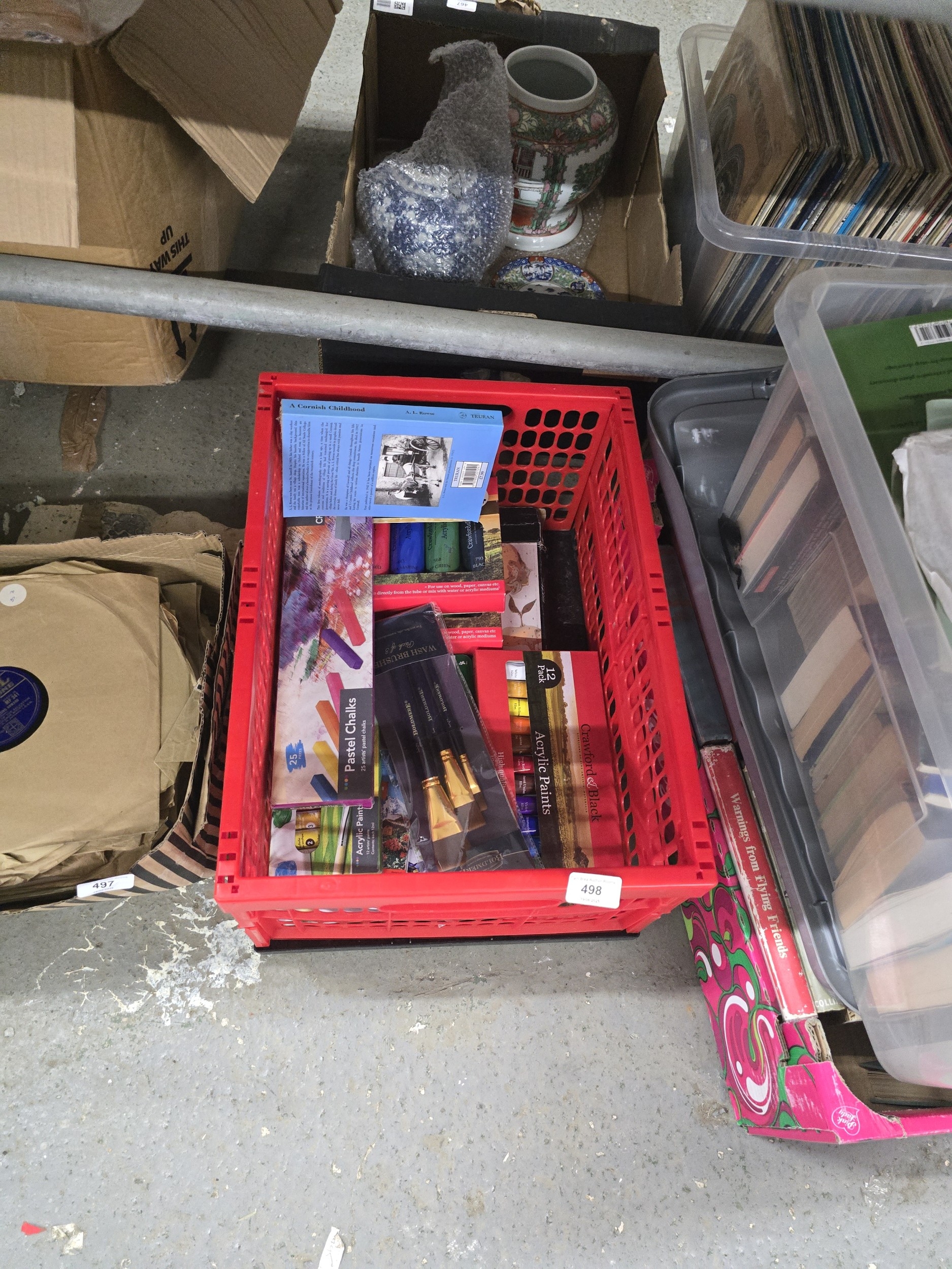 A Collection of Mixed Lot Items, Including East Asian Style Ceramics, Art Supplies, Books, and Vinyl Records, in Storage Crates