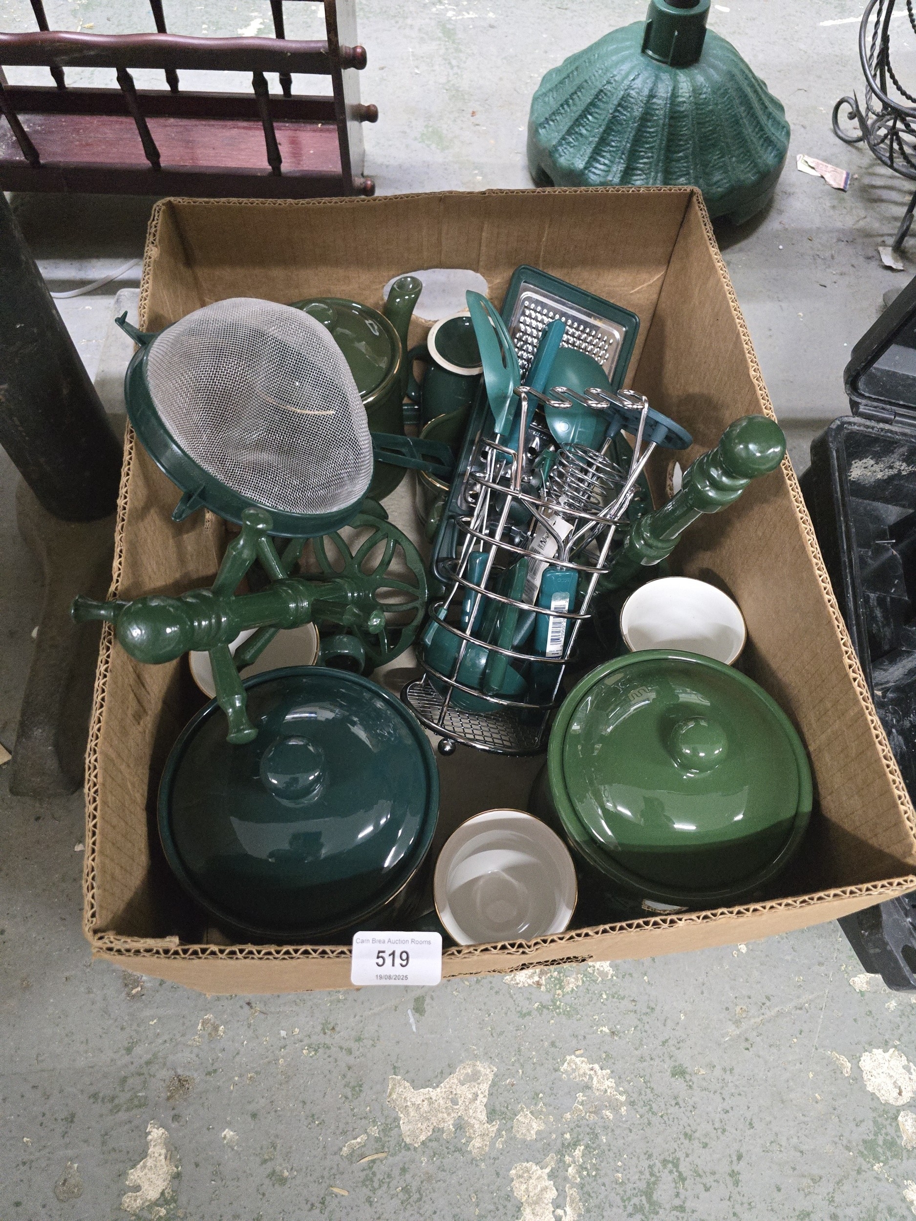 A Collection of Modern Dark Green Kitchenware, including Enamelware Pots, Utensils, and Gold-Rimmed Bowls