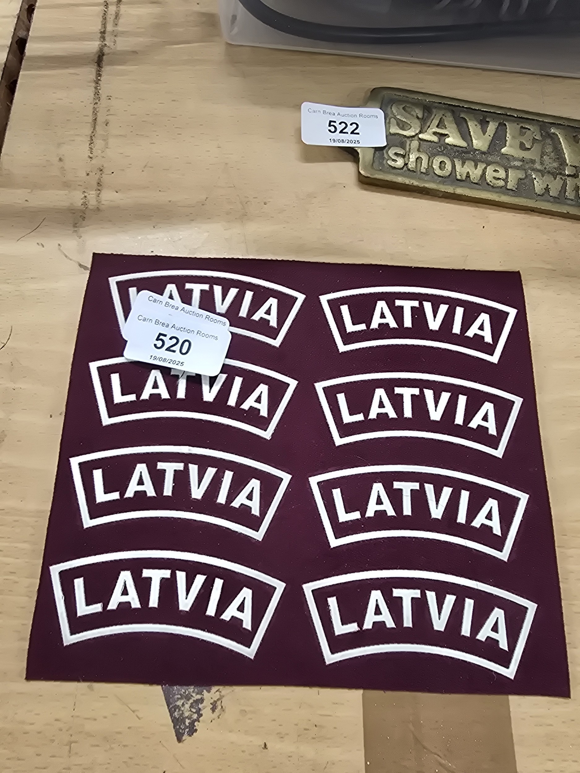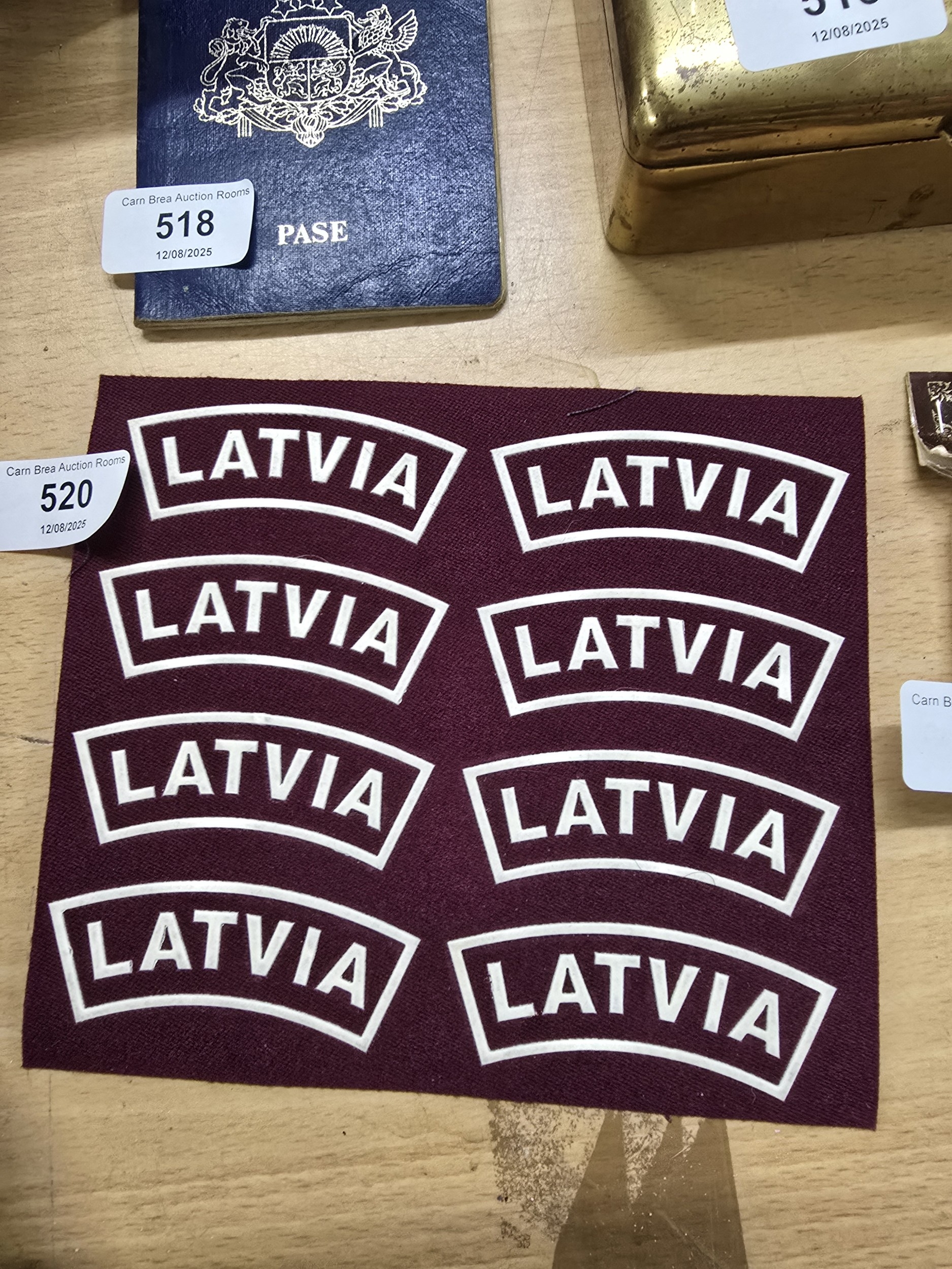 A Group of Latvian Embroidered ‘LATVIA’ Arc-Shaped Patches on an Uncut Sheet