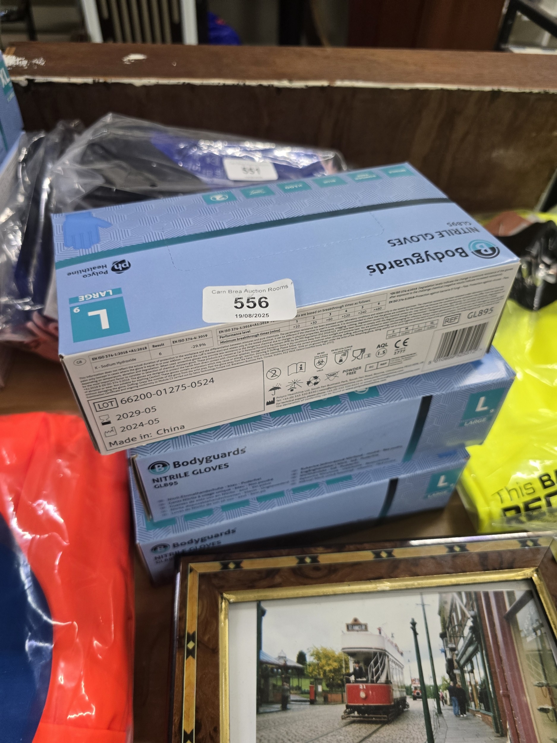 A Group of Bodyguards Blue Nitrile Powder Free Disposable Gloves, Large, with a Framed Photograph of a Tram