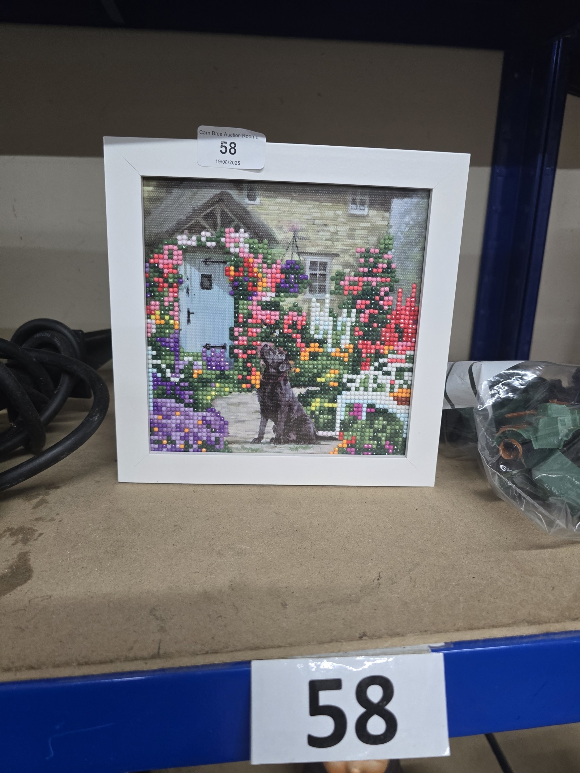 A Contemporary Framed Diamond Painting, ‘Black Dog in a Cottage Garden’