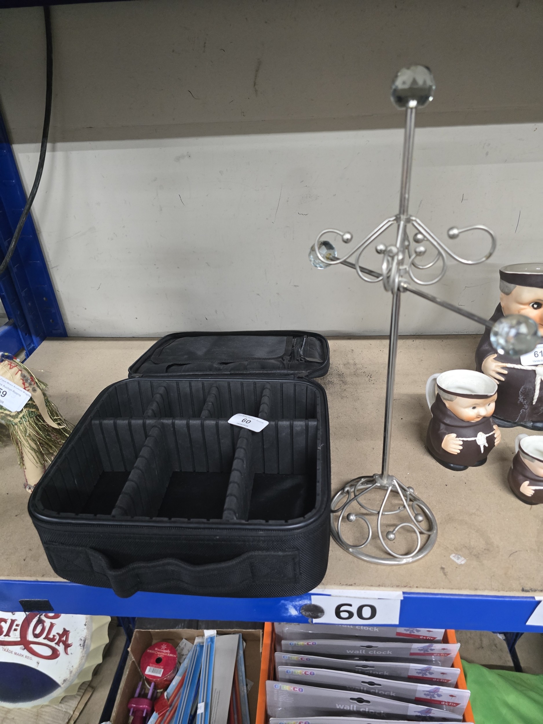 A Travel Makeup Case, a Silver-Toned Jewelry Stand, and a Collection of Ceramic Monk Mugs