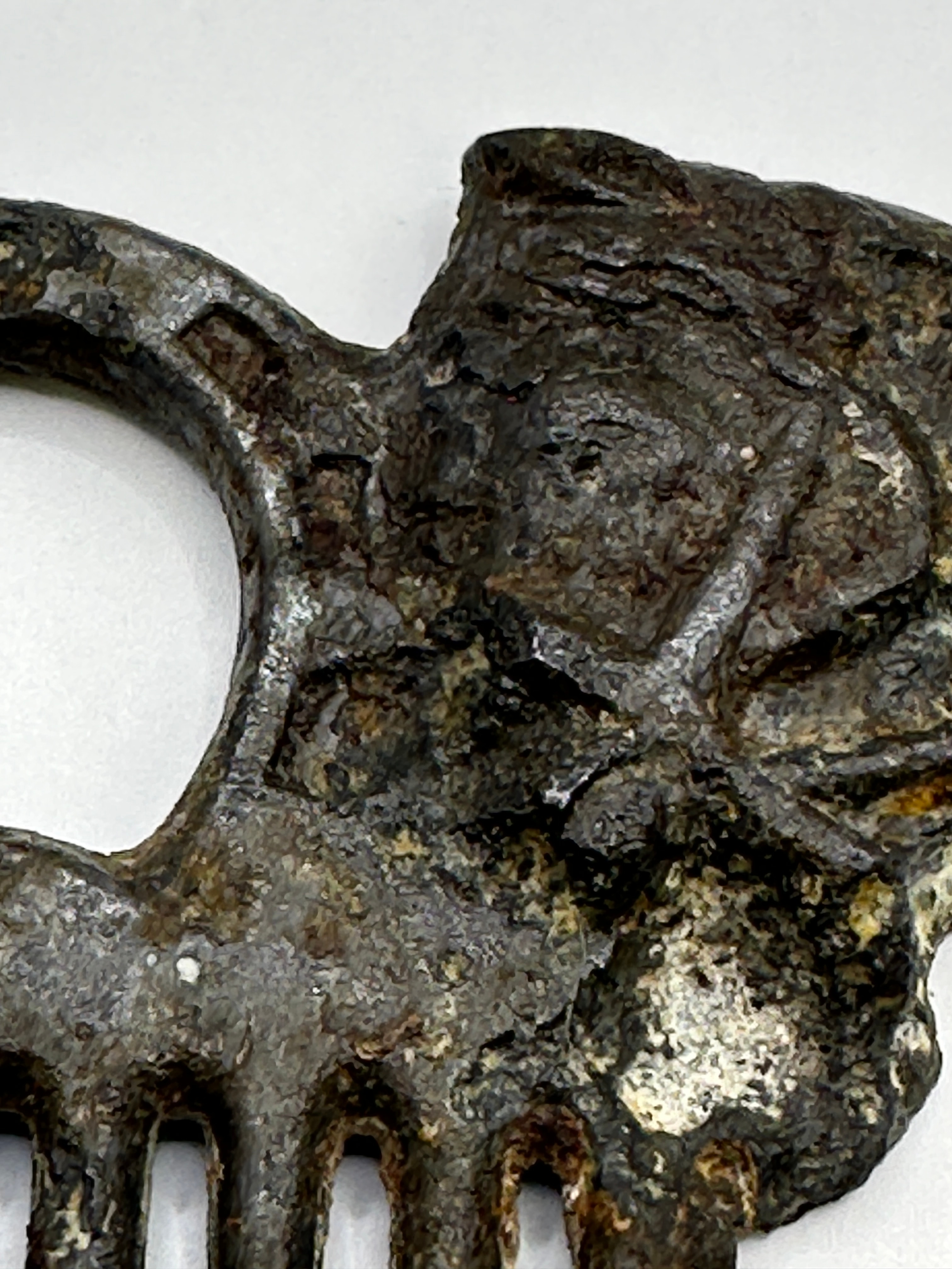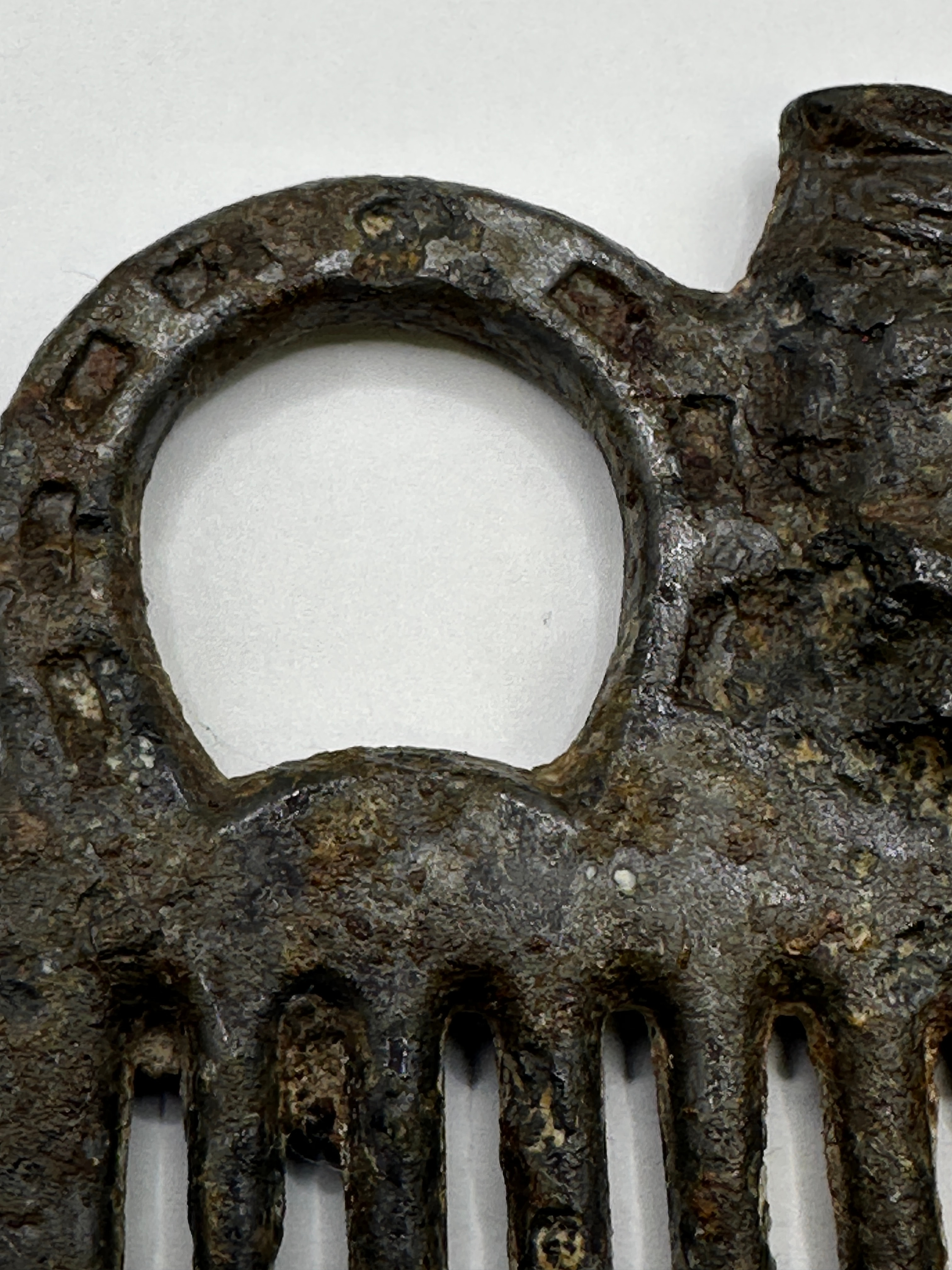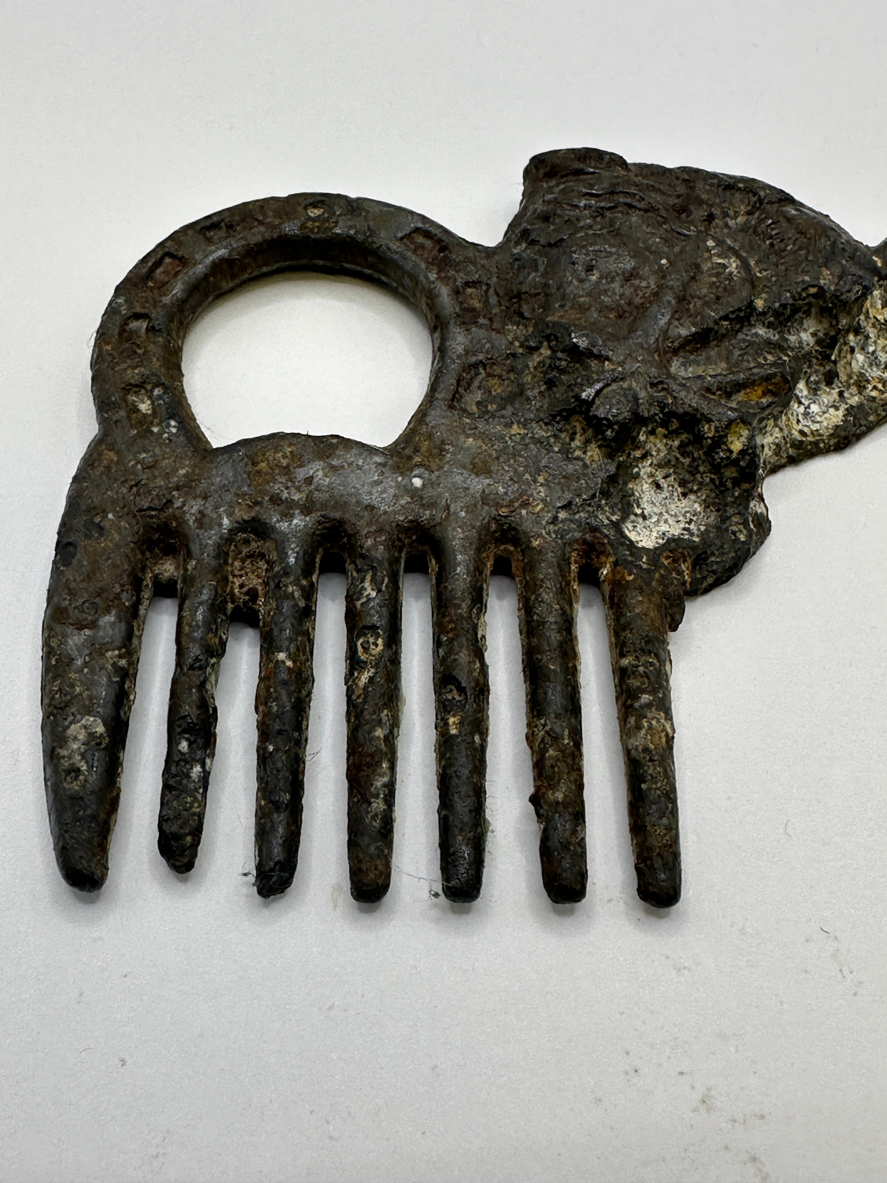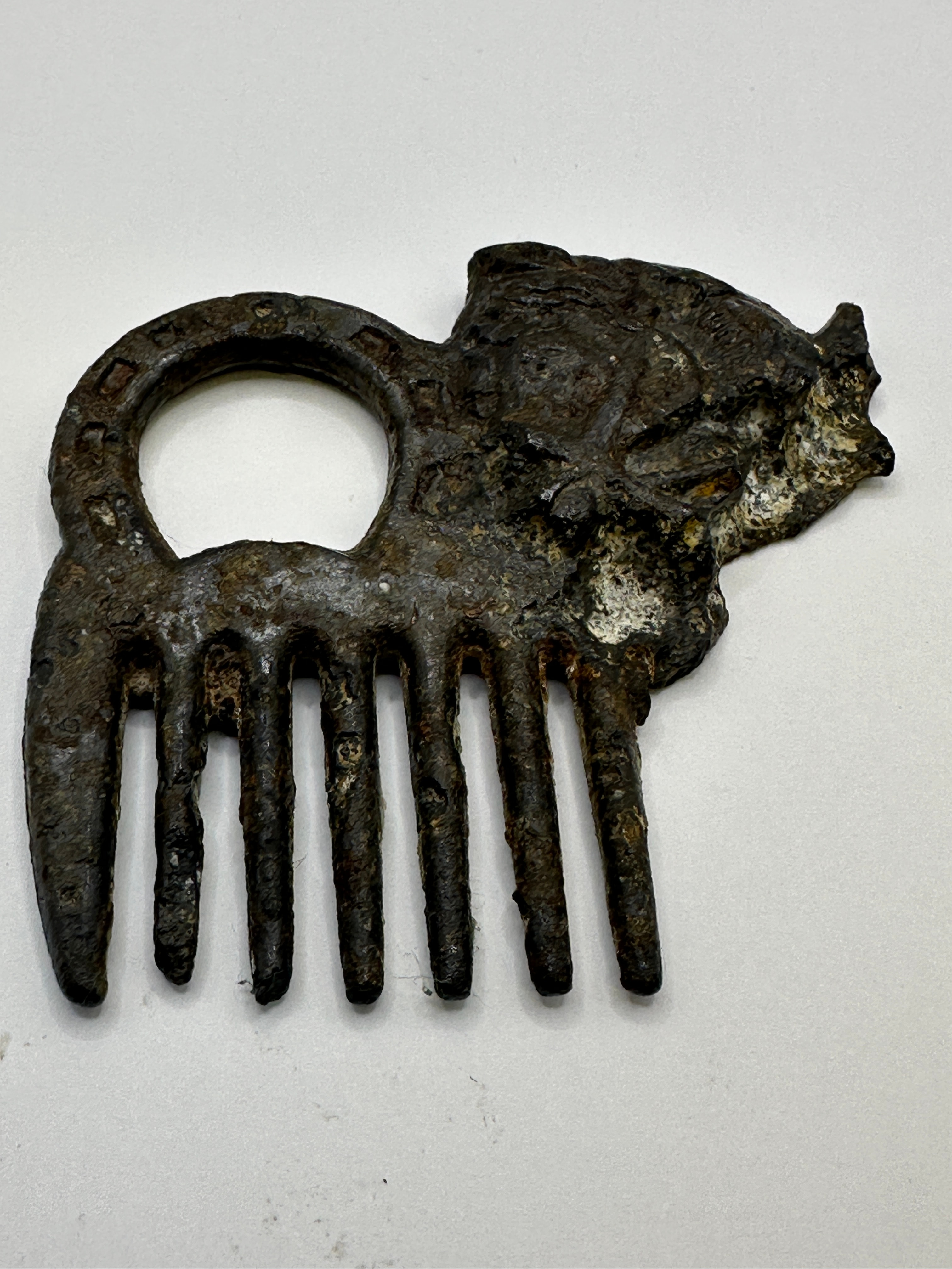 A Roman comb, crafted from ferrous metal. This archaic-style piece features seven widely spaced, robust tines extending from a horizontal bar. To the left, a ‘C’-shaped loop is present, ornamented with rectangular indentations along its outer rim. The upper right portion of the comb terminates in a zoomorphic design, appearing to be an animal head in profile, possibly a boar or similar creature. No discernible text or explicit maker’s marks are visible.