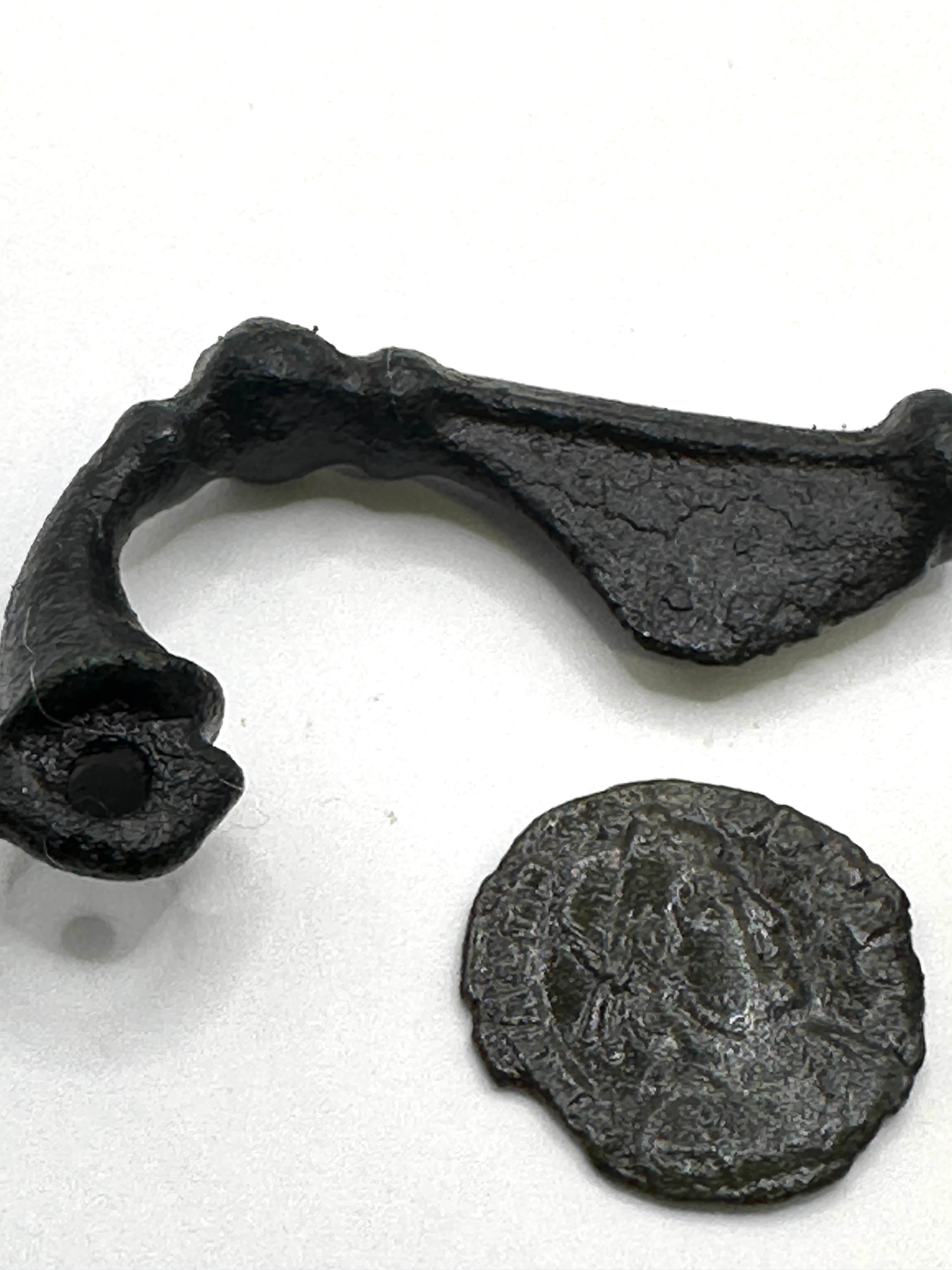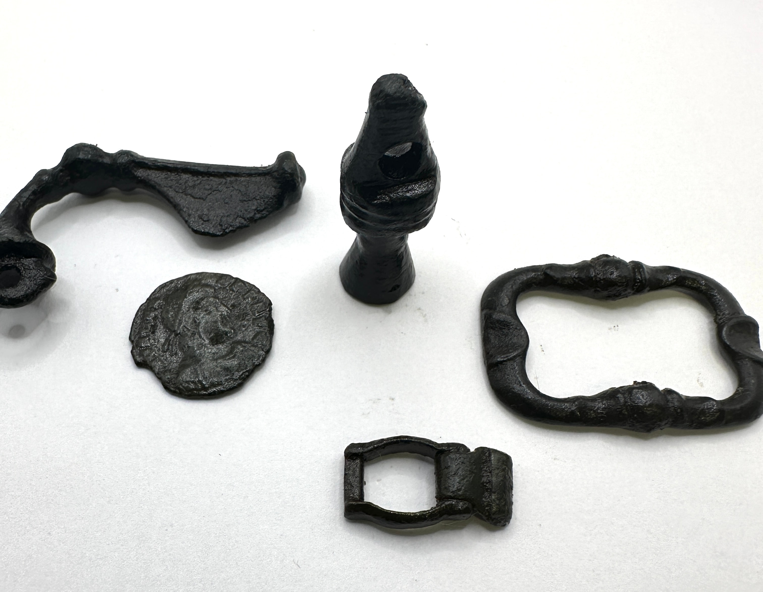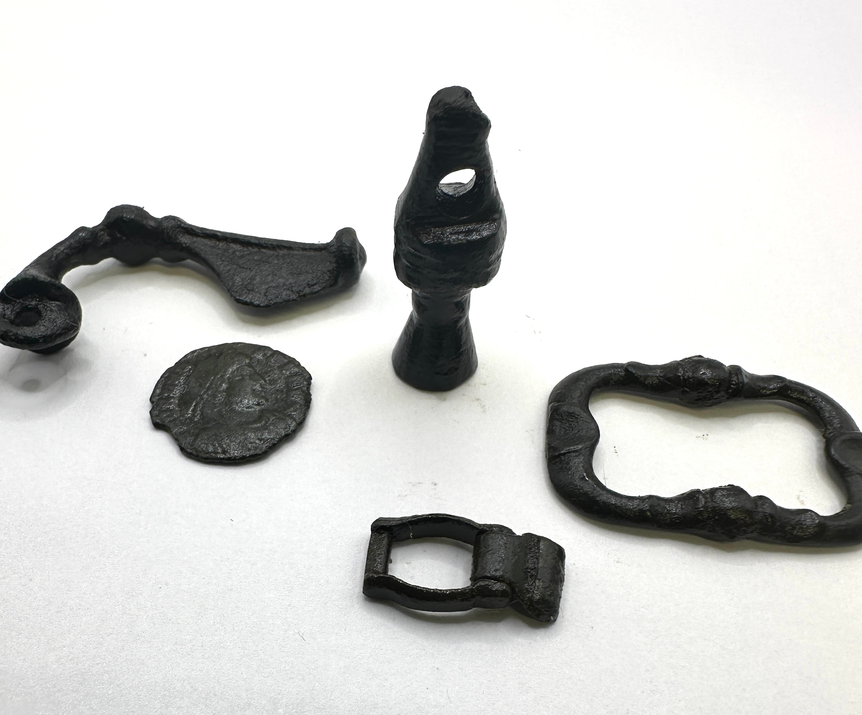 A group of five archaeological metal objects, likely composed of bronze or iron, dating from the ancient to early medieval periods. The collection includes a curved, elongated implement or handle fragment, consistent with a La Tène Celtiberian bronze fibula. Another piece, a conical object with an apical perforation, shows characteristics of an ancient Saka Scythian bronze finial or weight, possibly anthropomorphic. Also present are a small rectangular buckle with a hinged section and a larger, oblong buckle frame featuring decorative nodes, both consistent with medieval buckle forms. The fifth item is a small circular disc, resembling a coin or medallion, depicting an effaced human profile.