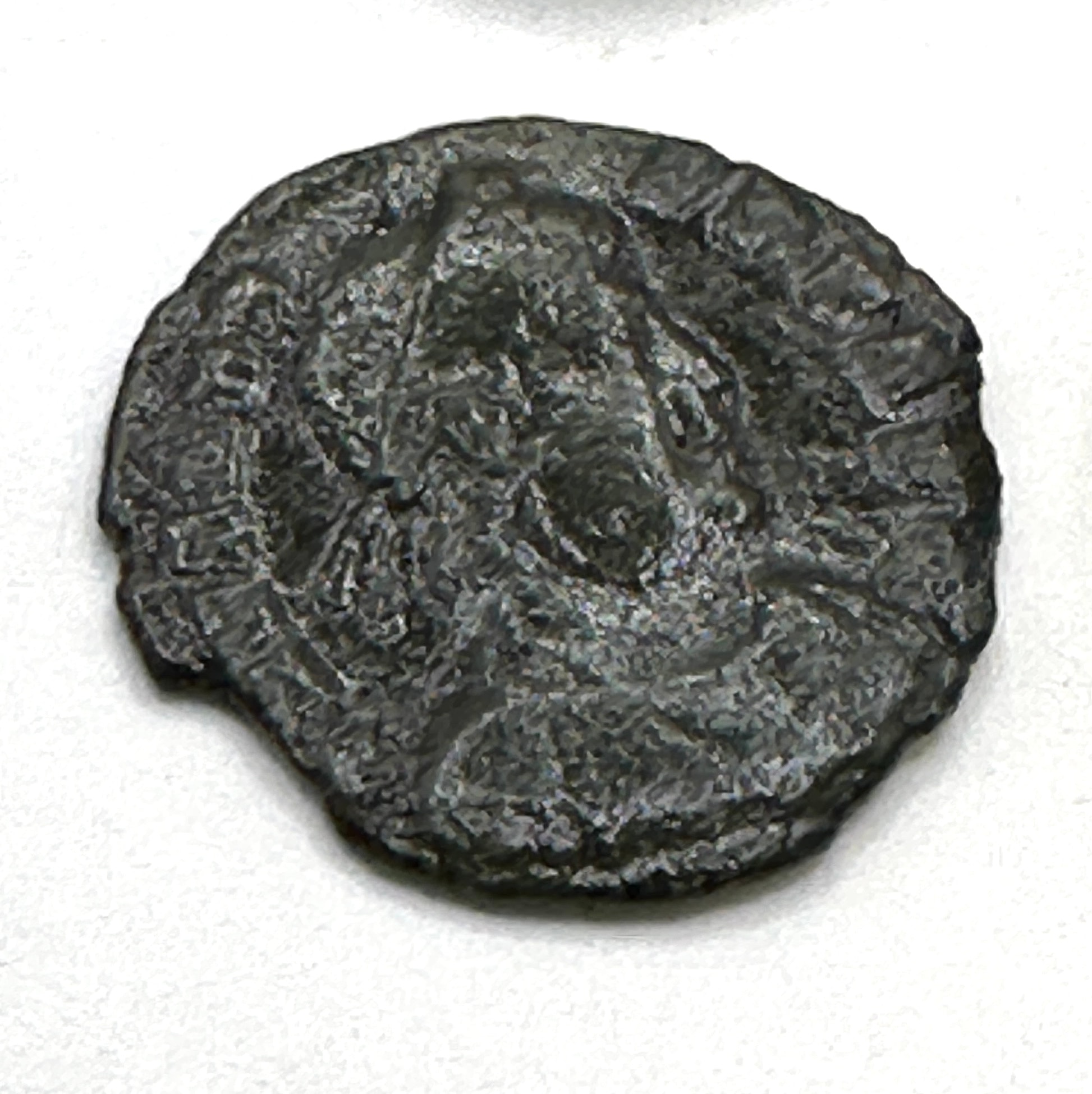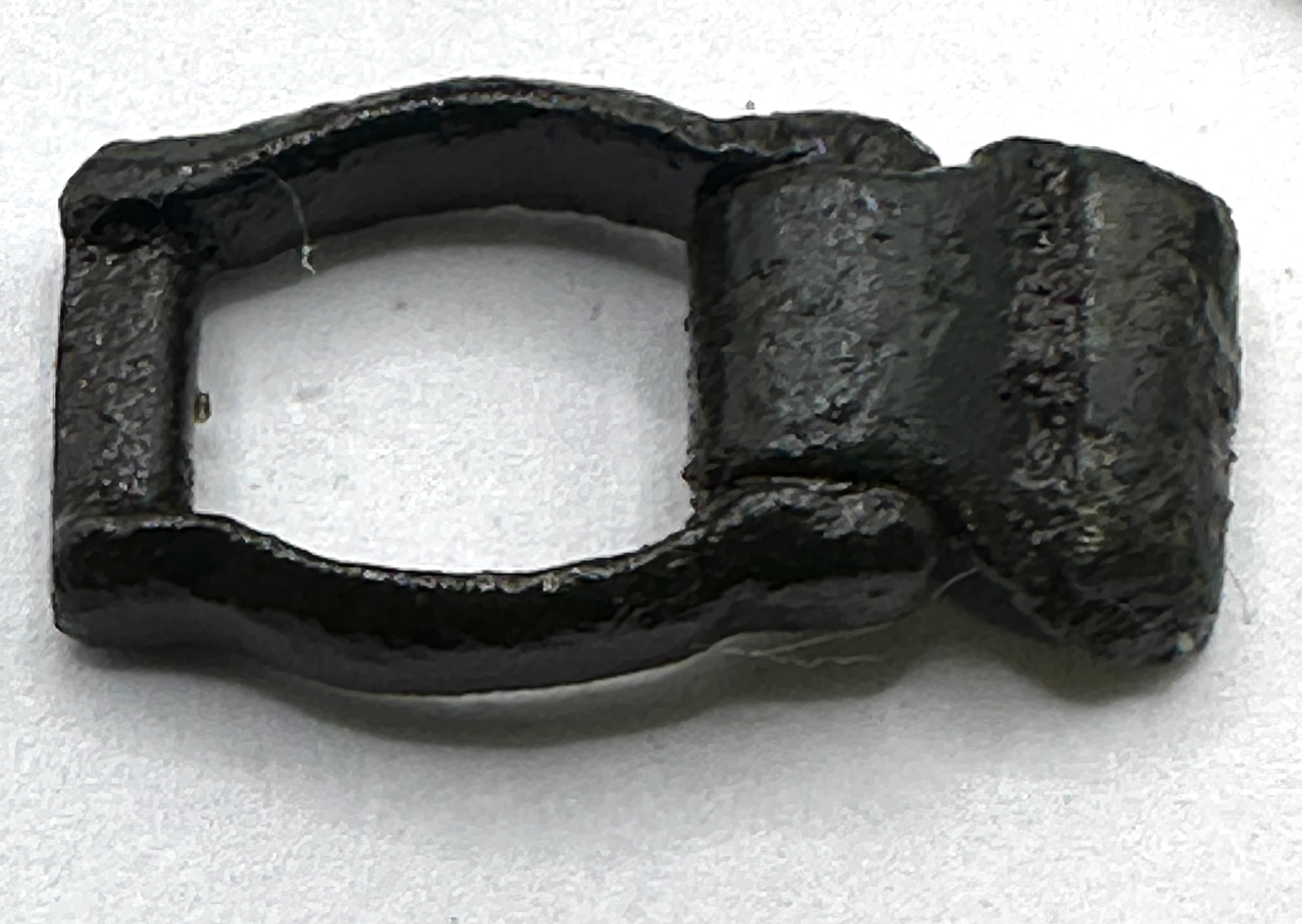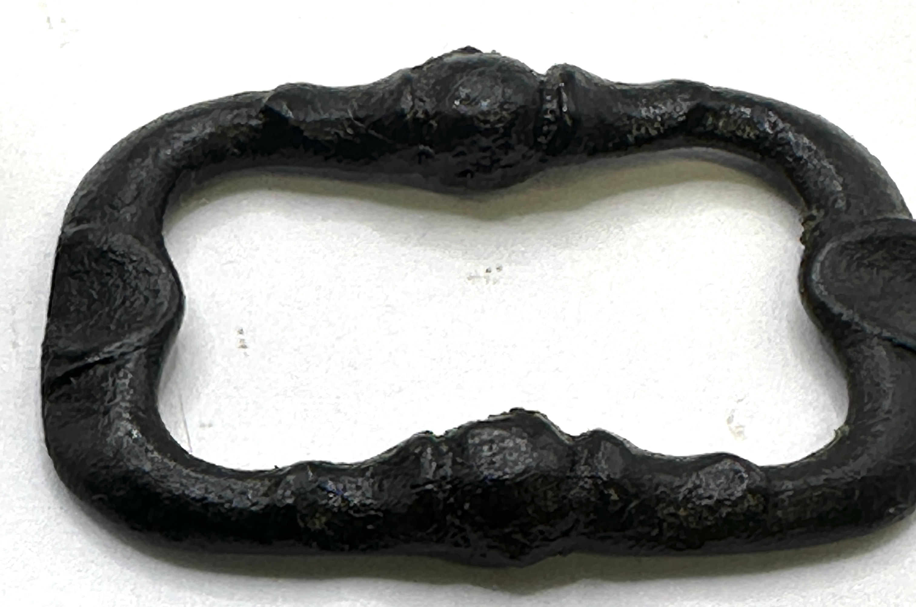 A group of five archaeological metal objects, likely composed of bronze or iron, dating from the ancient to early medieval periods. The collection includes a curved, elongated implement or handle fragment, consistent with a La Tène Celtiberian bronze fibula. Another piece, a conical object with an apical perforation, shows characteristics of an ancient Saka Scythian bronze finial or weight, possibly anthropomorphic. Also present are a small rectangular buckle with a hinged section and a larger, oblong buckle frame featuring decorative nodes, both consistent with medieval buckle forms. The fifth item is a small circular disc, resembling a coin or medallion, depicting an effaced human profile.
