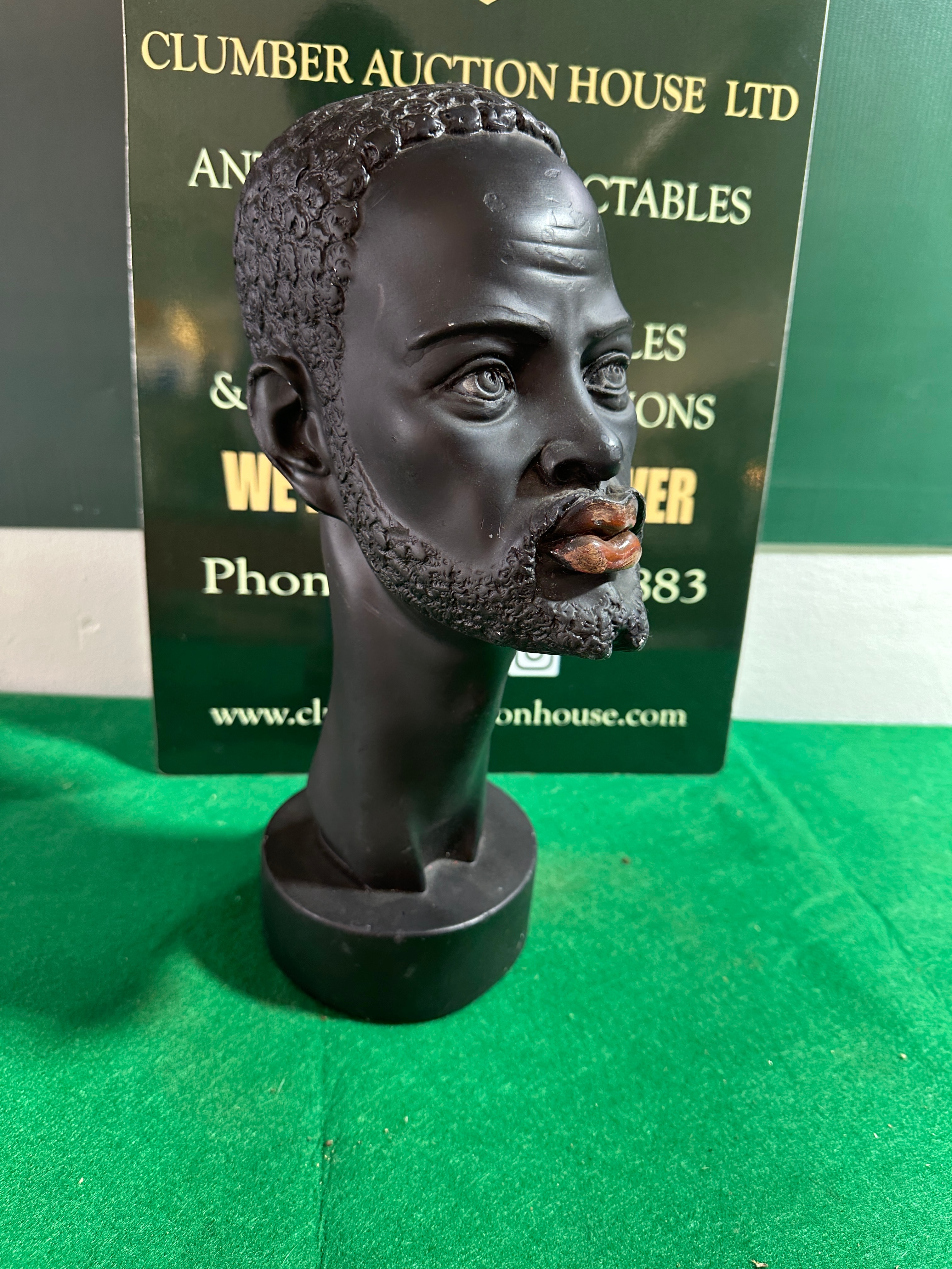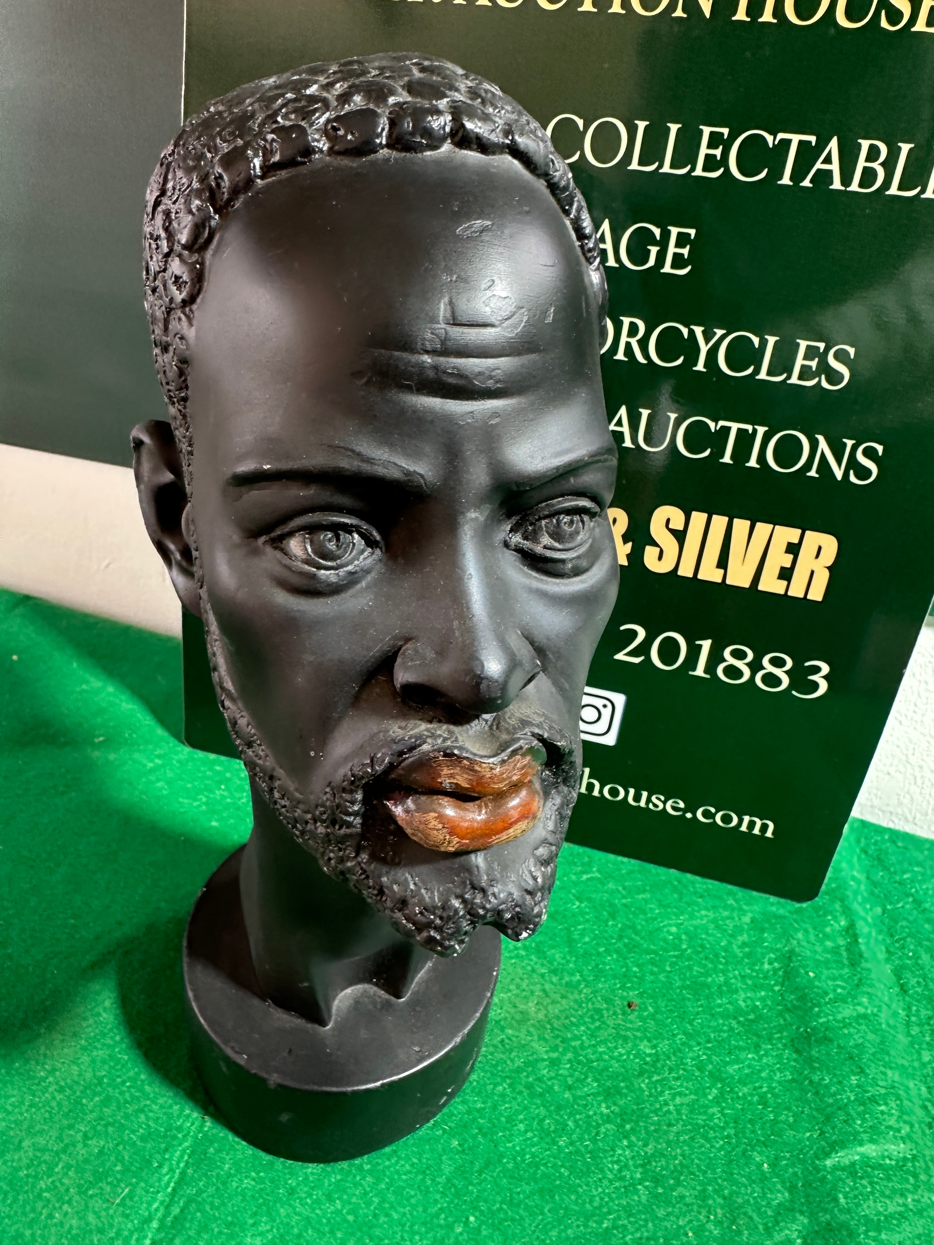 A vintage African male Chalkware sculpture, presented as a Giannelli style bearded male head bust. This stylized bust depicts the head and upper shoulders of a male figure, featuring a dark, uniform matte black finish. The figure has textured hair, a sculpted beard, and contrasting, glossy reddish-brown lips.