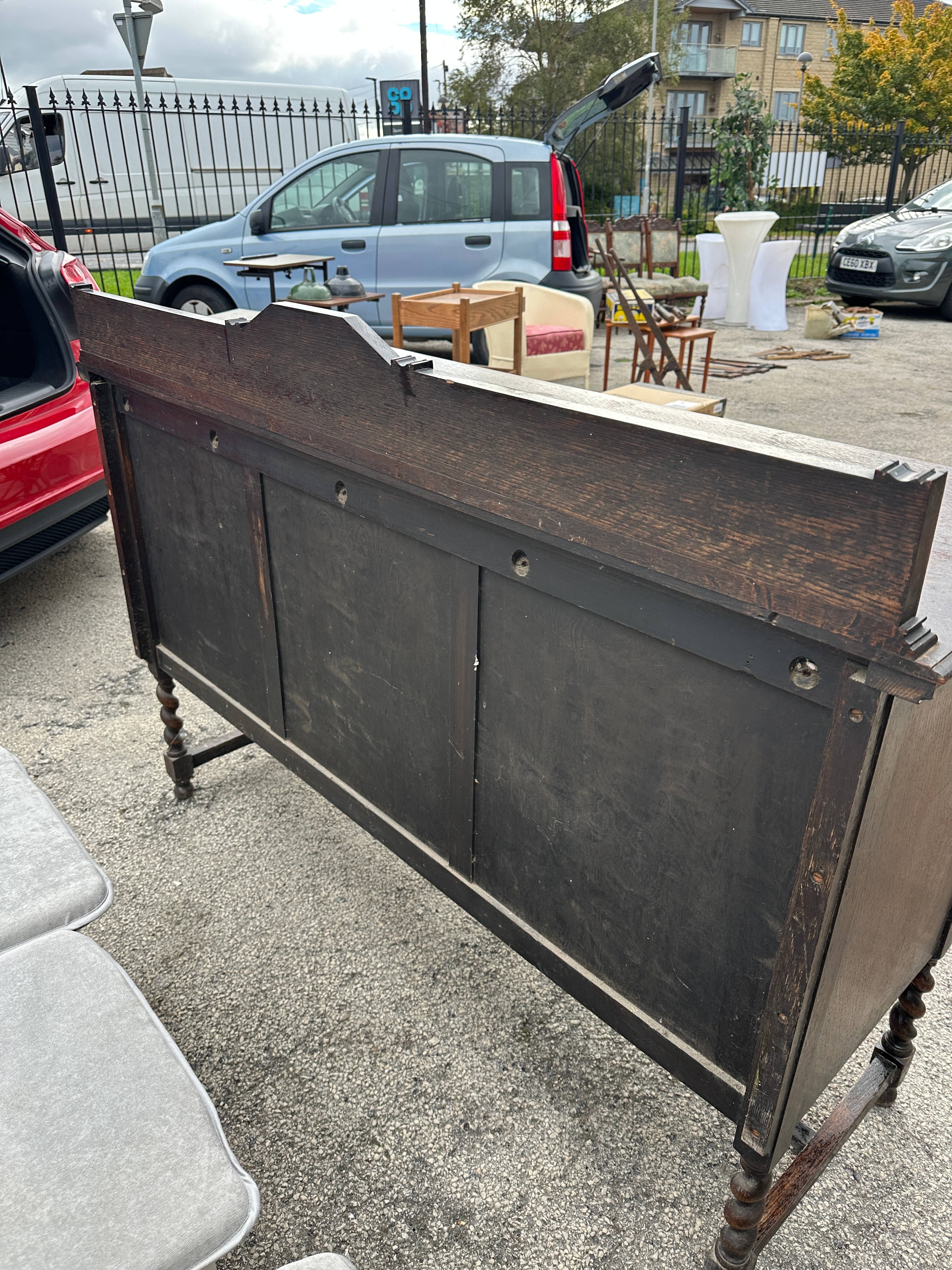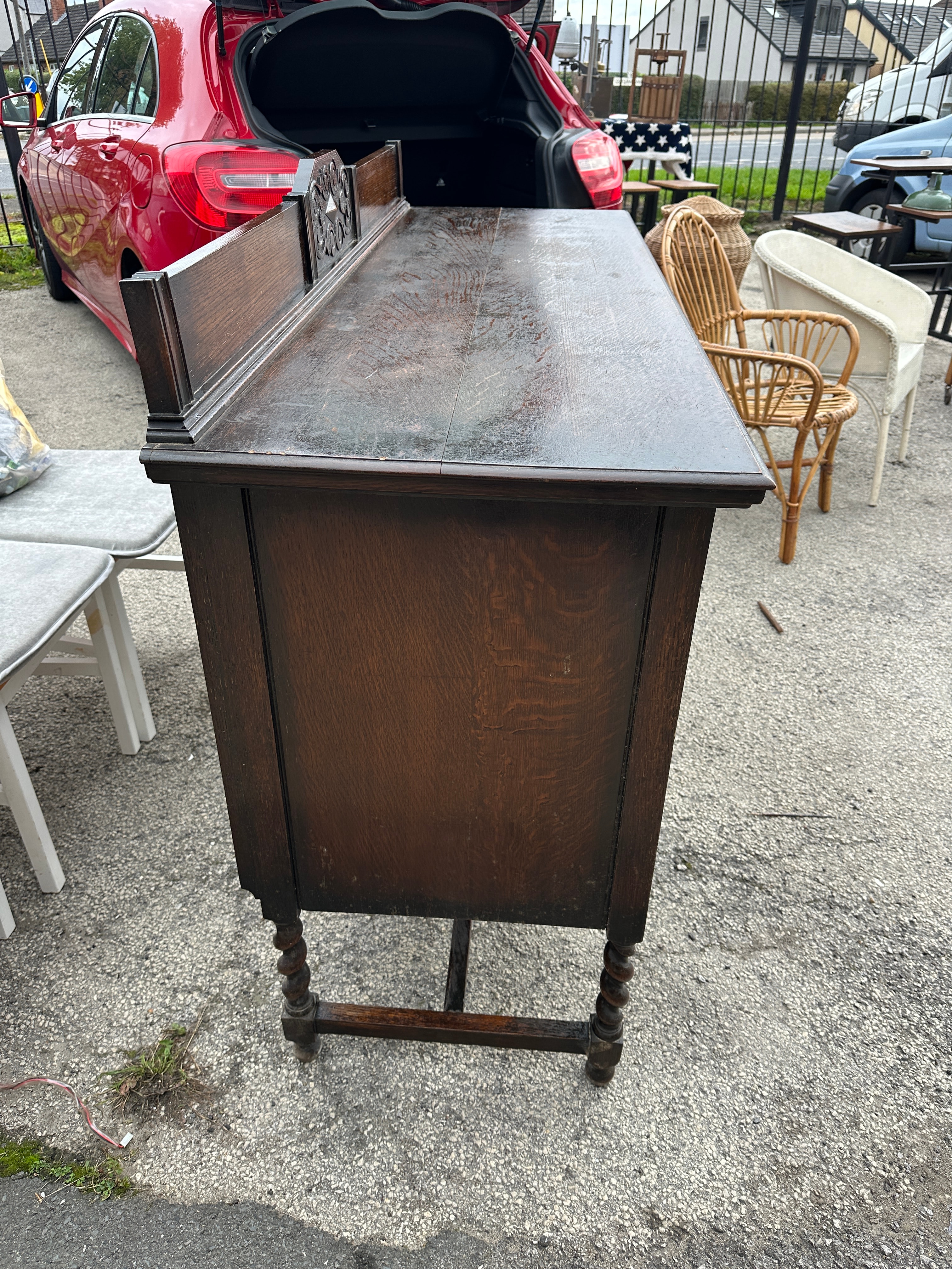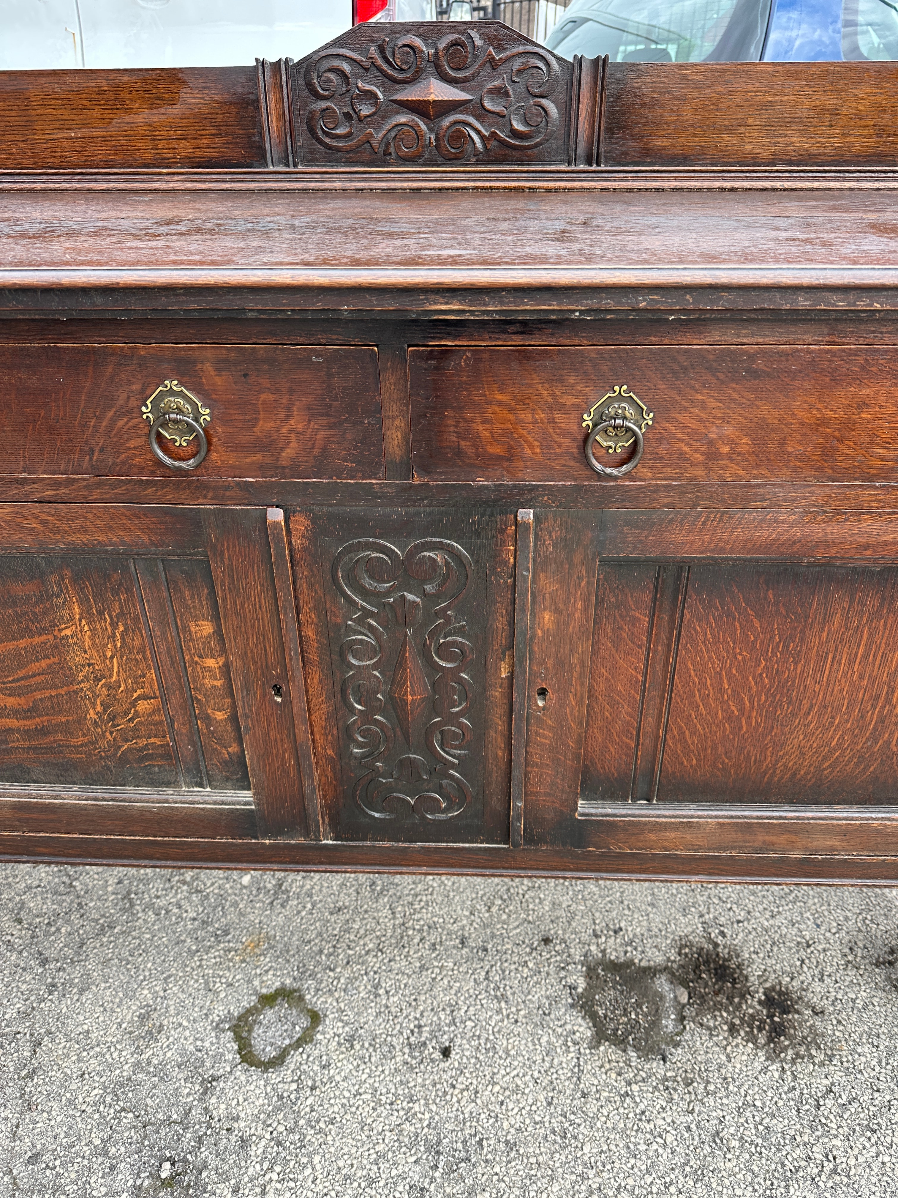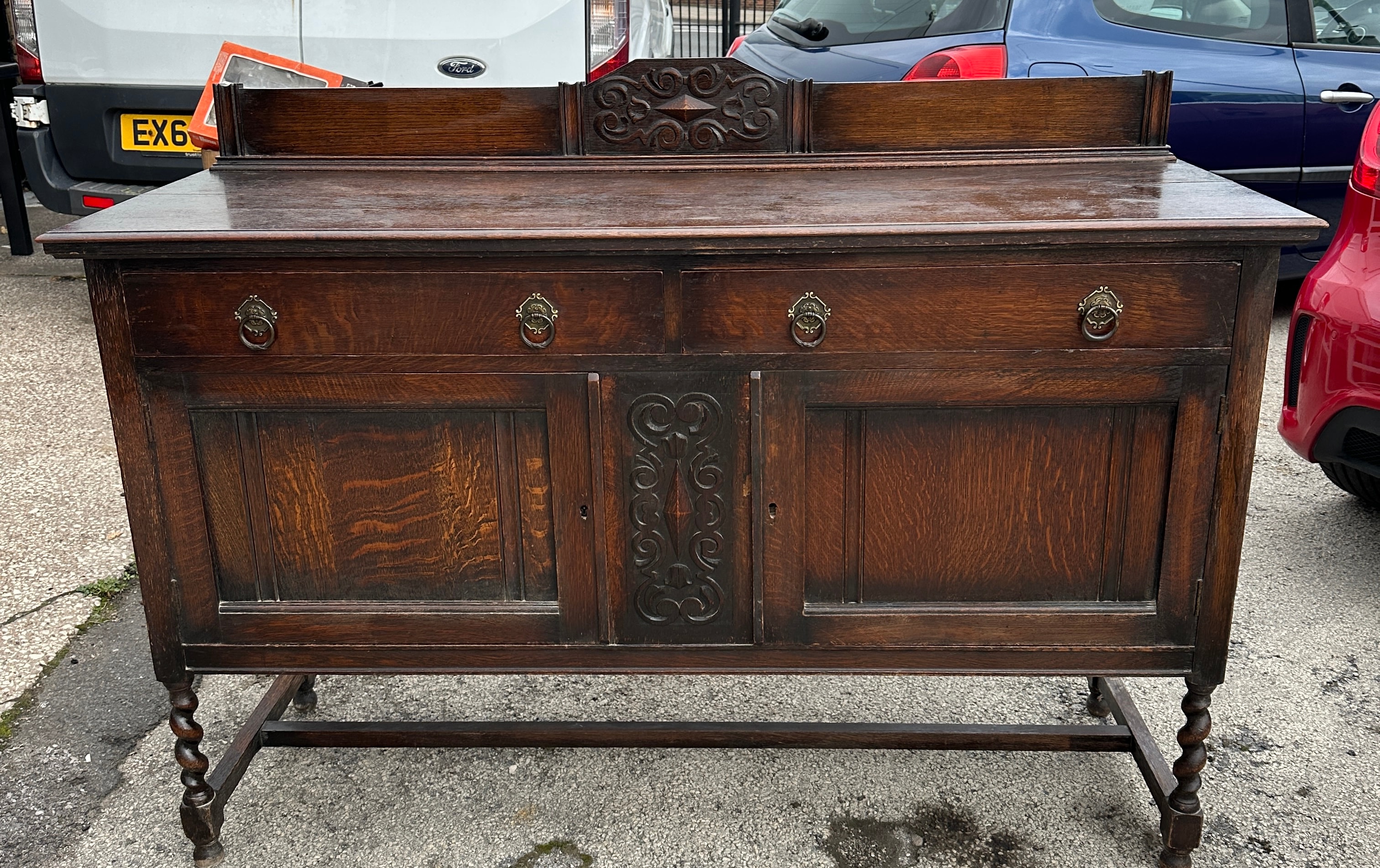 A robust dark-stained oak sideboard or server, exhibiting features characteristic of Jacobean Revival or Arts & Crafts styles. The piece comprises a raised back panel with a central carved scrollwork motif. Below the top surface are two drawers fitted with decorative brass-toned ring pulls. These are positioned above a central carved cupboard door flanked by two plain paneled cupboard doors. The sideboard stands on four distinctive barley-twist legs joined by a stretcher base. The material displays prominent quarter-sawn oak grain throughout. No discernible text or markings are present.