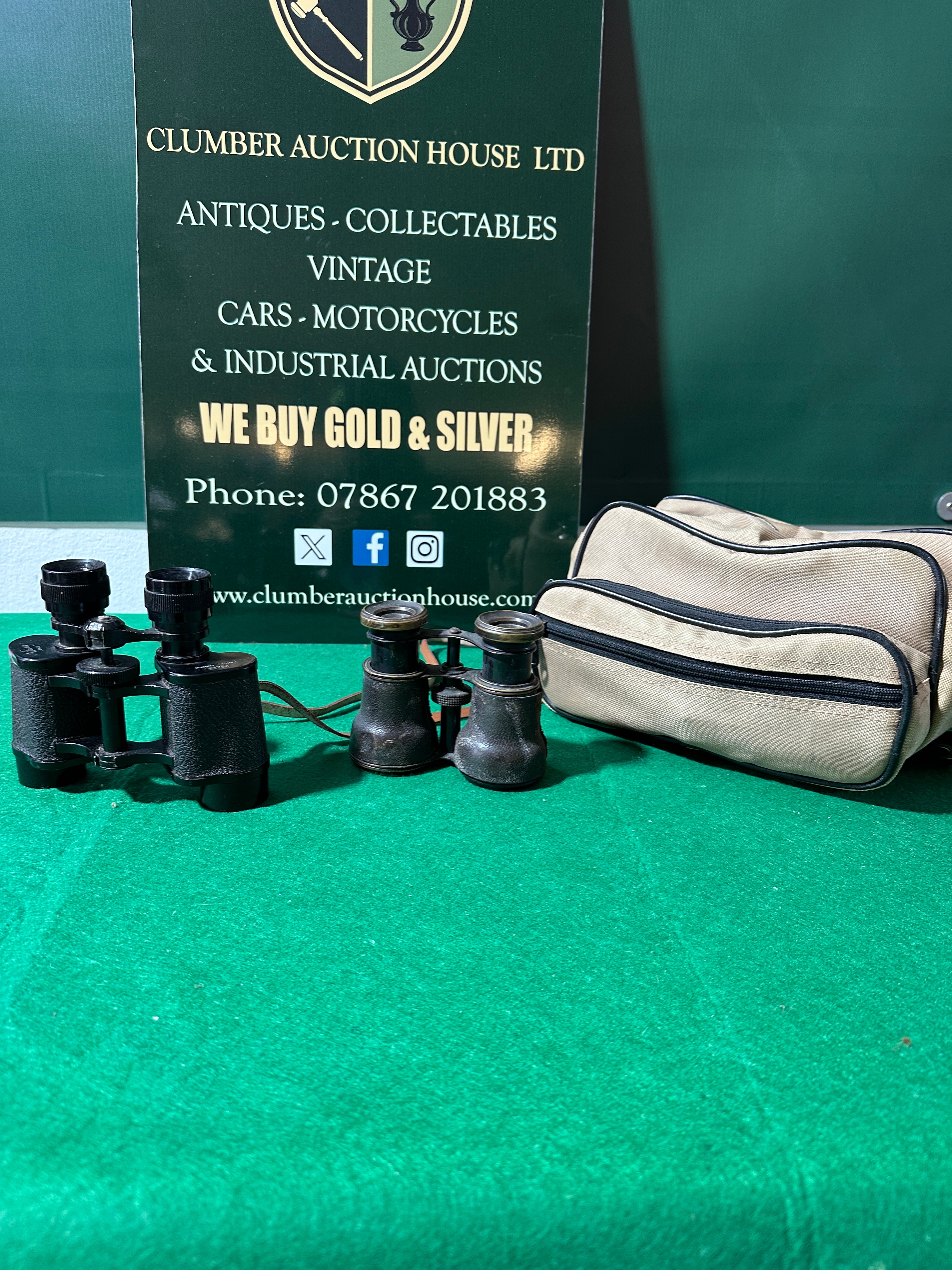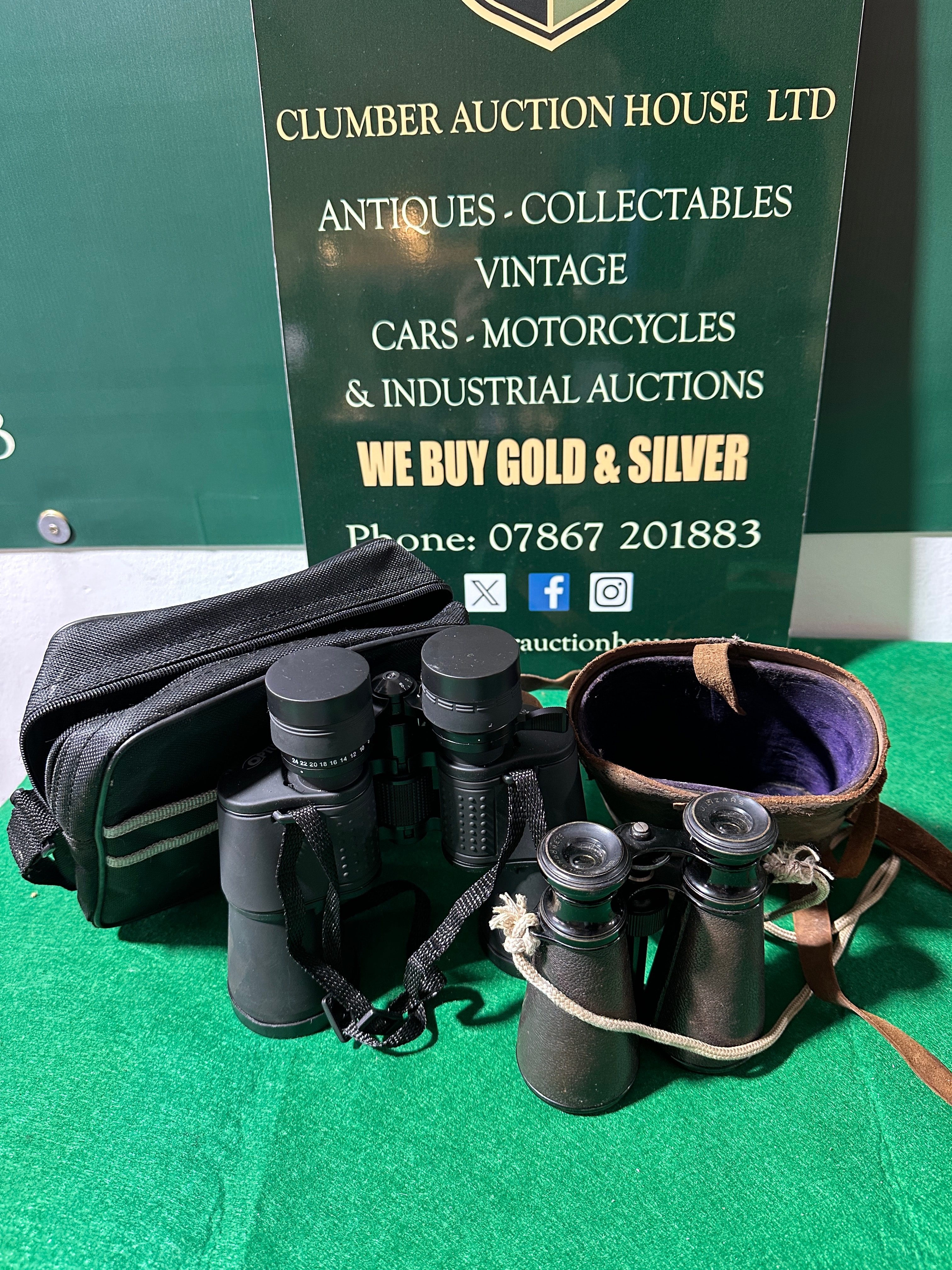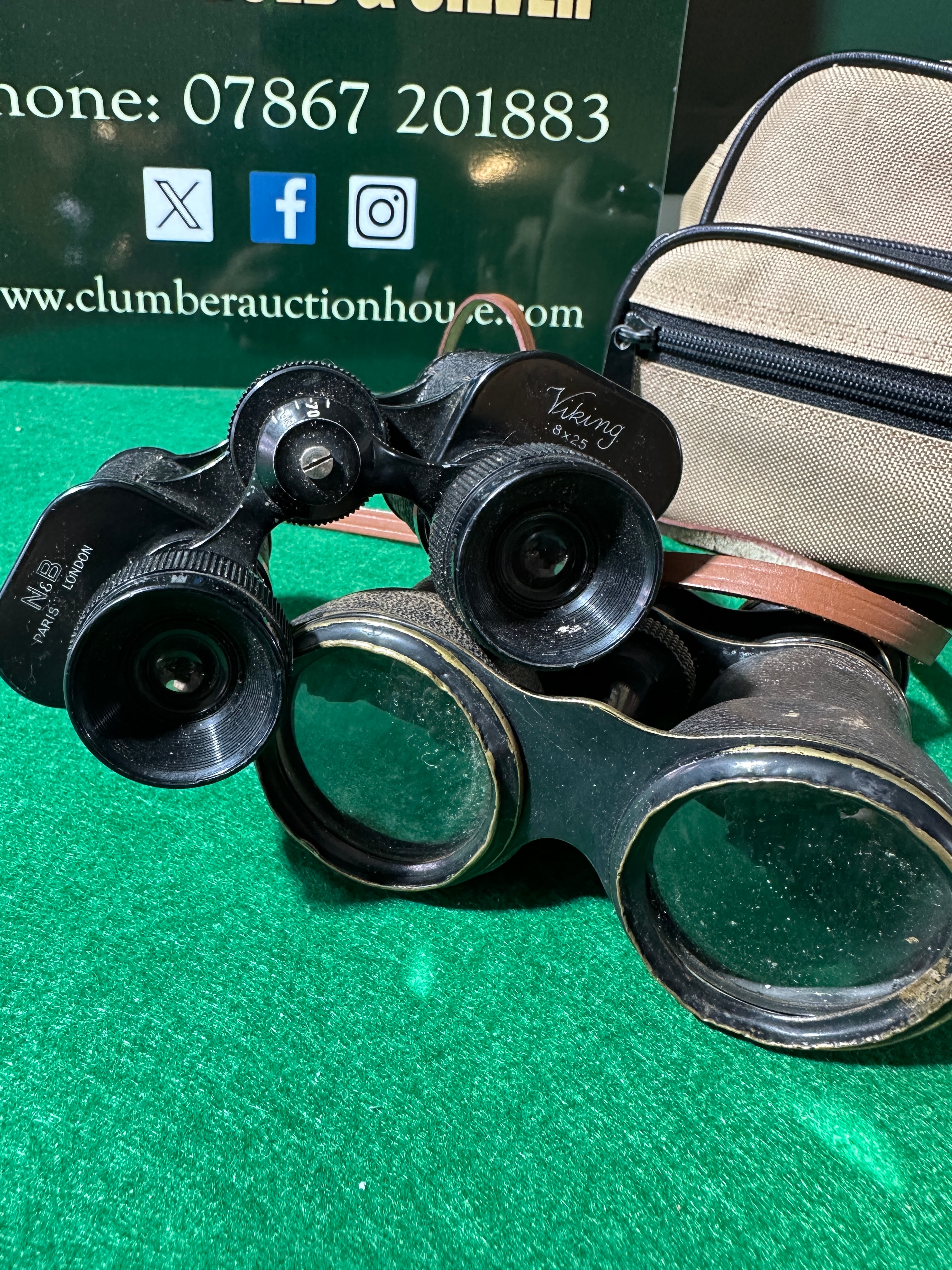 This lot features two pairs of optical instruments. The first is a modern pair of Viking 8×25 OPTUS roof-prism binoculars, finished in black, with a diopter scale reading ’24 22 20 18 16 14′ on the eyepiece. They are accompanied by a black woven neck strap and a black zippered soft case. The second item consists of vintage Galilean opera glasses, marked ‘STARS’ on one eyepiece and ‘NB PORTER LONDON’ on the other. They feature a dark textured finish with brass-toned accents and a light braided rope strap. This pair is presented with a small brown leatherette pouch with a purple lining, and a larger, generic tan canvas-style zippered soft case. All visible text is in English.
