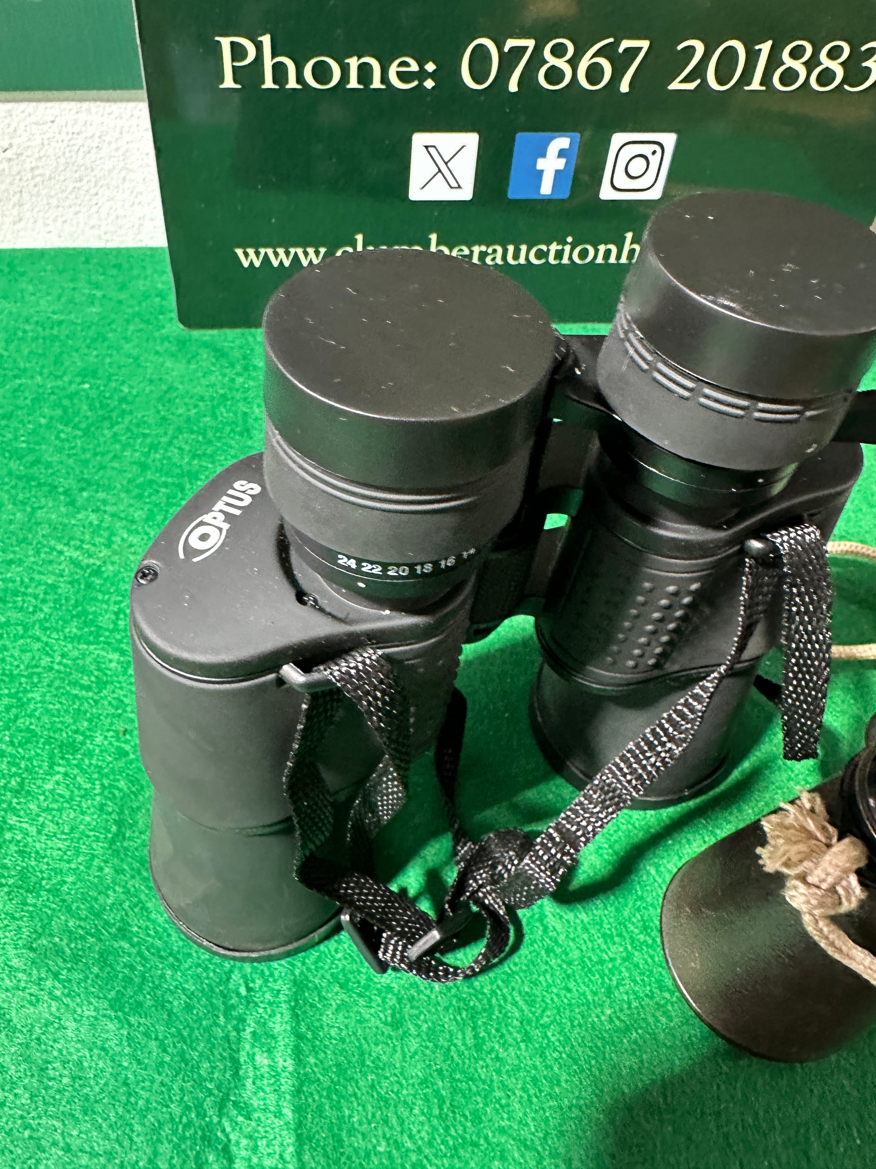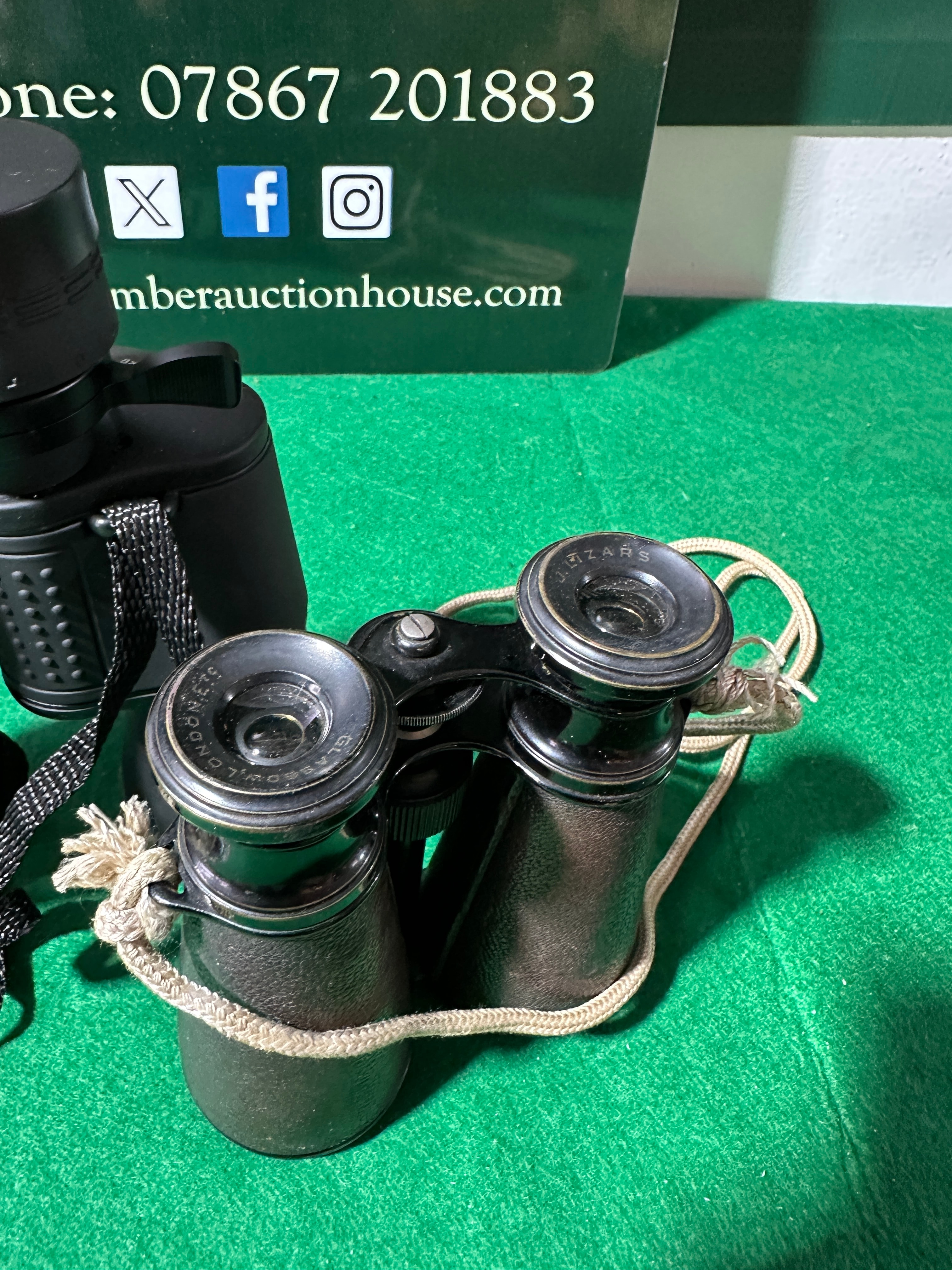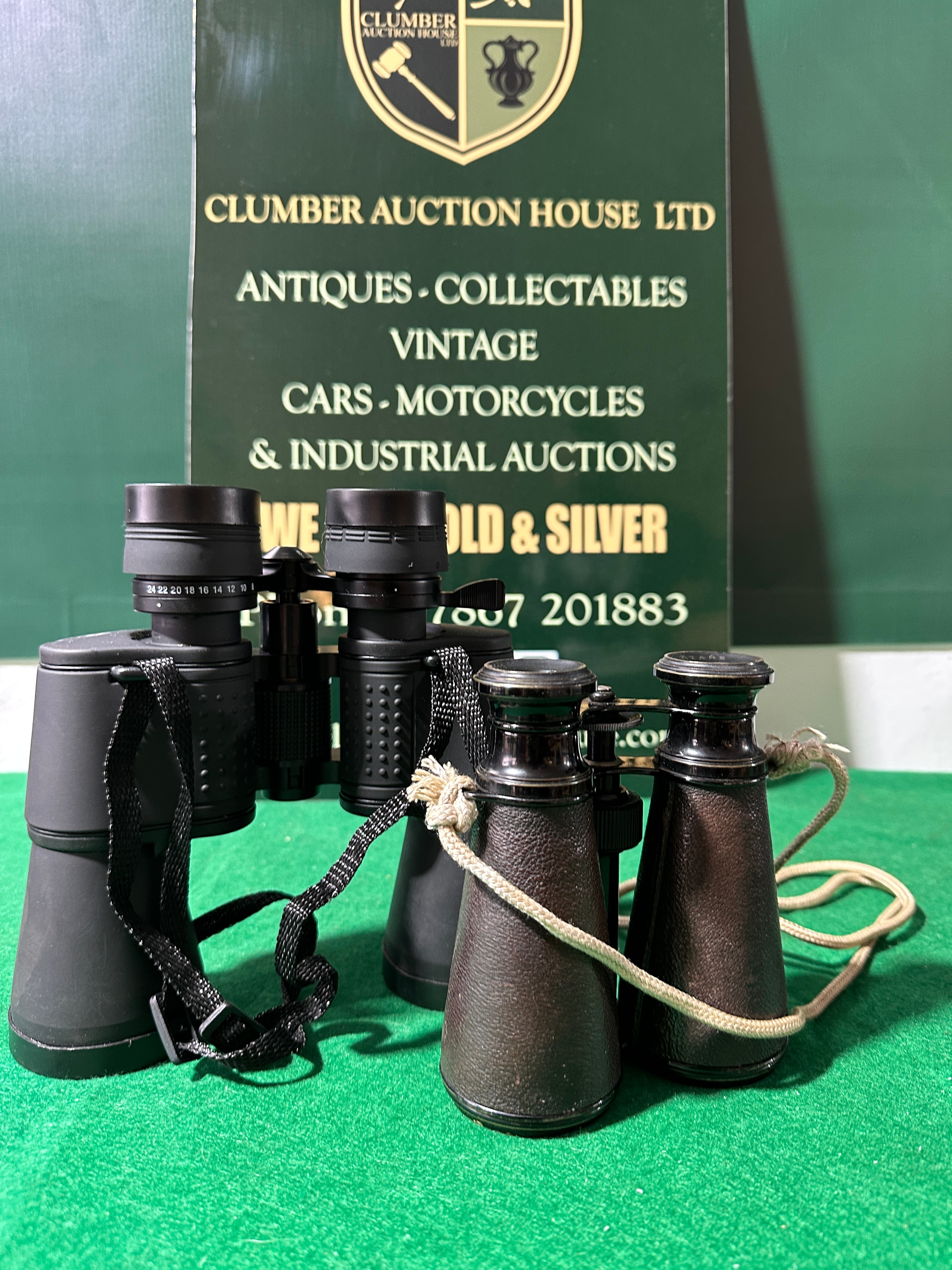 This lot features two pairs of optical instruments. The first is a modern pair of Viking 8×25 OPTUS roof-prism binoculars, finished in black, with a diopter scale reading ’24 22 20 18 16 14′ on the eyepiece. They are accompanied by a black woven neck strap and a black zippered soft case. The second item consists of vintage Galilean opera glasses, marked ‘STARS’ on one eyepiece and ‘NB PORTER LONDON’ on the other. They feature a dark textured finish with brass-toned accents and a light braided rope strap. This pair is presented with a small brown leatherette pouch with a purple lining, and a larger, generic tan canvas-style zippered soft case. All visible text is in English.