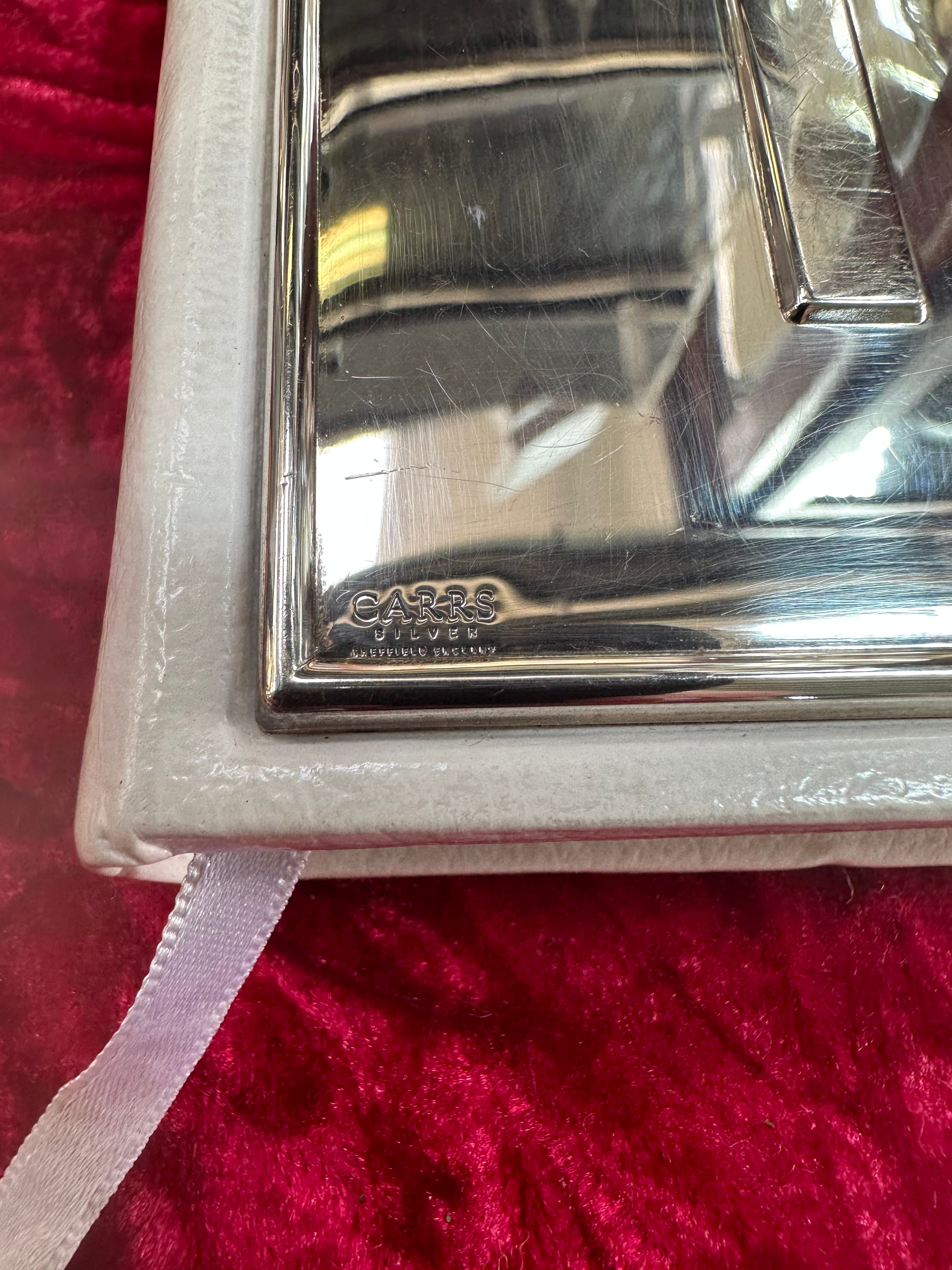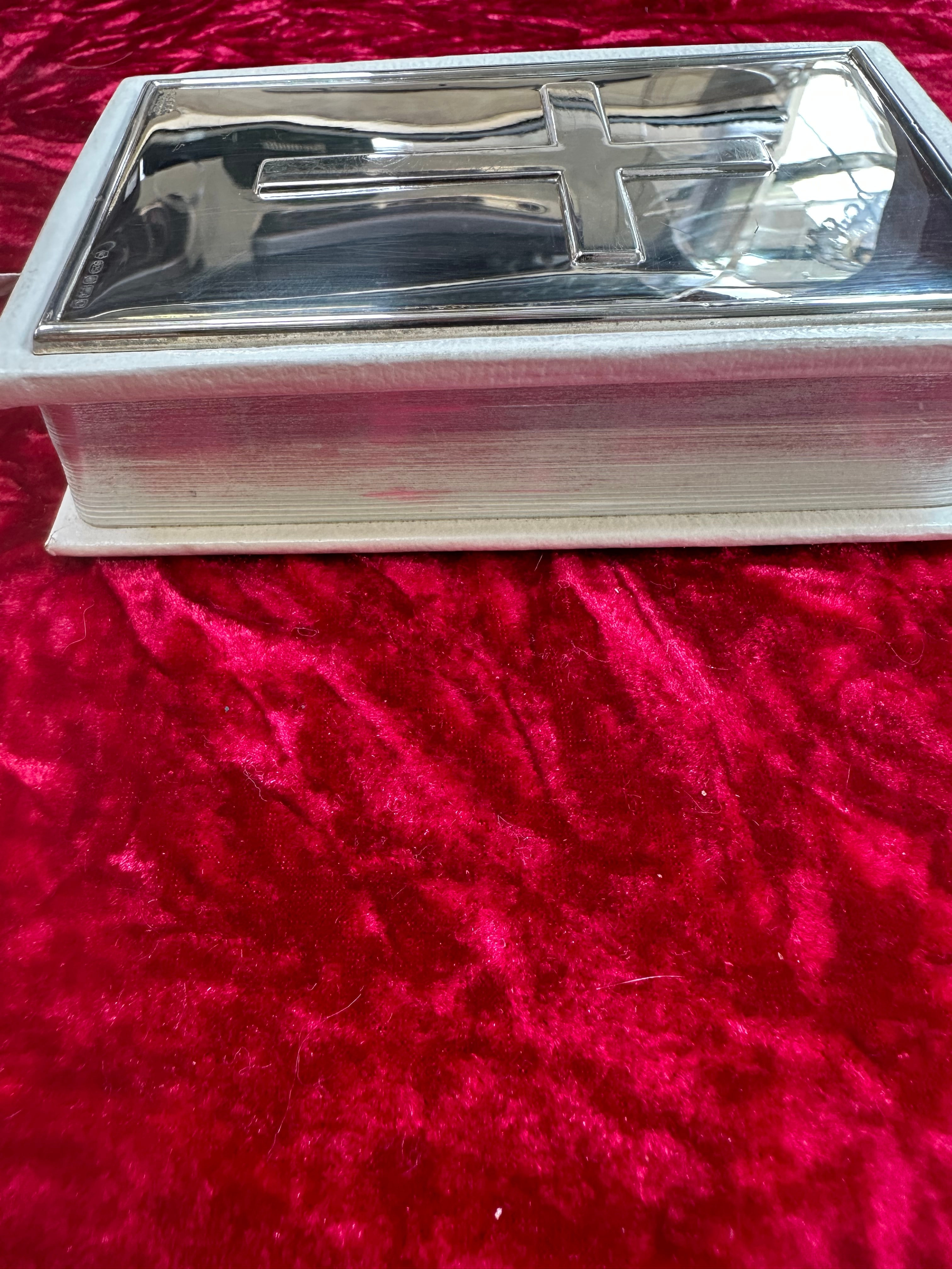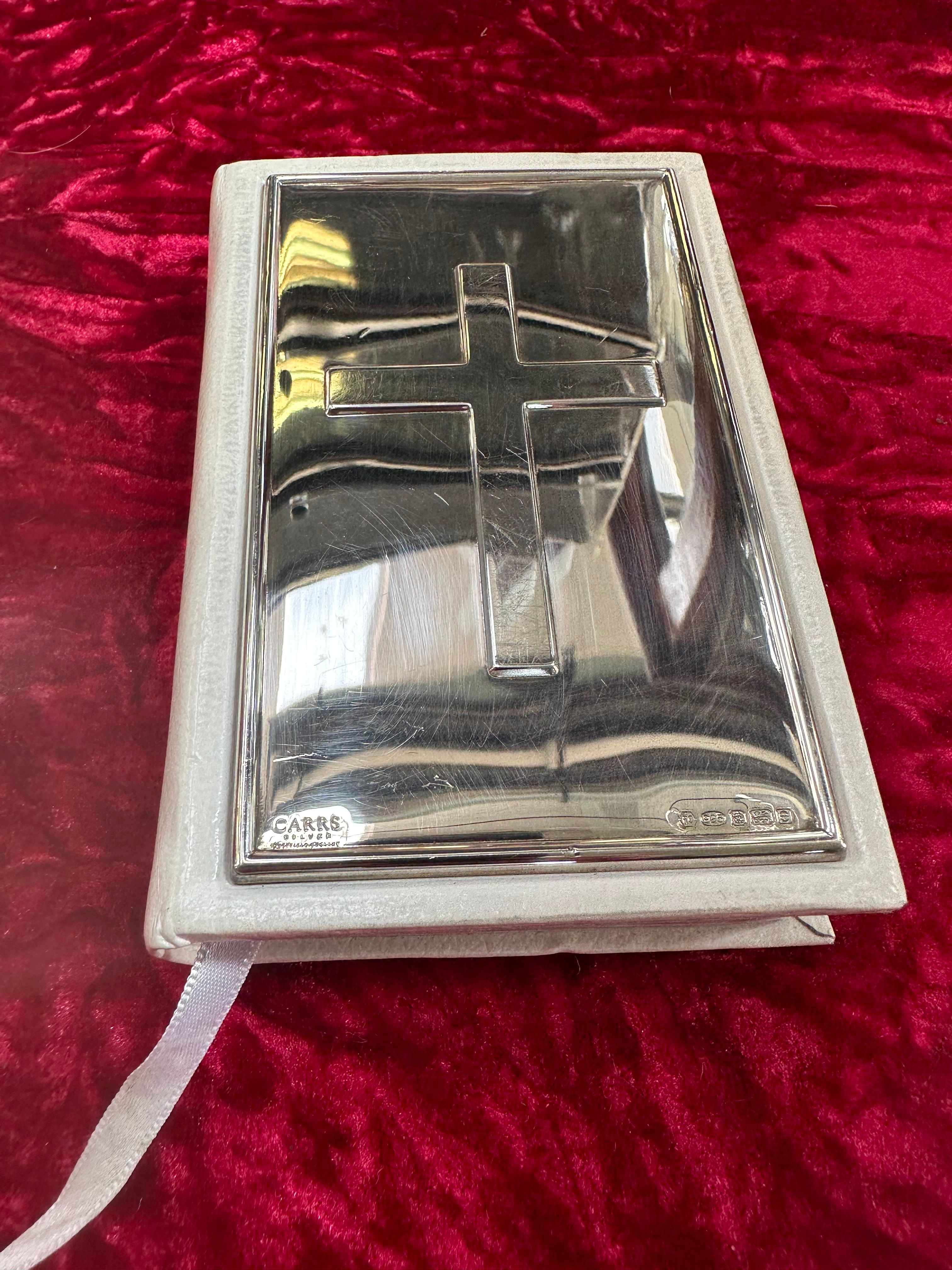 A devotional text featuring a white leather or faux leather cover, adorned with a sterling silver-tone metal plaque by Carrs Sheffield England. The plaque is embossed with a cross motif and bears an indistinct small hallmark on the lower right. An accompanying ribbon bookmark is present. Also included is a silver-tone link bracelet, composed of numerous interconnected oval links, each bezel-set with a marquise-cut blue stone, likely glass or synthetic. It is secured by a lobster clasp.