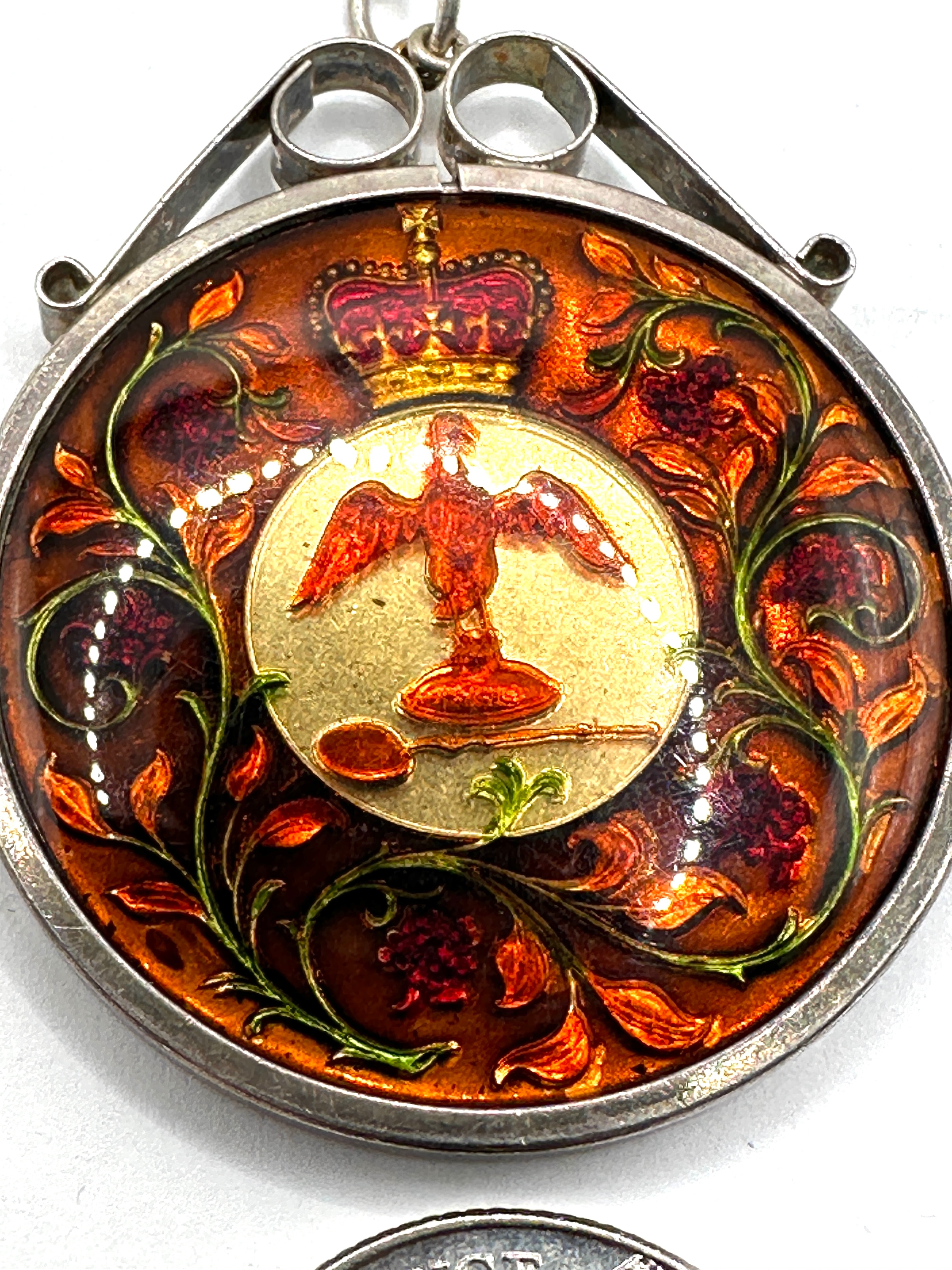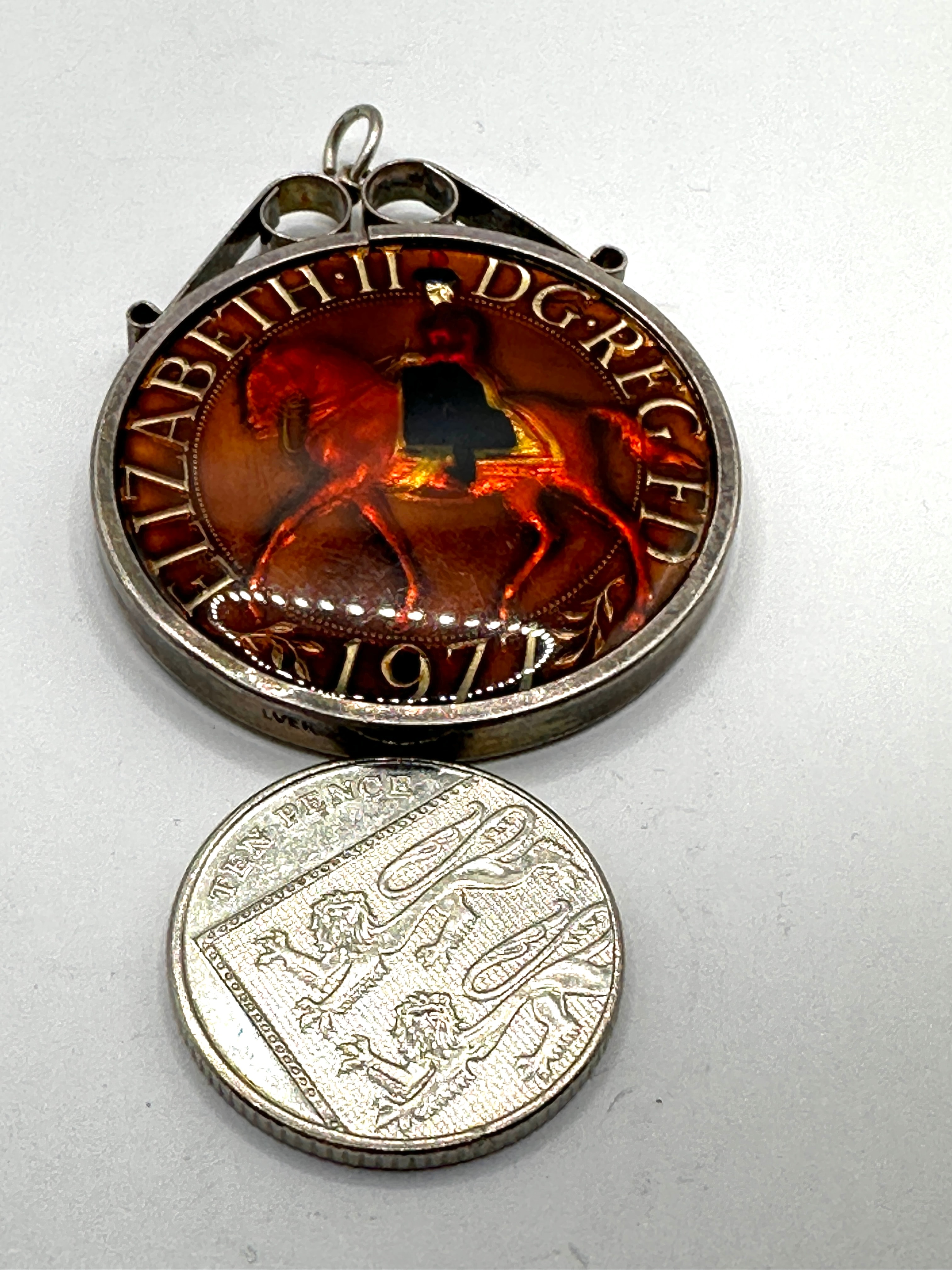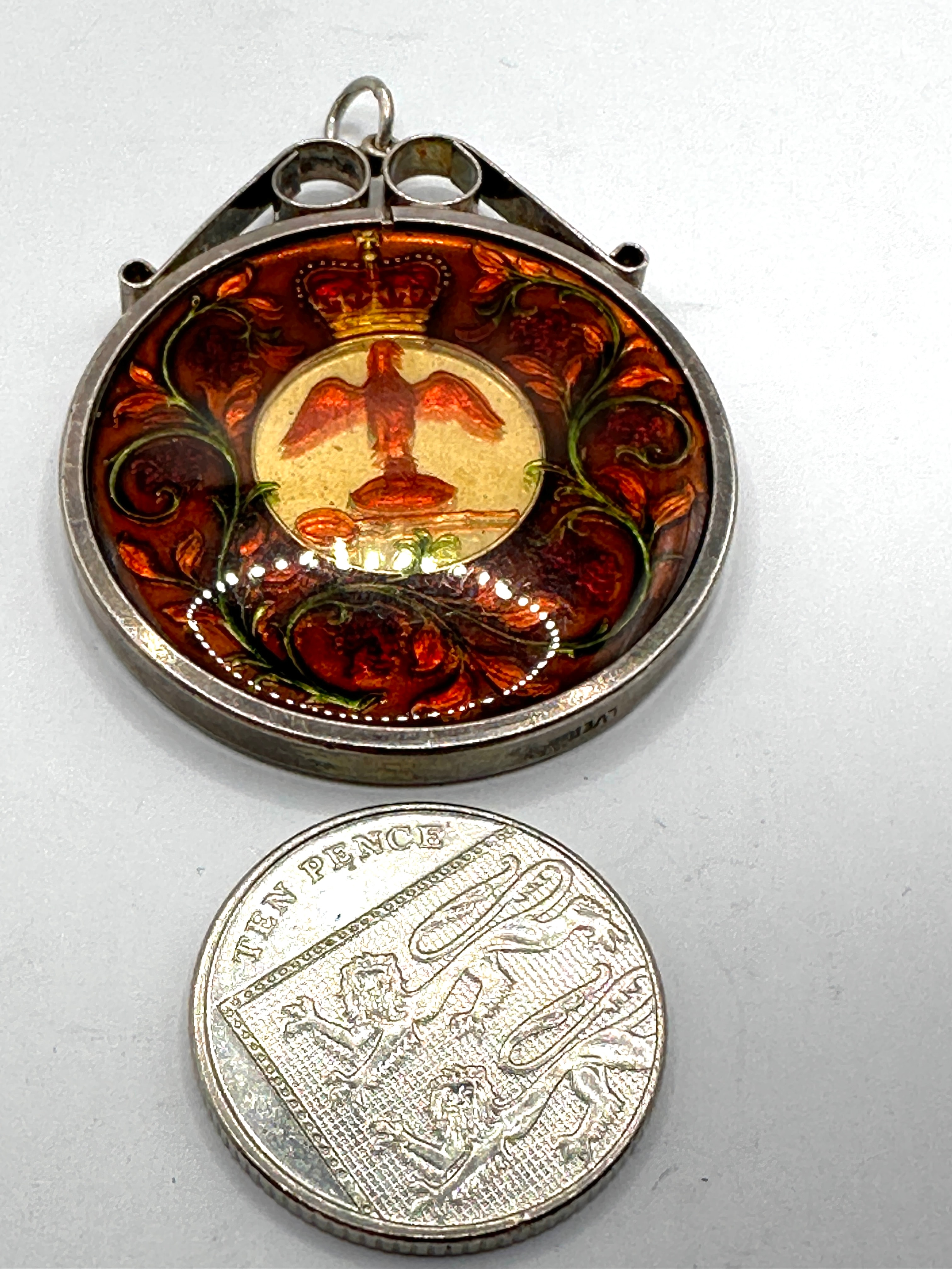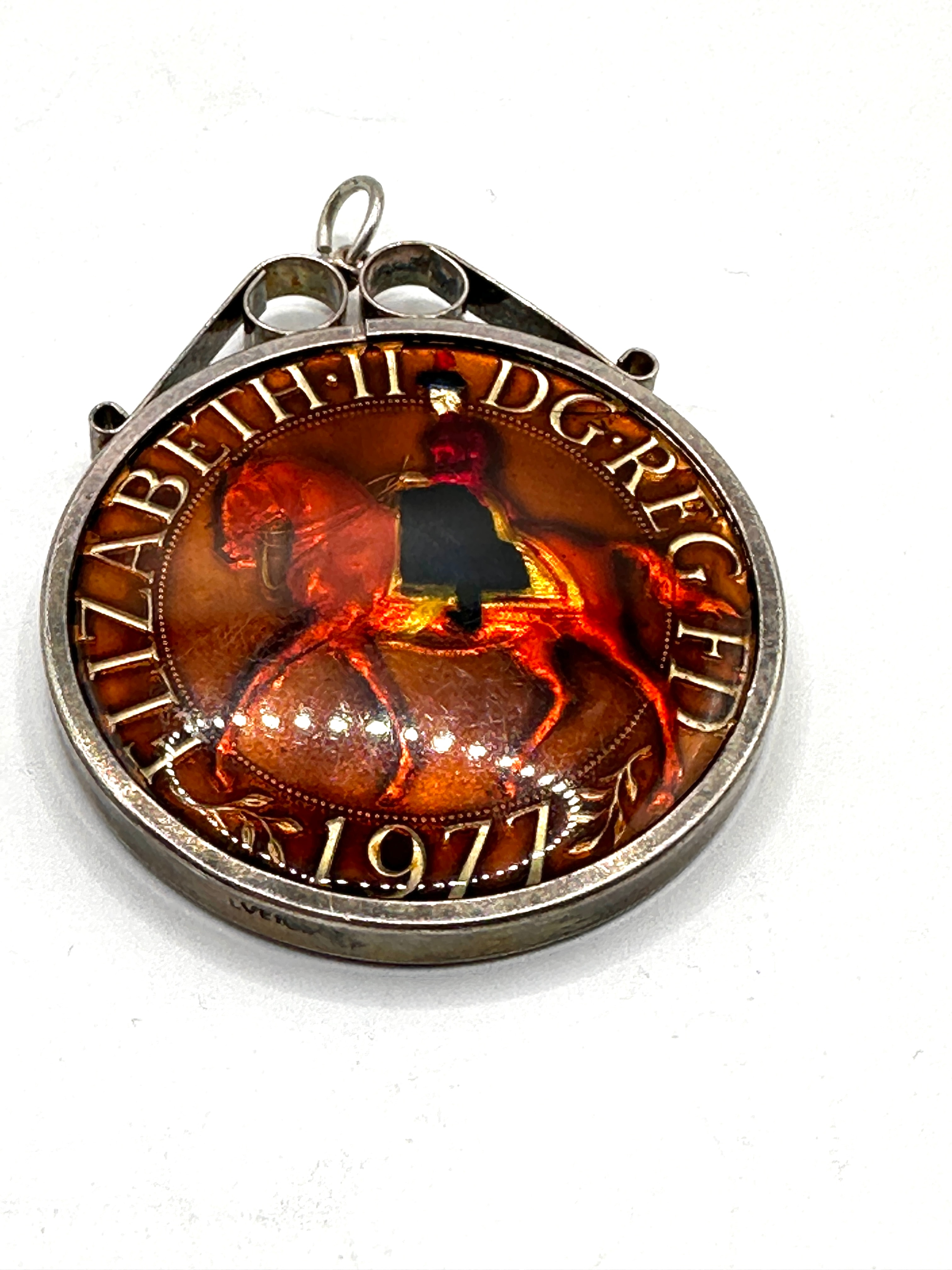 A circular silver-toned metal pendant, featuring a bail for suspension, which encases a coin dated 1971 that has been decoratively enameled. The obverse side displays a translucent, reddish-brown enamel over an image of Queen Elizabeth II on horseback, with the inscription ‘ELIZABETH II DG REG FD’ and the visible year ‘1971’. The reverse side features an enameled central motif of a crowned eagle-like bird, set against a gold-colored ground and surrounded by a rich brown, red, and green floral enamel border. A faint ‘SILVER’ marking is visible on the edge of the pendant frame.