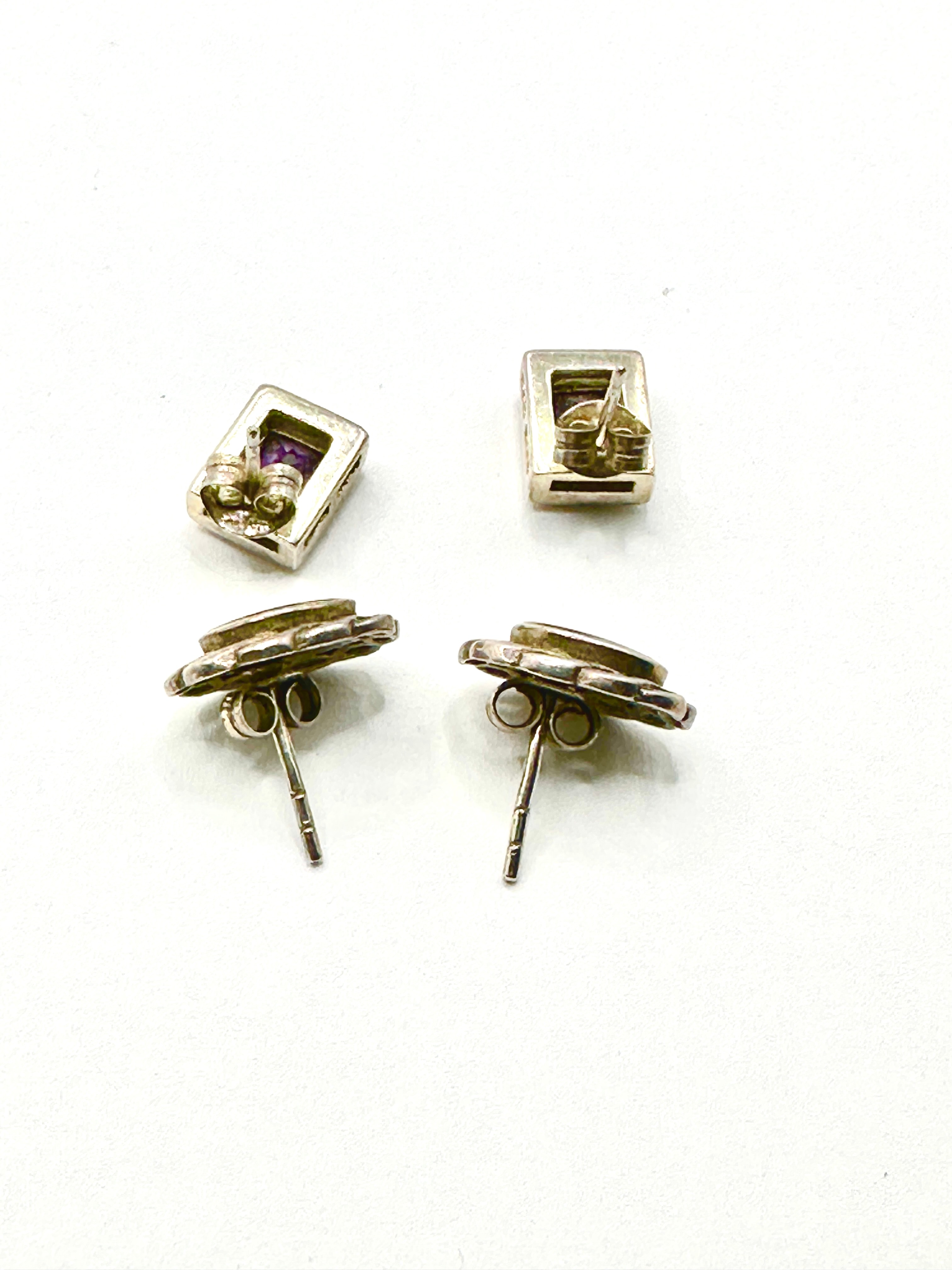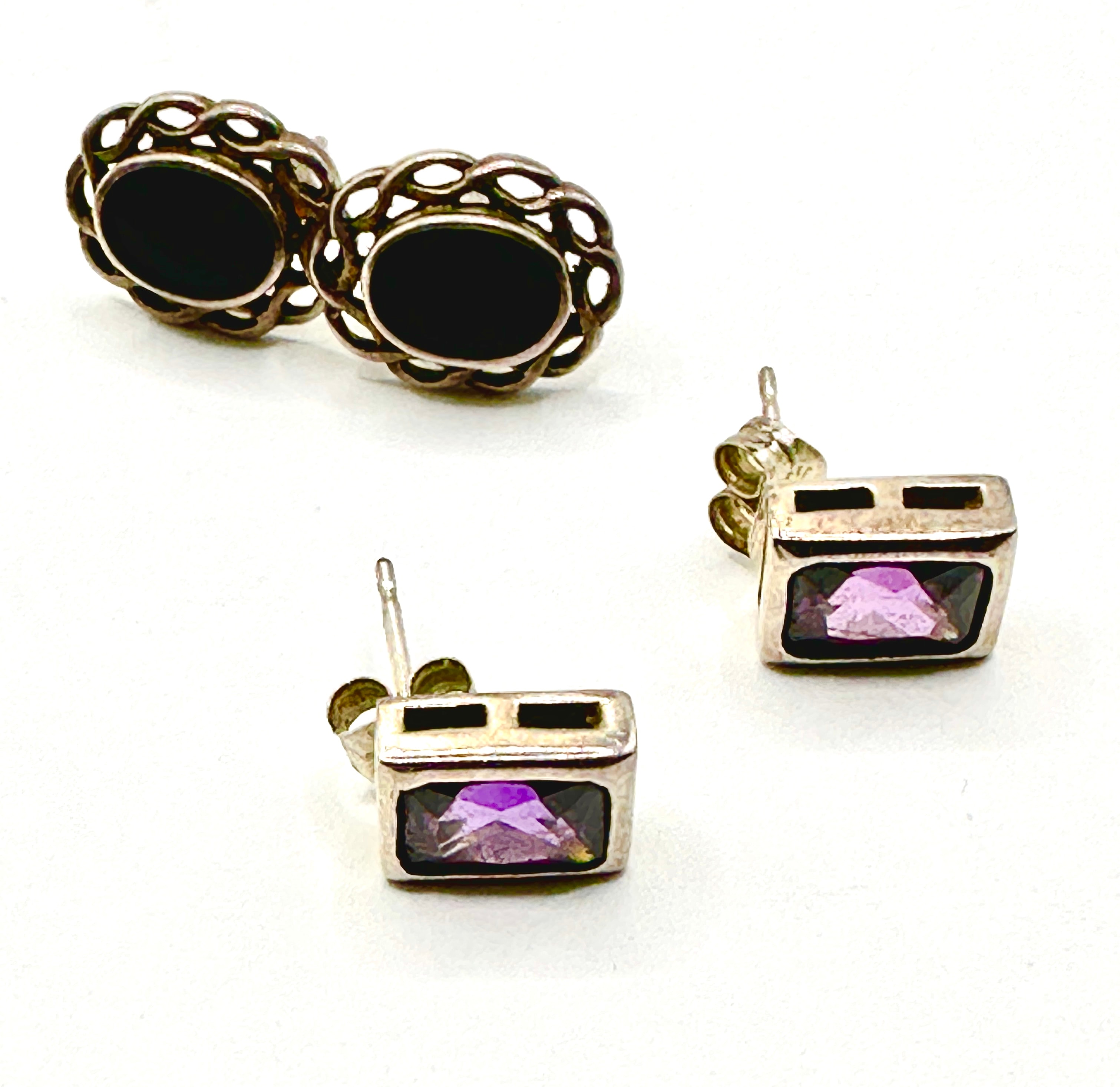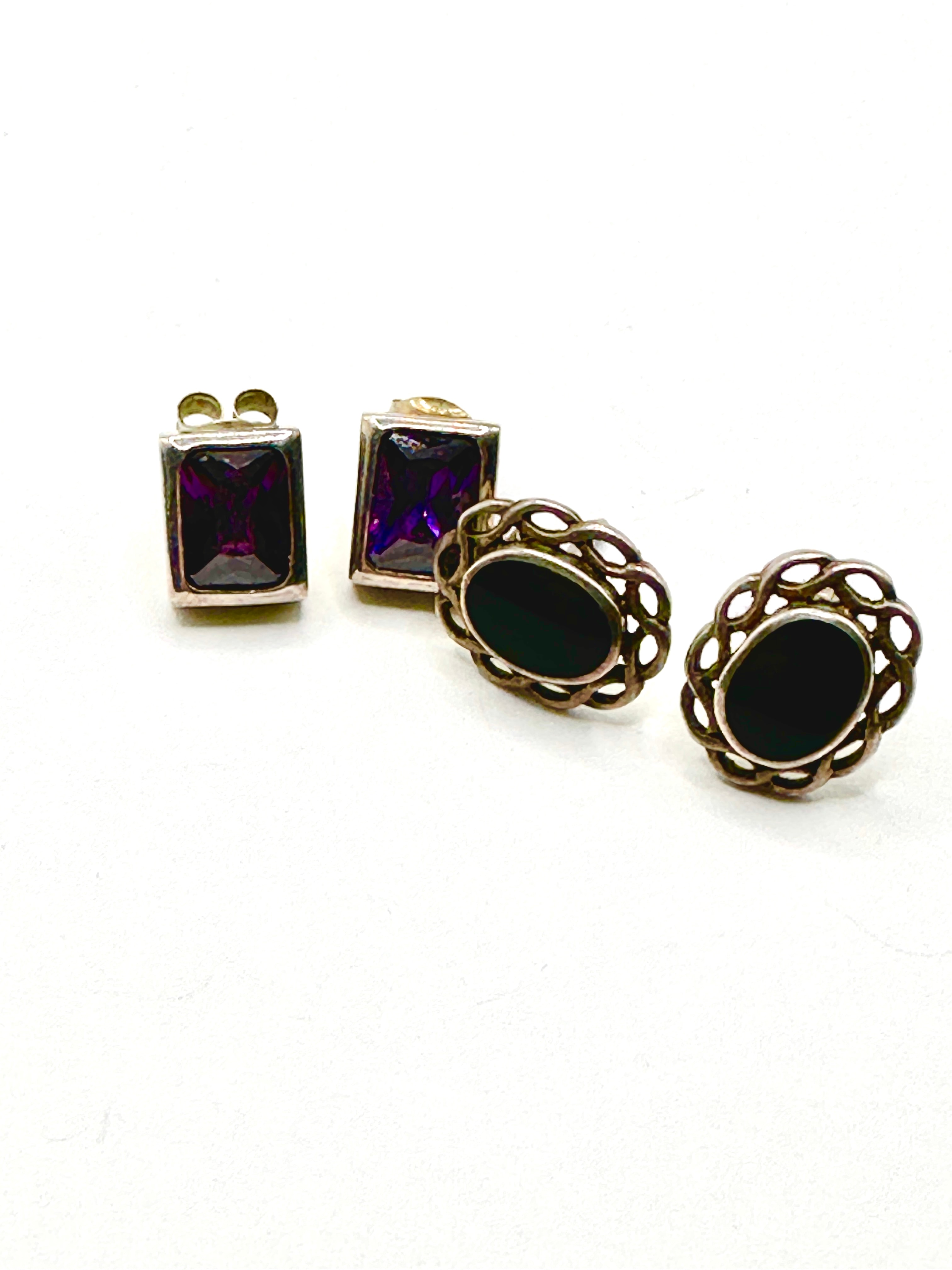 This lot comprises two pairs of silver-toned stud earrings. The first pair features oval, opaque black cabochon onyx stones set within an ornate, openwork border. The second pair consists of rectangular studs, each set with a faceted, translucent purple stone, distinguished by two small rectangular cut-outs above the stone. Both pairs are constructed with post backs. No legible manufacturer’s marks or textual inscriptions are visible.