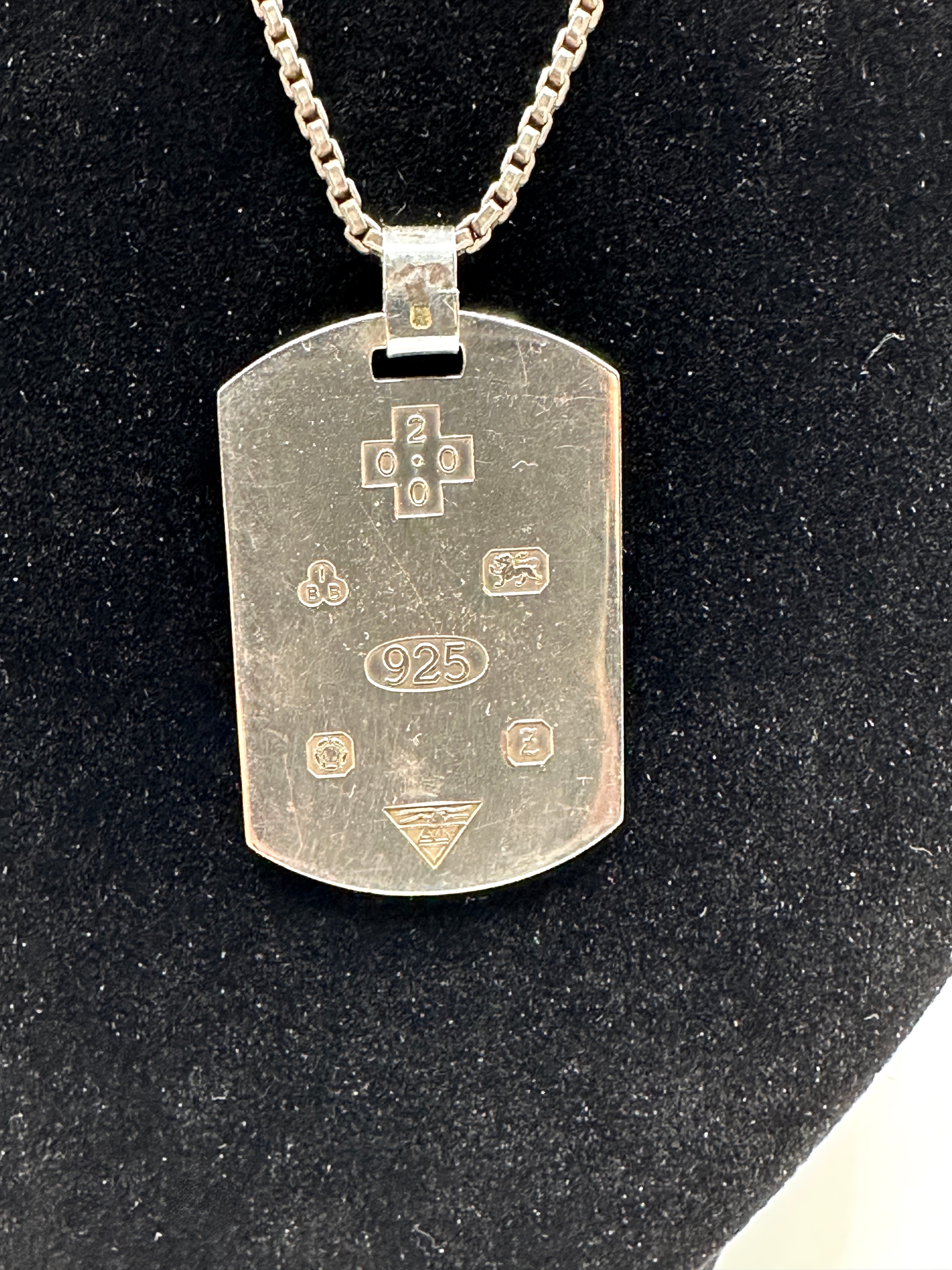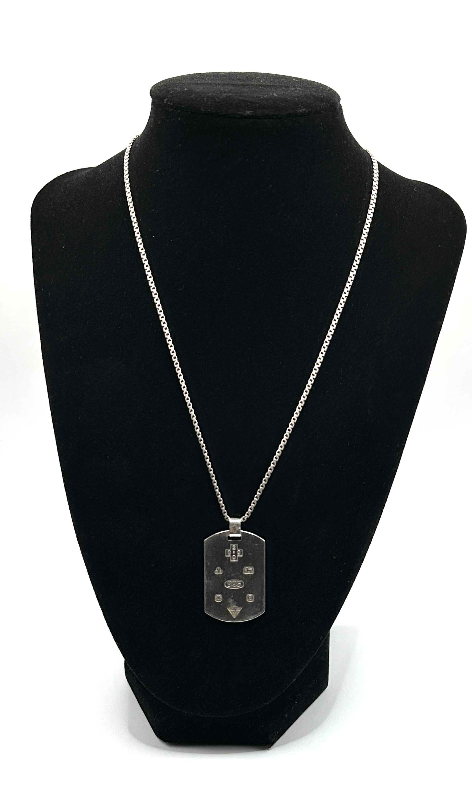 A contemporary necklace featuring a rectangular, dog tag-style pendant with rounded corners, suspended from a box chain. The piece is crafted from sterling silver, as indicated by the impressed hallmarks on the reverse of the pendant. These hallmarks include ‘925’ for sterling silver, a maker’s mark ‘BC’ within a circle, a lion passant, a crown, a date letter ‘Z’ in a shield, a cross-like motif containing ‘200’, and a triangular mark.