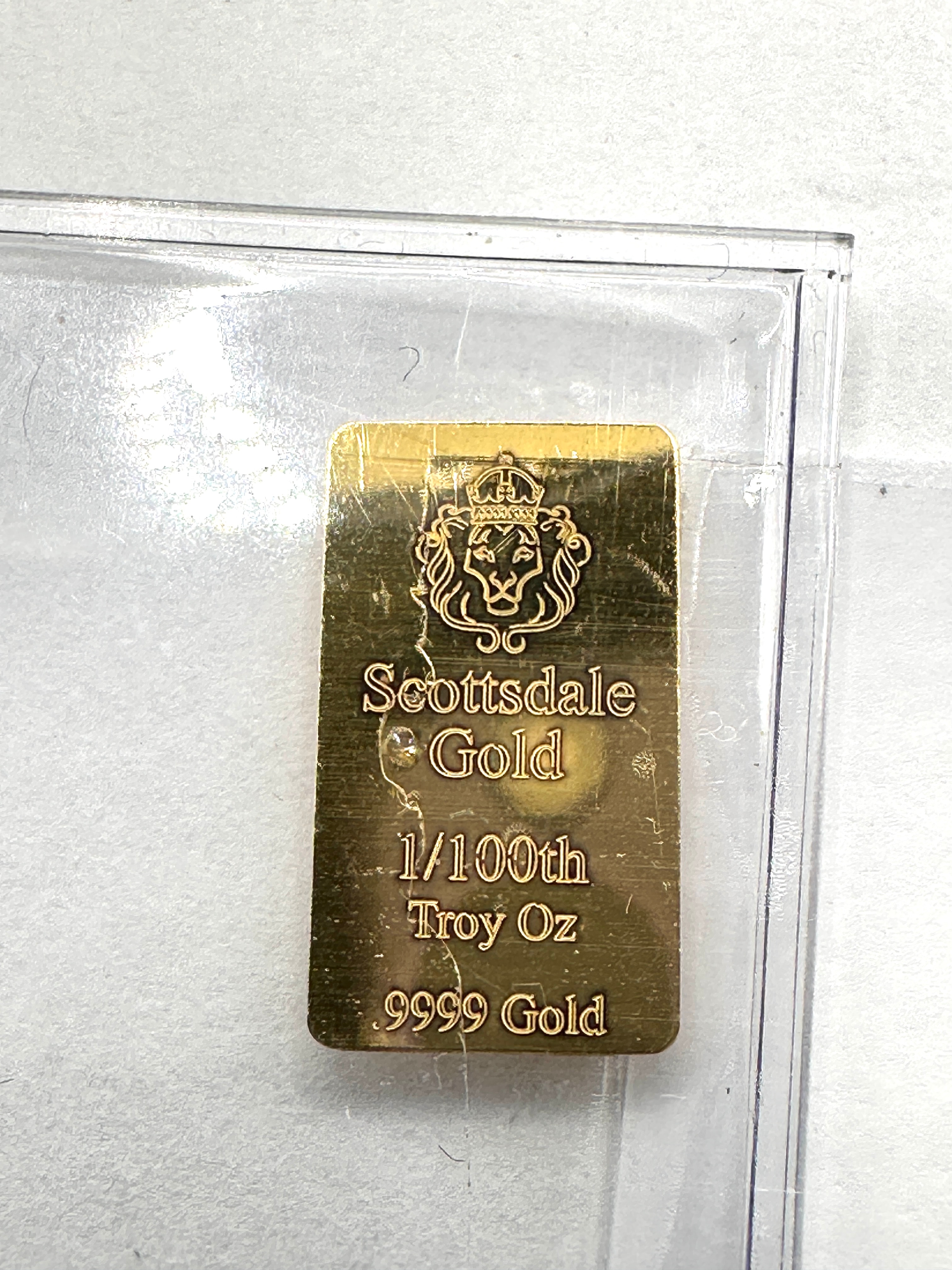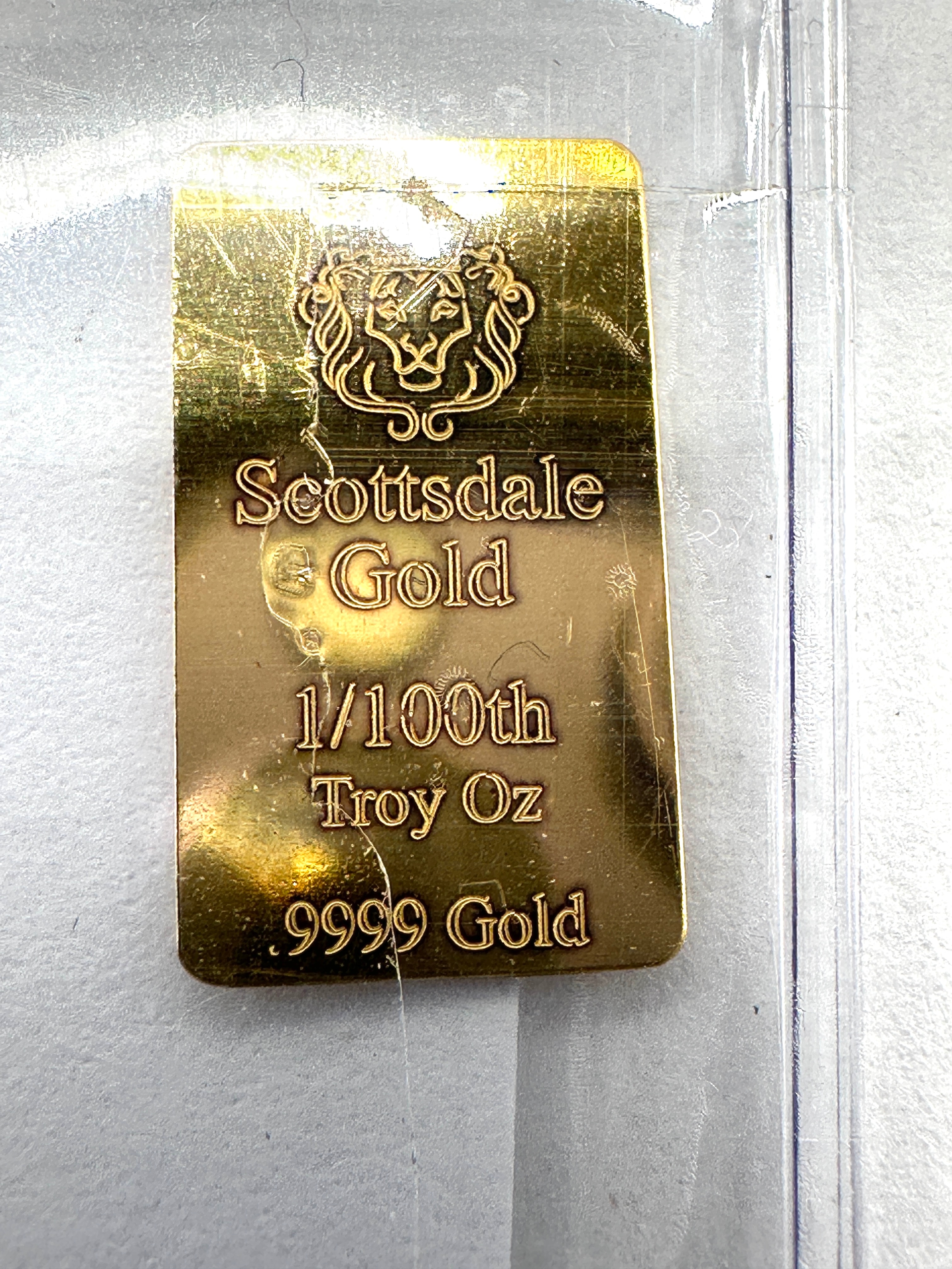 A pair of Scottsdale Mint 1/100 Troy Oz .9999 Fine Gold Bullion Bars. Each rectangular bar features a stylized lion’s head emblem above the text “Scottsdale Gold”, followed by “1/100th Troy Oz” and “.9999 Gold”. The items are presented within a clear, bi-fold plastic protective holder and are consistent with modern bullion precious metal products.
