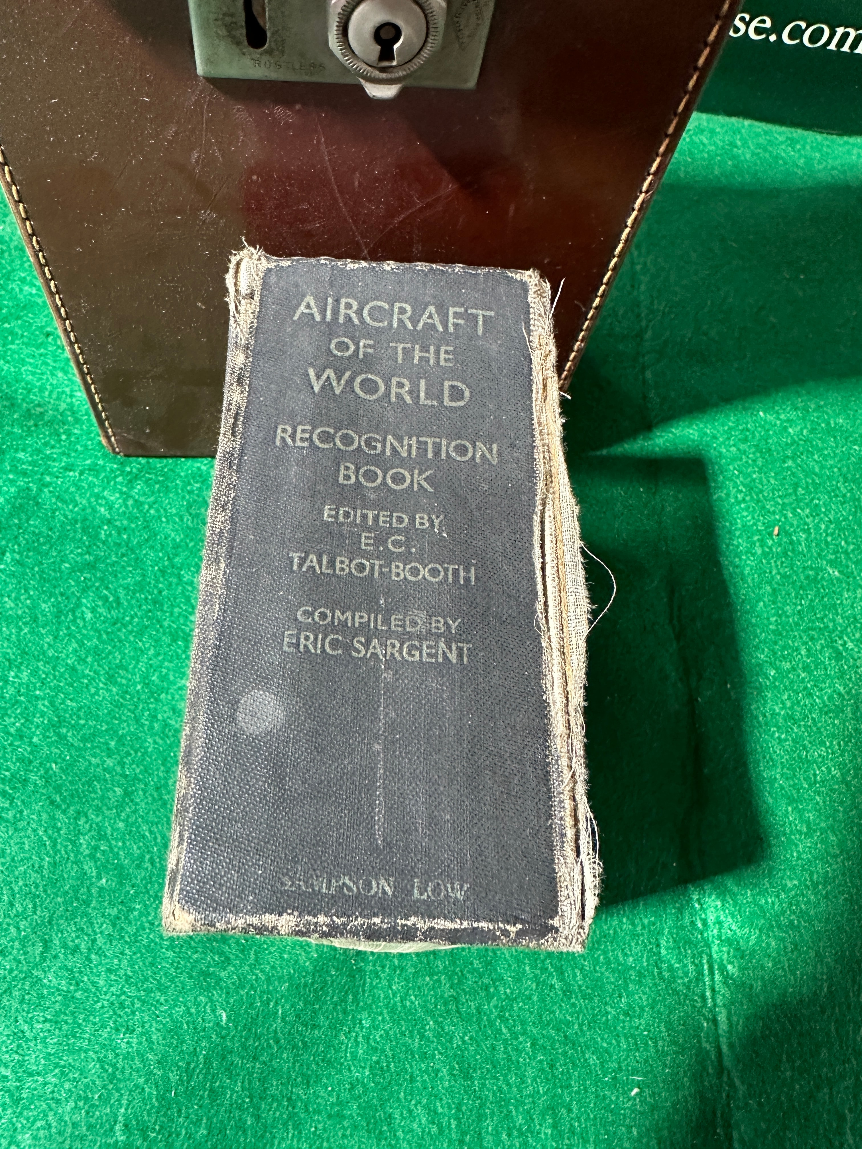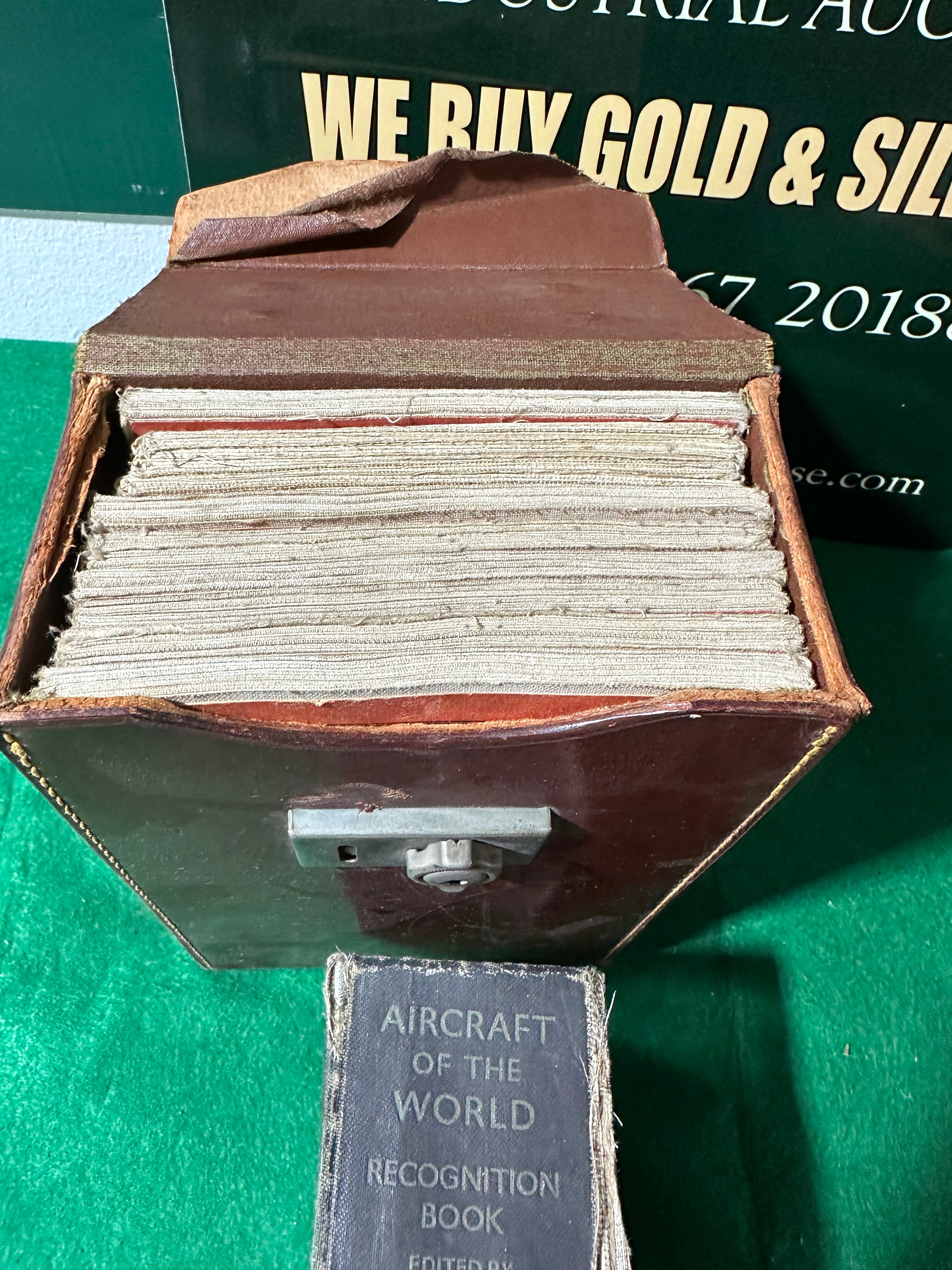 An antique leather-cased set of Firestone Mileage Maps for England & Wales, dating to approximately 1910. The vintage brown leather upright case features a hinged lid secured by a metal clasp and keyhole. It is embossed with “Firestone MILEAGE MAP” and “MADE IN ENGLAND”. The case contains a collection of folded paper maps. Accompanying the case is a small, cloth-bound book titled “AIRCRAFT OF THE WORLD RECOGNITION BOOK”, edited by E.C. Talbot-Booth, compiled by Eric Sargent, and published by Sampson Low.