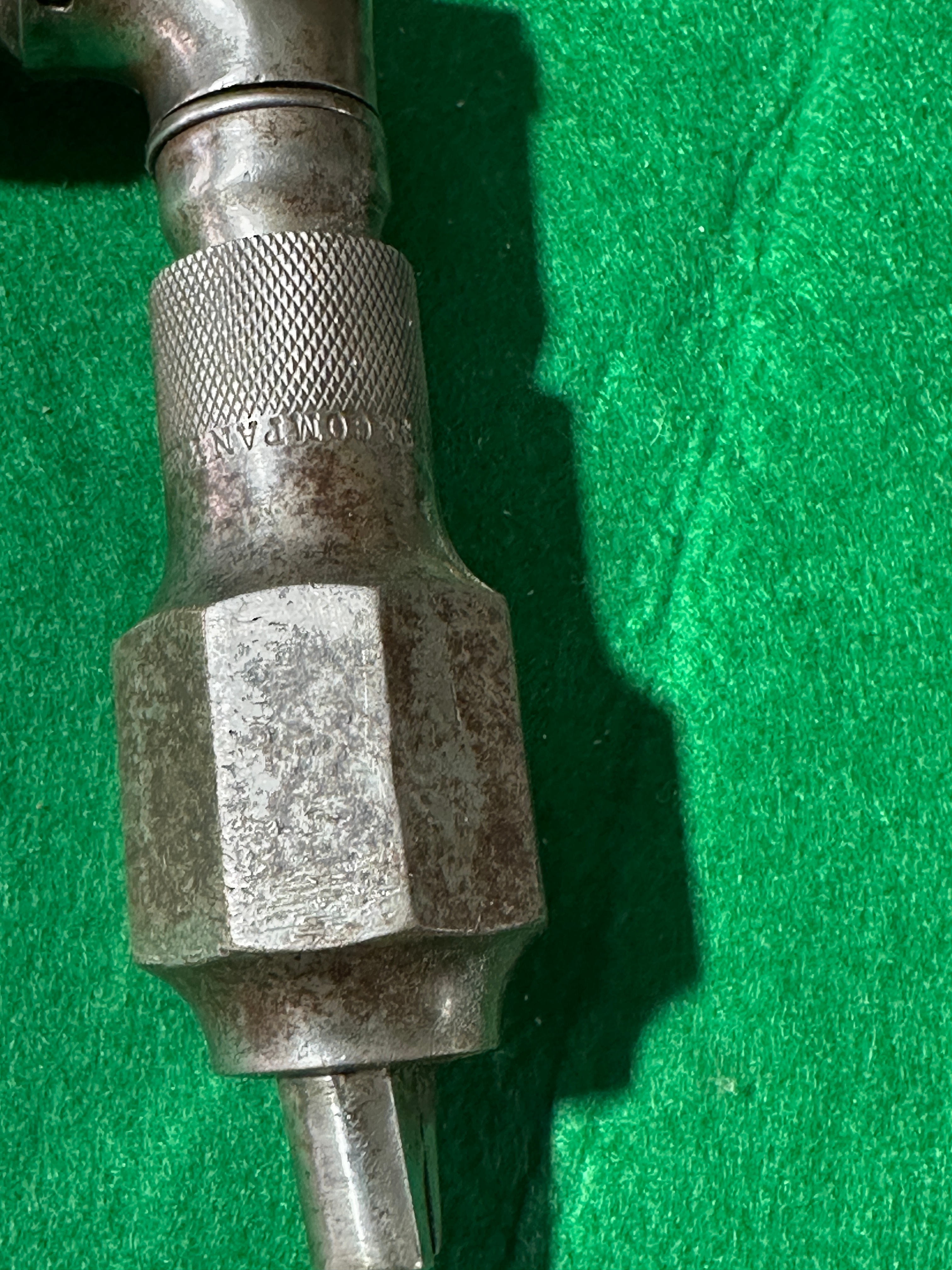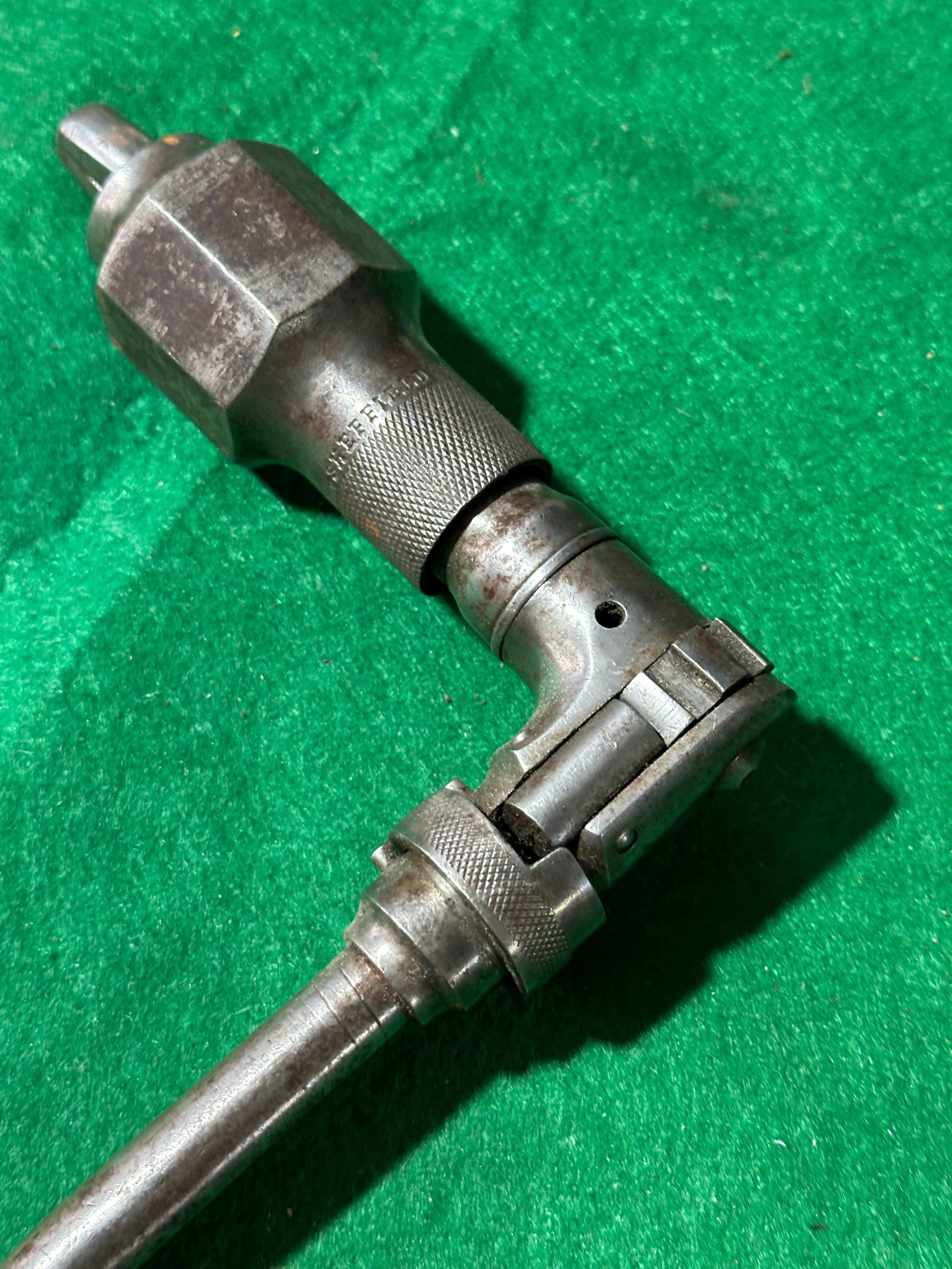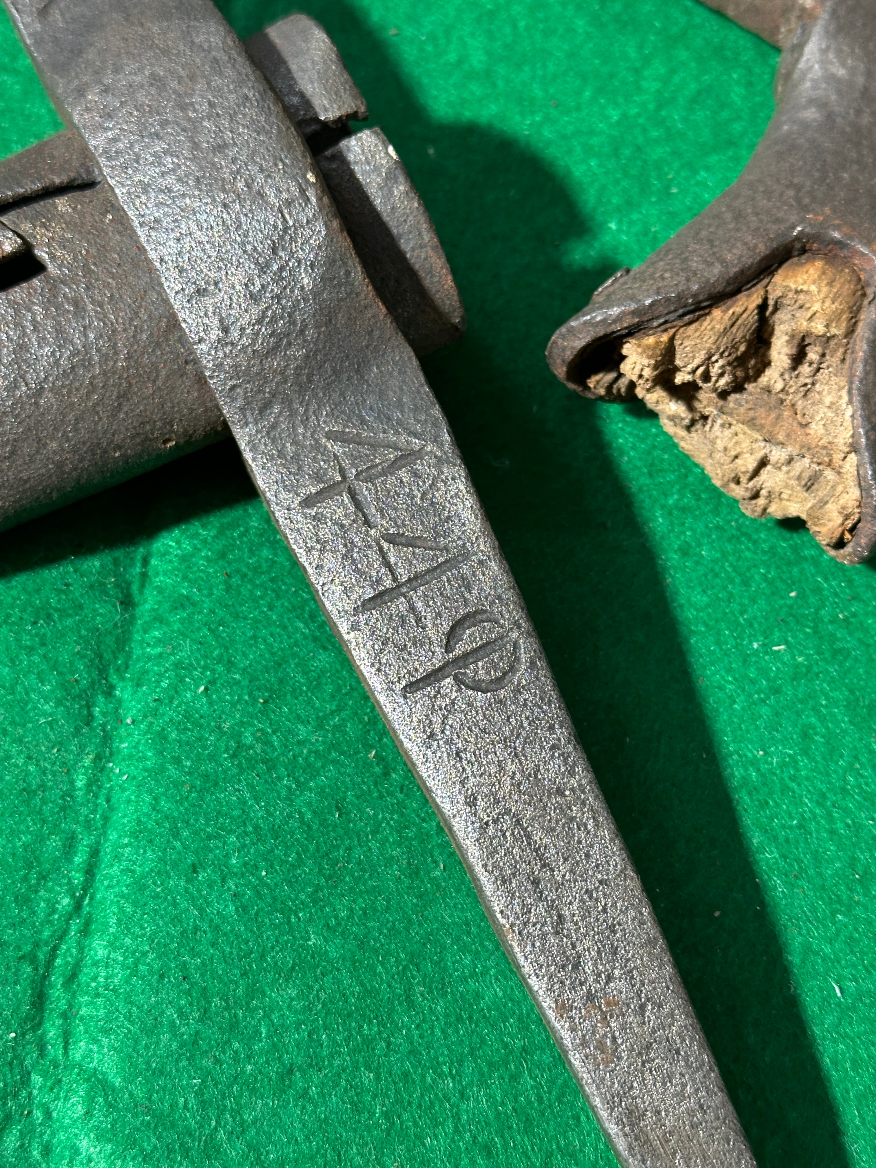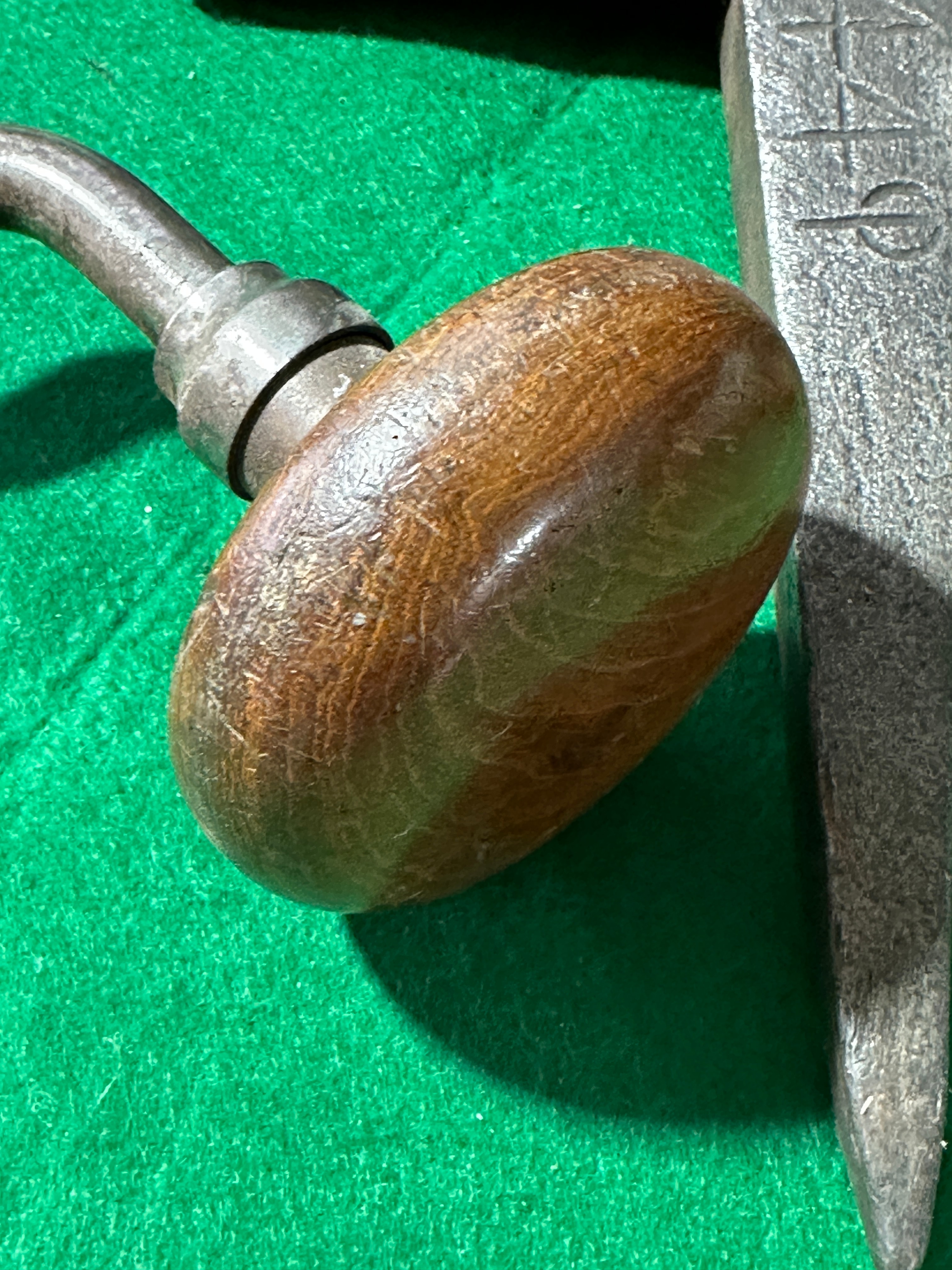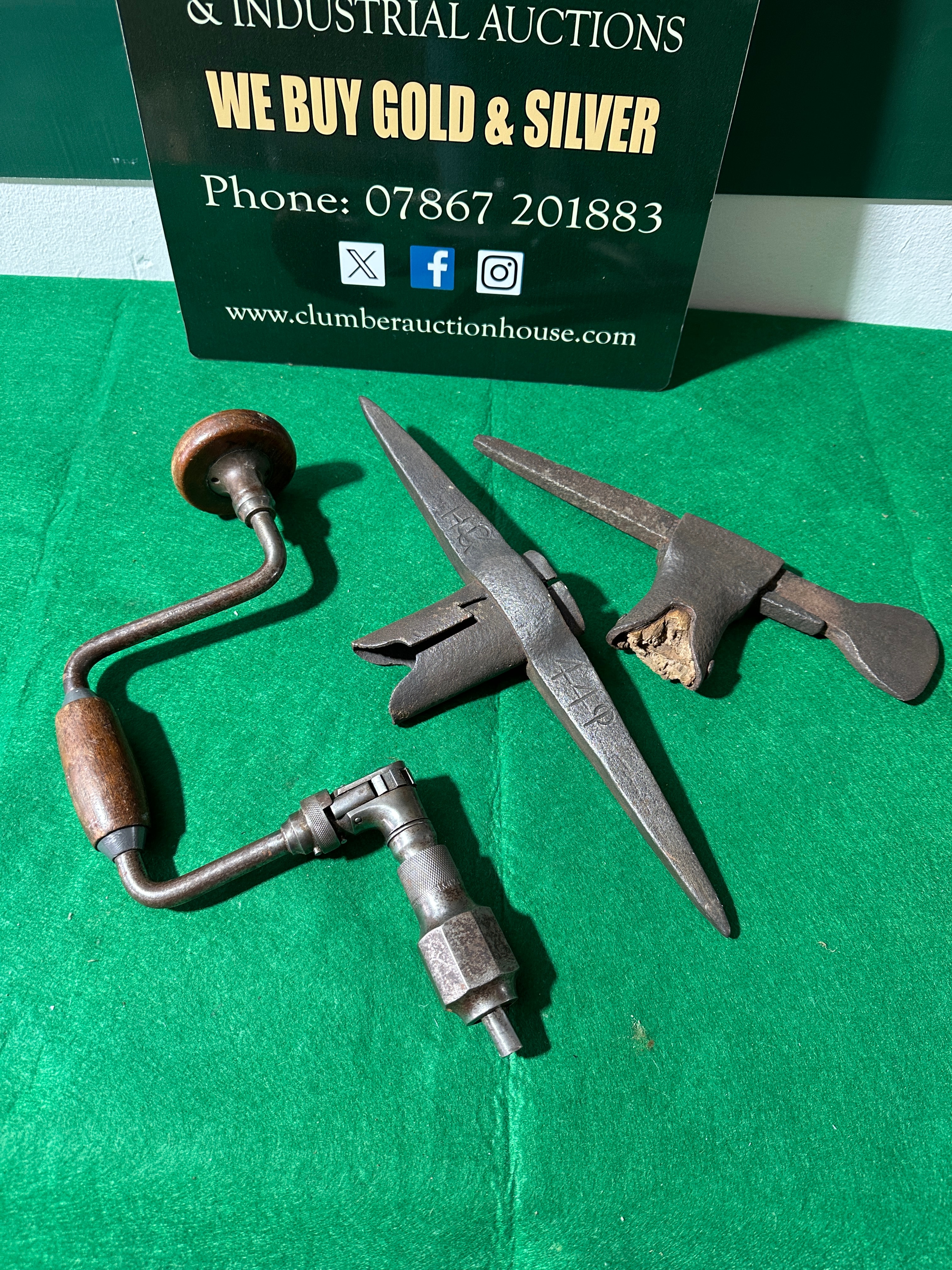 This lot comprises three antique hand tools. The primary item is a carpenter’s brace, marked ‘COMPAN’ and ‘SHEFFIELD’ on its metal chuck, featuring a rotating wooden top handle and a fixed wooden body handle. Also included is a forged metal anvil tool, exhibiting stamped or etched characters ‘A4P’ on its broad, tapering blade. The third item is a forged metal hammer or small pick.