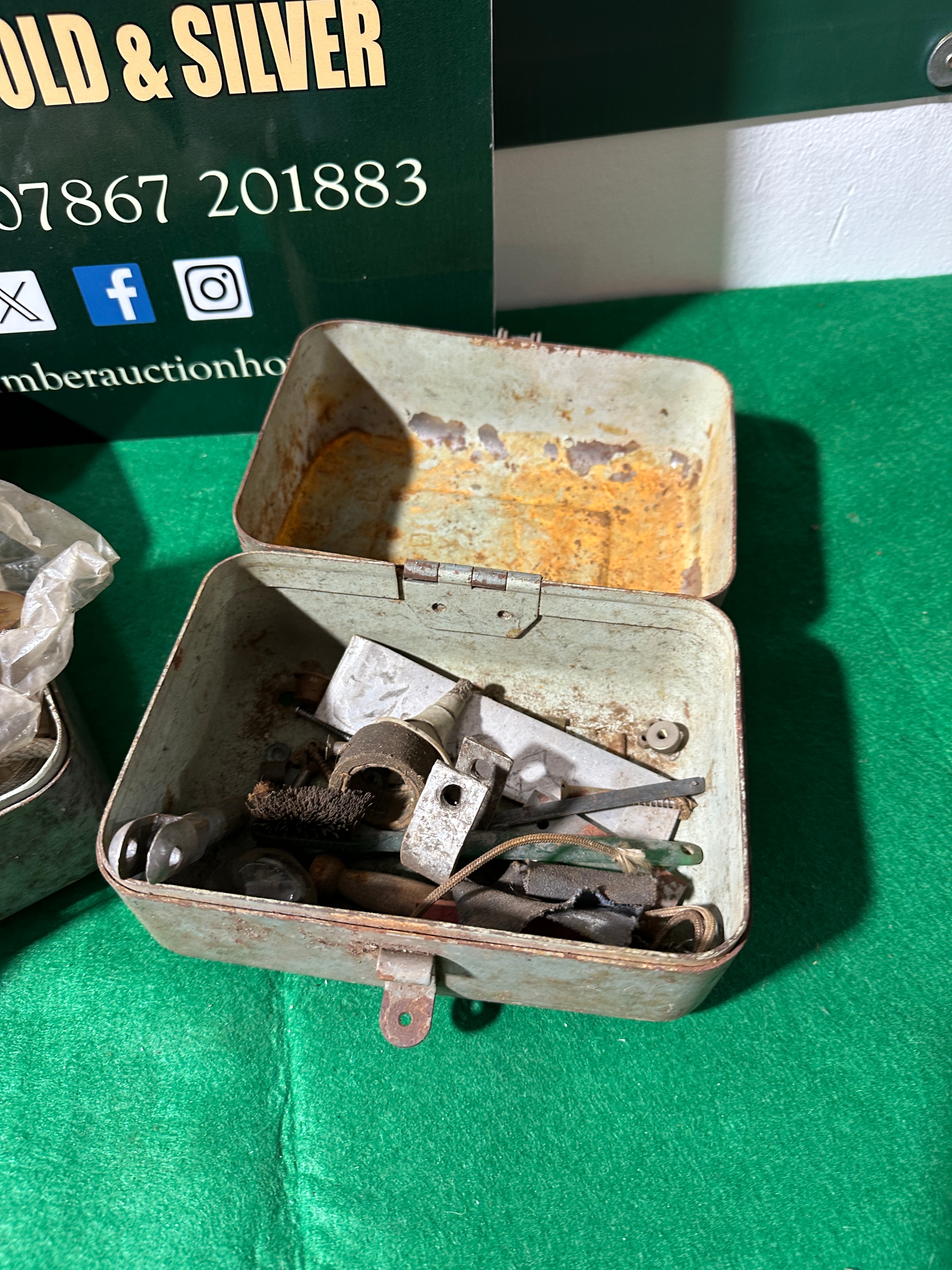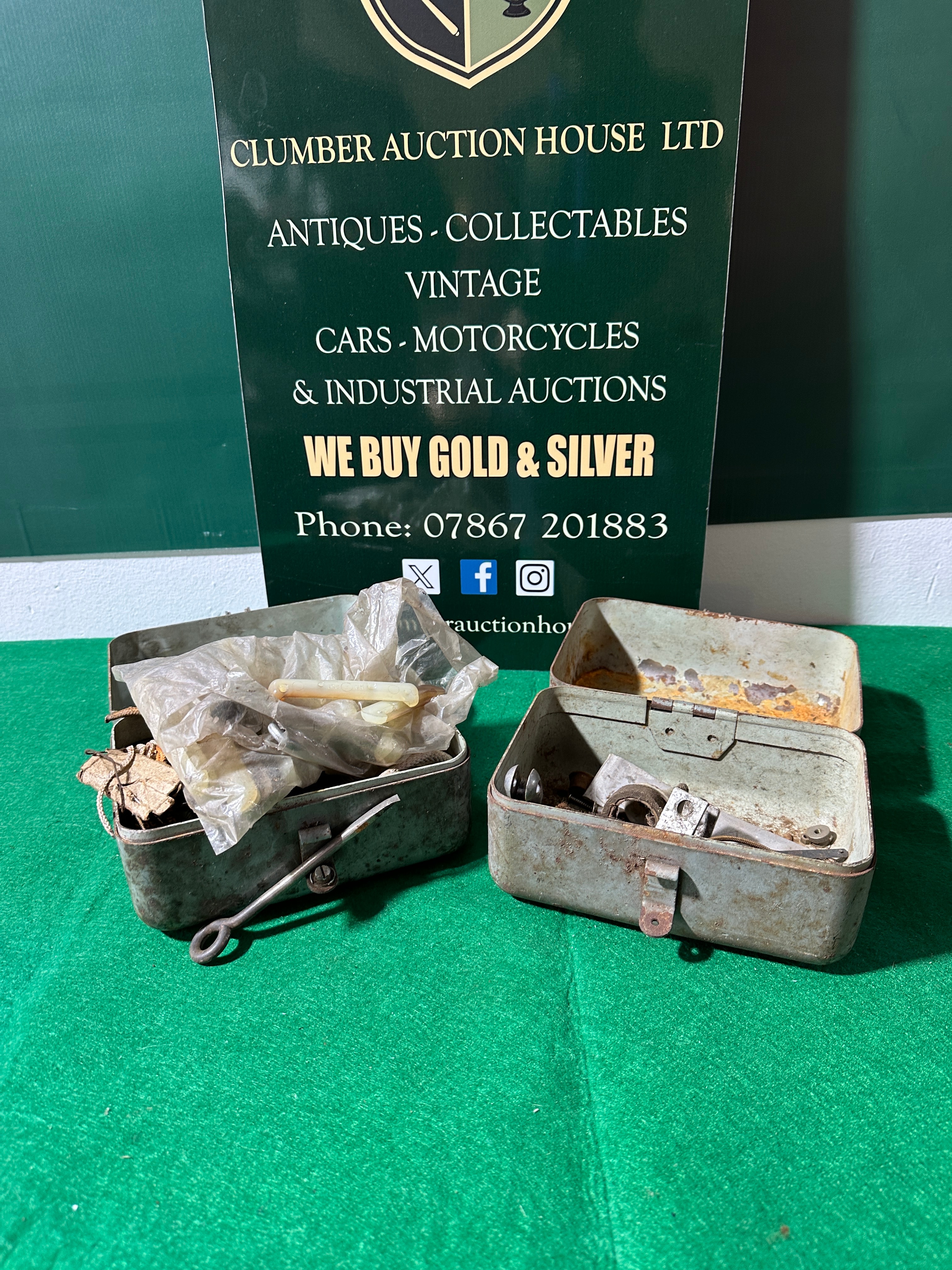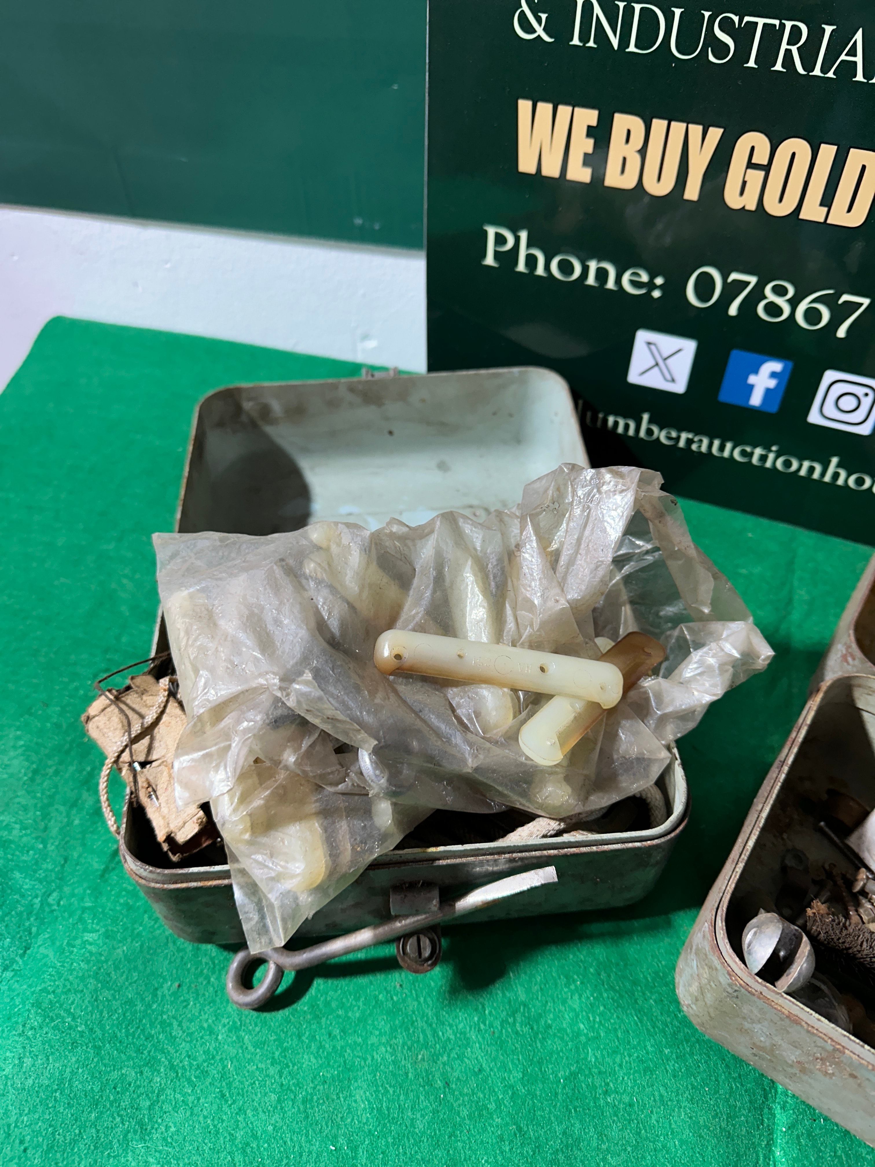 A pair of rectangular, hinged metal boxes, likely constructed from painted steel or tin. Each box is fitted with a simple latch closure. One box is partially open, containing various small items, including several off-white, rod-like components wrapped in a clear plastic bag, alongside other miscellaneous pieces. The second box is fully open, revealing a collection of small, utilitarian components made of metal, rubber, and possibly other materials, loosely arranged inside. No specific manufacturer’s marks or identifying text are visible on the boxes or their contents. The overall style suggests a utilitarian, possibly industrial or military, purpose.