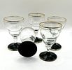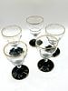 This lot comprises a set of five stemmed glasses, each featuring a clear glass bowl with a wide, shallow profile, joined to an opaque black glass stem and circular base. Each glass is accented with a gold-tone band encircling both the rim of the bowl and the outer edge of the base. The design, characterized by its contrasting materials and metallic accents, suggests a mid-20th century aesthetic. Faint, raised designs, possibly a stylized initial or crest, are visible on the black bases, but no discernible text or manufacturer markings are present.