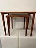 A set of two Danish Modern nesting tables, designed by E.W. Bach. Crafted from a reddish-brown wood, consistent with teak or a similar tropical hardwood. The larger table features a rectangular top, while the smaller, squarer table nests beneath it. Both tables exhibit clean lines, subtly curved aprons, and slender tapered round legs.