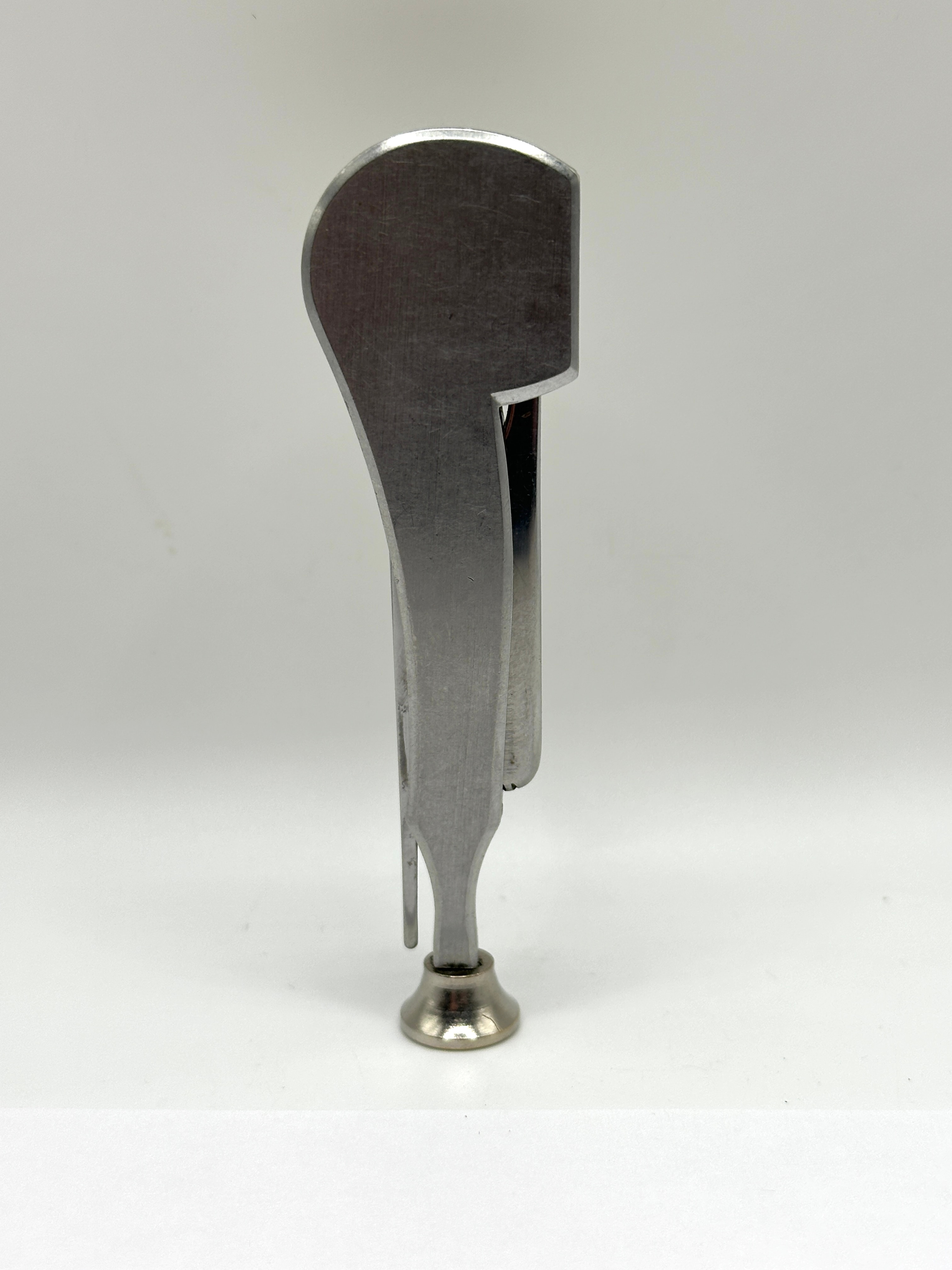 A modern stainless steel pipe tool, designed for cleaning, tamping, and picking. This compact, foldable multi-tool features a brushed silver-tone metallic finish. It incorporates a flat, shovel-like tool, a slender pointed pick, and a rounded tamper at one end. A faint, partially legible inscription, possibly ‘STAINLESS,’ is visible on the pick tool.